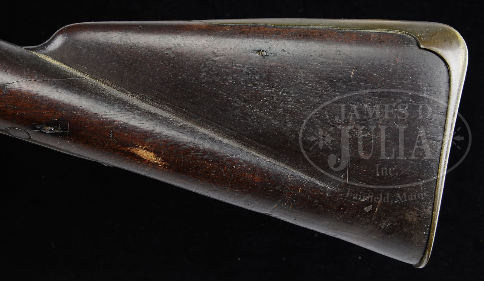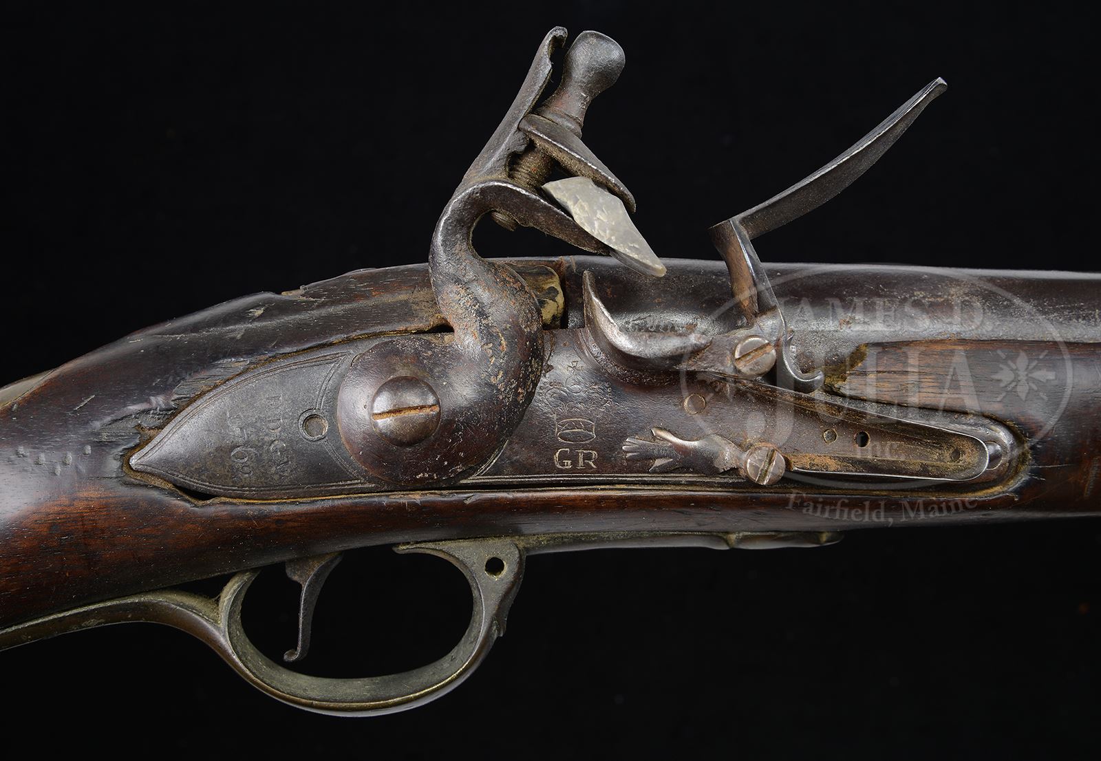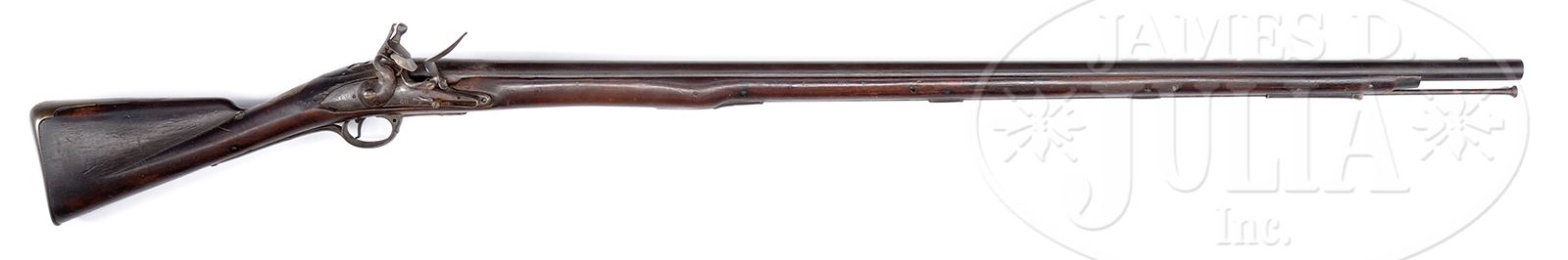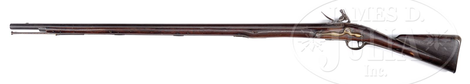 FIRST MODEL BROWN BESS MUSKET, LONG LAND PATTERN DATED 1762.SN NSN. Cal. .75, This is standard 46″ bbl long land pattern musket used by both American and British during the Revolutionary War. This gun appears mostly original with standard brass mounted features including 6-1/4″ raised side plate, “edge 1762” dated lock plate, “GR” cipher with Crown. Buttplate has “1780” added with pointal markings and initials “HSK” done similarly in thumb plate. Gun appears to be original flint, with correct ramrod. First model Bess’s in original configuration are difficult to find even with restoration as noted below. CONDITION: Gun appears original and matching, there is a contemporary iron pin repair to wrist, thumb plate is bent and appears re-seated. Lock plate has some wallowing. Butt patinas match. Gun overall has a dark brown/gray patina with scattered areas of pitting especially around lock and breech. Sling swivels are missing. Lock and frizzen are working. When viewing bore which is fairly smooth there is a concentric rusted line just over 12″ into bore, which appears to be a weld in bbl, noting that this bbl has been stretched about one foot, repair is excellent and almost undetectable externally. The stock too is also stretched just below this point and again the restoration is excellent. 49254-37 JS (7,500-10,500) – Lot 3449