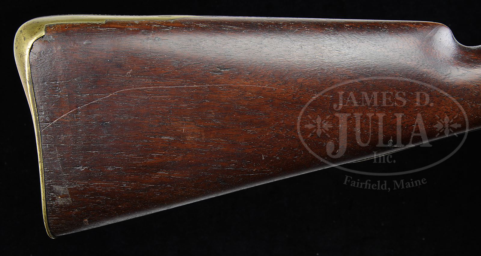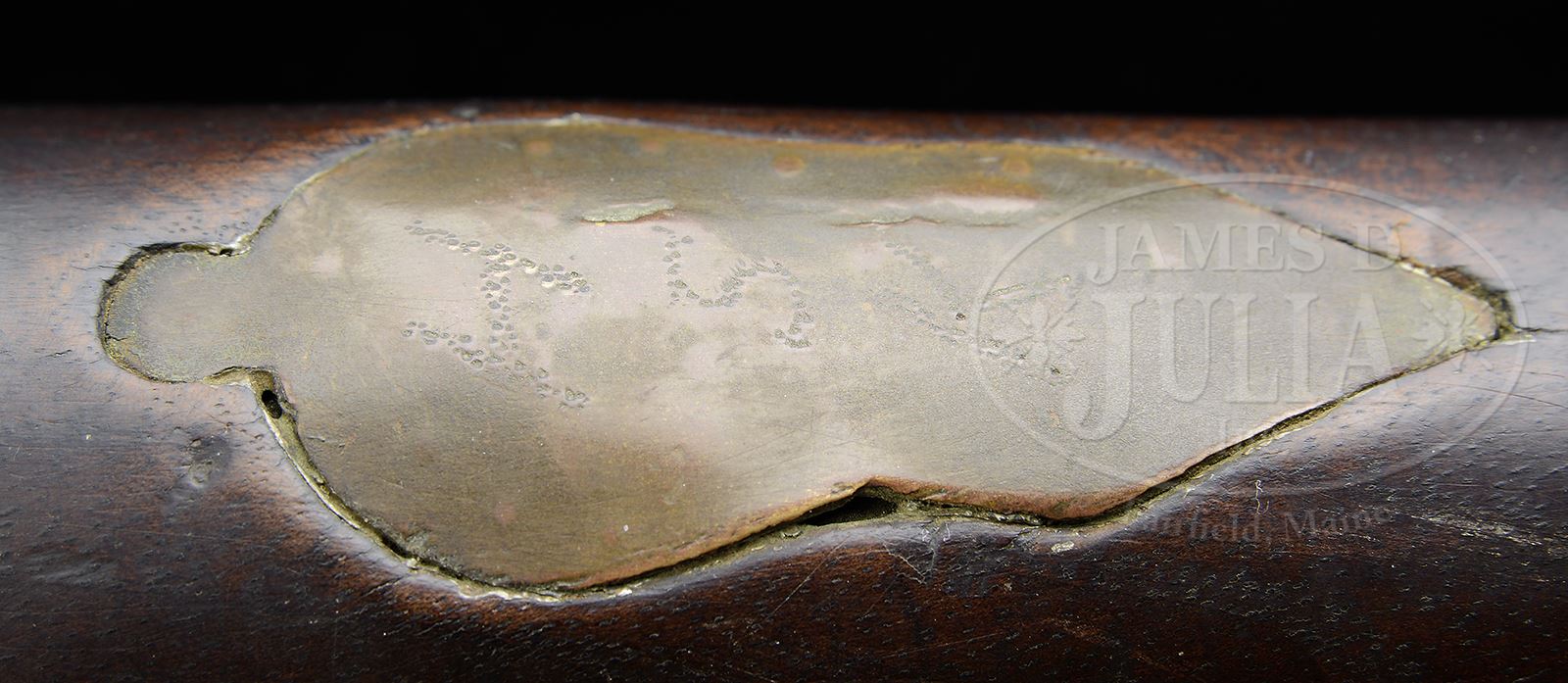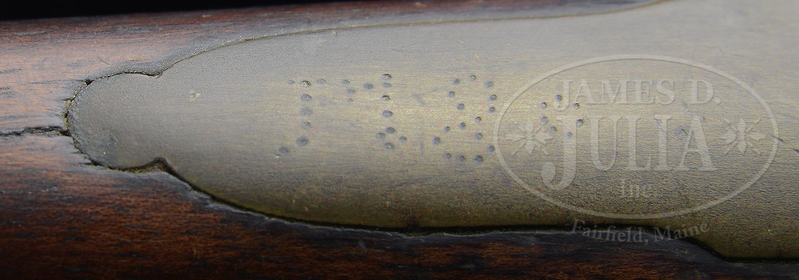 FIRST MODEL BROWN BESS MUSKET, LONG LAND PATTERN DATED 1762.SN NSN. Cal. .75, This is standard 46″ bbl long land pattern musket used by both American and British during the Revolutionary War. This gun appears mostly original with standard brass mounted features including 6-1/4″ raised side plate, “edge 1762” dated lock plate, “GR” cipher with Crown. Buttplate has “1780” added with pointal markings and initials “HSK” done similarly in thumb plate. Gun appears to be original flint, with correct ramrod. First model Bess’s in original configuration are difficult to find even with restoration as noted below. CONDITION: Gun appears original and matching, there is a contemporary iron pin repair to wrist, thumb plate is bent and appears re-seated. Lock plate has some wallowing. Butt patinas match. Gun overall has a dark brown/gray patina with scattered areas of pitting especially around lock and breech. Sling swivels are missing. Lock and frizzen are working. When viewing bore which is fairly smooth there is a concentric rusted line just over 12″ into bore, which appears to be a weld in bbl, noting that this bbl has been stretched about one foot, repair is excellent and almost undetectable externally. The stock too is also stretched just below this point and again the restoration is excellent. 49254-37 JS (7,500-10,500) – Lot 3449