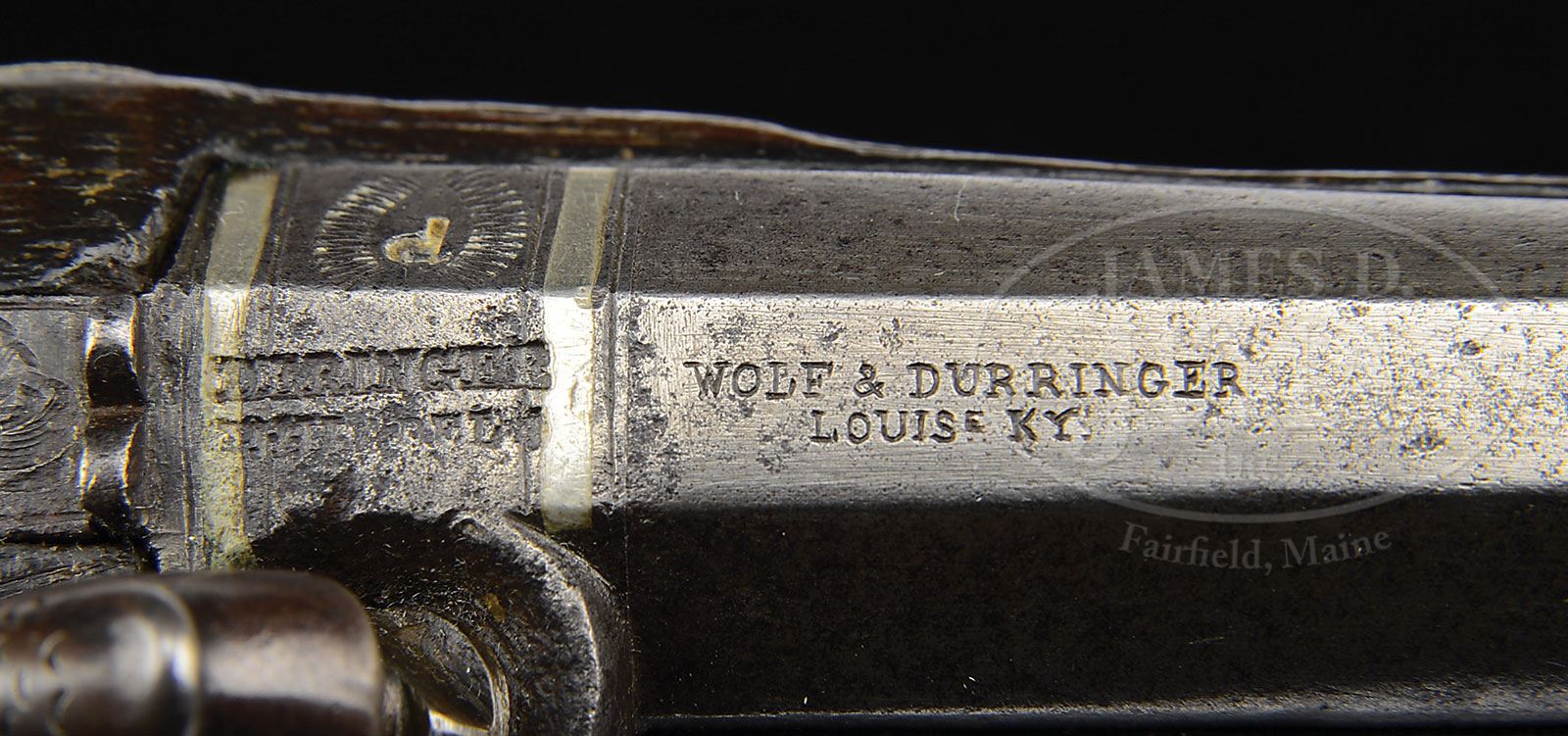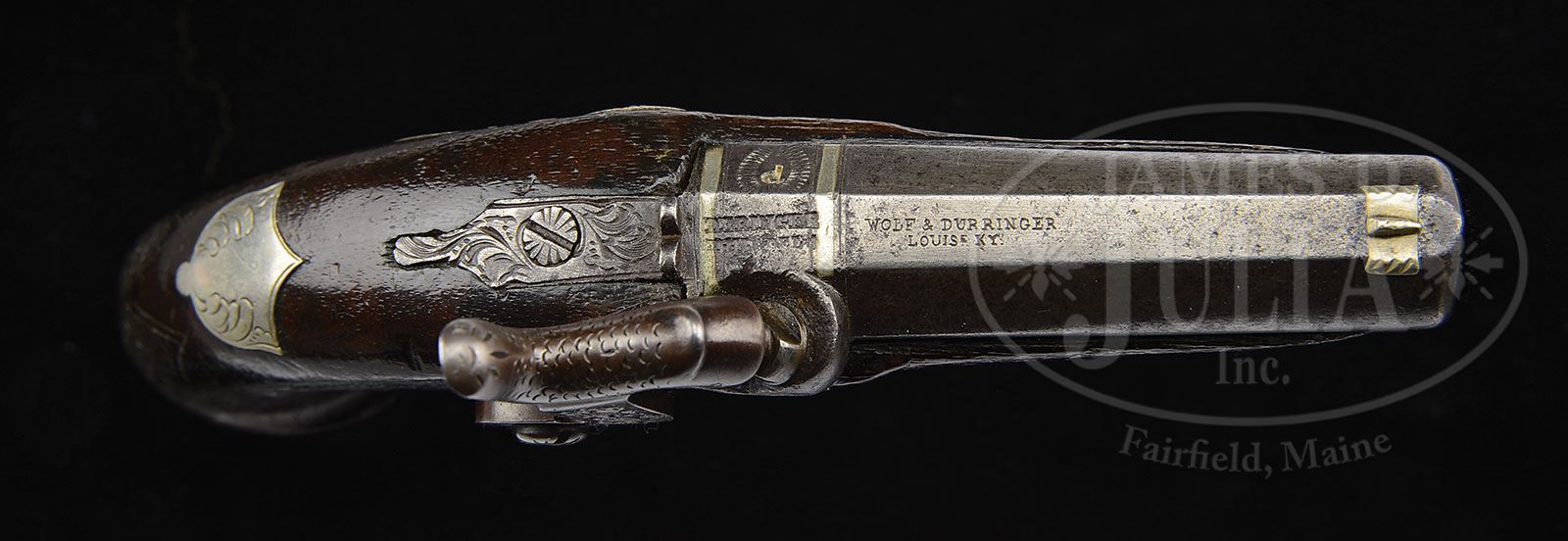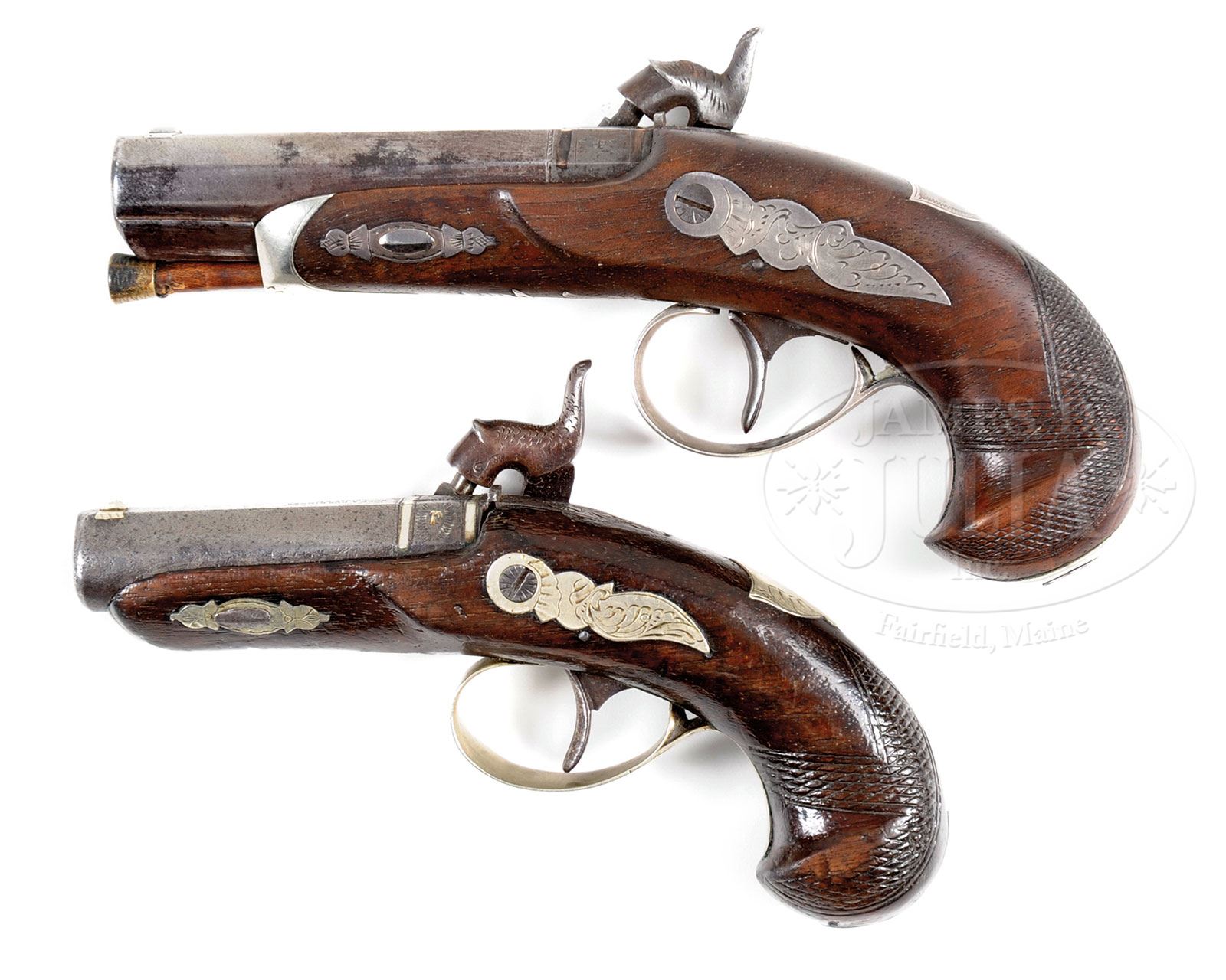DUO OF WOLF & DURRINGER AGENT MARKED HENRY DERINGER PISTOLS.SN NSN. This lot contains two Henry Deringer agent marked pistols. The first is quite fine measuring just under 7″, silver mounted with two silver bands in breech. Bbl measures 3″ and 3-9/16″ with breech. Bbl is correctly marked “WOLF & DURRINGER/LOUISe KY/AGENTS”. Breech and lock both marked “DERINGER/PHILADEL’A”. This gun is in fine condition retaining some of its orig brown finish, good engraving and sound varnished stock. There are even percussion caps found in trap in German silver buttcap. Second gun in this duo measures about 5-3/4″, with 2-3/8″ bbl, measuring 2-3/4″ with breech. This gun is German silver mounted and has a engraved bbl marking which is not the proper Henry Deringer style. Regardless the silver mounted large deringer in this grouping is quite fine and it is to be noted that there is a fine pair of Wolf & Durringer pistols that belonged to Buffalo Bill which are shown on p.31 of Eberhart & Wilson The Deringer in America Vol. 1. PROVENANCE: Collection of John Montague. CONDITION: Gun one is very good to fine with crisp original markings, some thin orig brown on bbl. Other iron surfaces are dark gray with light pitting. The two silver bands in breech are tarnished exposing their copper bases. Silver trigger guard and escutcheons are solid with good engraving. There is a “1” stamped in back of trigger guard occasionally seen on some agent marked guns, probably denoting 1 of a pair. German silver nosecap and buttcap are well fit as are other parts of gun into sound and solid stock that exhibits about 30% varnish especially in protected areas. Second gun in this group which is German silver mounted is good to very good overall with cleaned metal surfaces though markings including the engraved bbl address are quite discernible. Gun appears complete though hammer is possible replacement as its color is dissimilar to rest of gun. Cone is replaced, wood is refinished with a newer applied varnish. 4-54322 JS182 (6,000-8,000) – Lot 3450