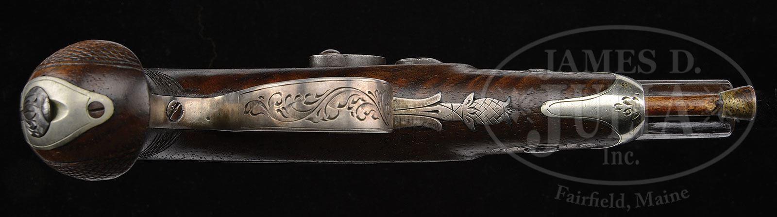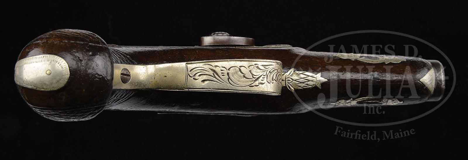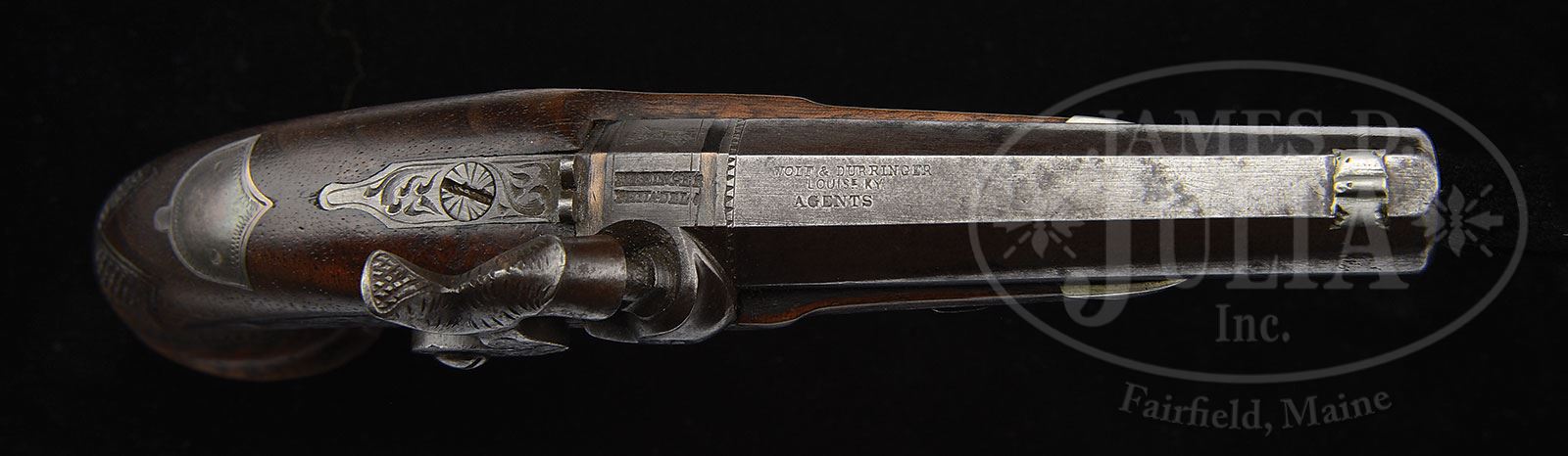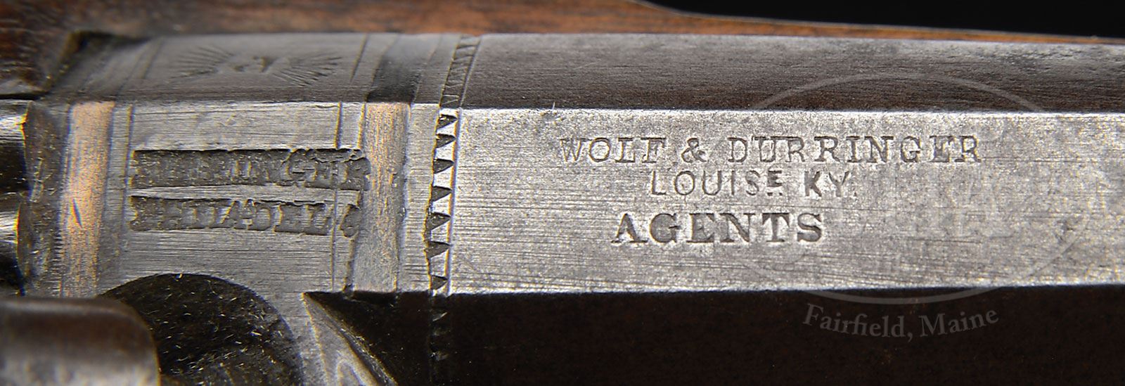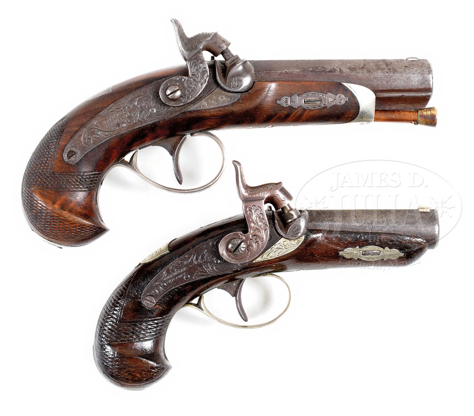 DUO OF WOLF & DURRINGER AGENT MARKED HENRY DERINGER PISTOLS.SN NSN. This lot contains two Henry Deringer agent marked pistols. The first is quite fine measuring just under 7″, silver mounted with two silver bands in breech. Bbl measures 3″ and 3-9/16″ with breech. Bbl is correctly marked “WOLF & DURRINGER/LOUISe KY/AGENTS”. Breech and lock both marked “DERINGER/PHILADEL’A”. This gun is in fine condition retaining some of its orig brown finish, good engraving and sound varnished stock. There are even percussion caps found in trap in German silver buttcap. Second gun in this duo measures about 5-3/4″, with 2-3/8″ bbl, measuring 2-3/4″ with breech. This gun is German silver mounted and has a engraved bbl marking which is not the proper Henry Deringer style. Regardless the silver mounted large deringer in this grouping is quite fine and it is to be noted that there is a fine pair of Wolf & Durringer pistols that belonged to Buffalo Bill which are shown on p.31 of Eberhart & Wilson The Deringer in America Vol. 1. PROVENANCE: Collection of John Montague. CONDITION: Gun one is very good to fine with crisp original markings, some thin orig brown on bbl. Other iron surfaces are dark gray with light pitting. The two silver bands in breech are tarnished exposing their copper bases. Silver trigger guard and escutcheons are solid with good engraving. There is a “1” stamped in back of trigger guard occasionally seen on some agent marked guns, probably denoting 1 of a pair. German silver nosecap and buttcap are well fit as are other parts of gun into sound and solid stock that exhibits about 30% varnish especially in protected areas. Second gun in this group which is German silver mounted is good to very good overall with cleaned metal surfaces though markings including the engraved bbl address are quite discernible. Gun appears complete though hammer is possible replacement as its color is dissimilar to rest of gun. Cone is replaced, wood is refinished with a newer applied varnish. 4-54322 JS182 (6,000-8,000) – Lot 3450