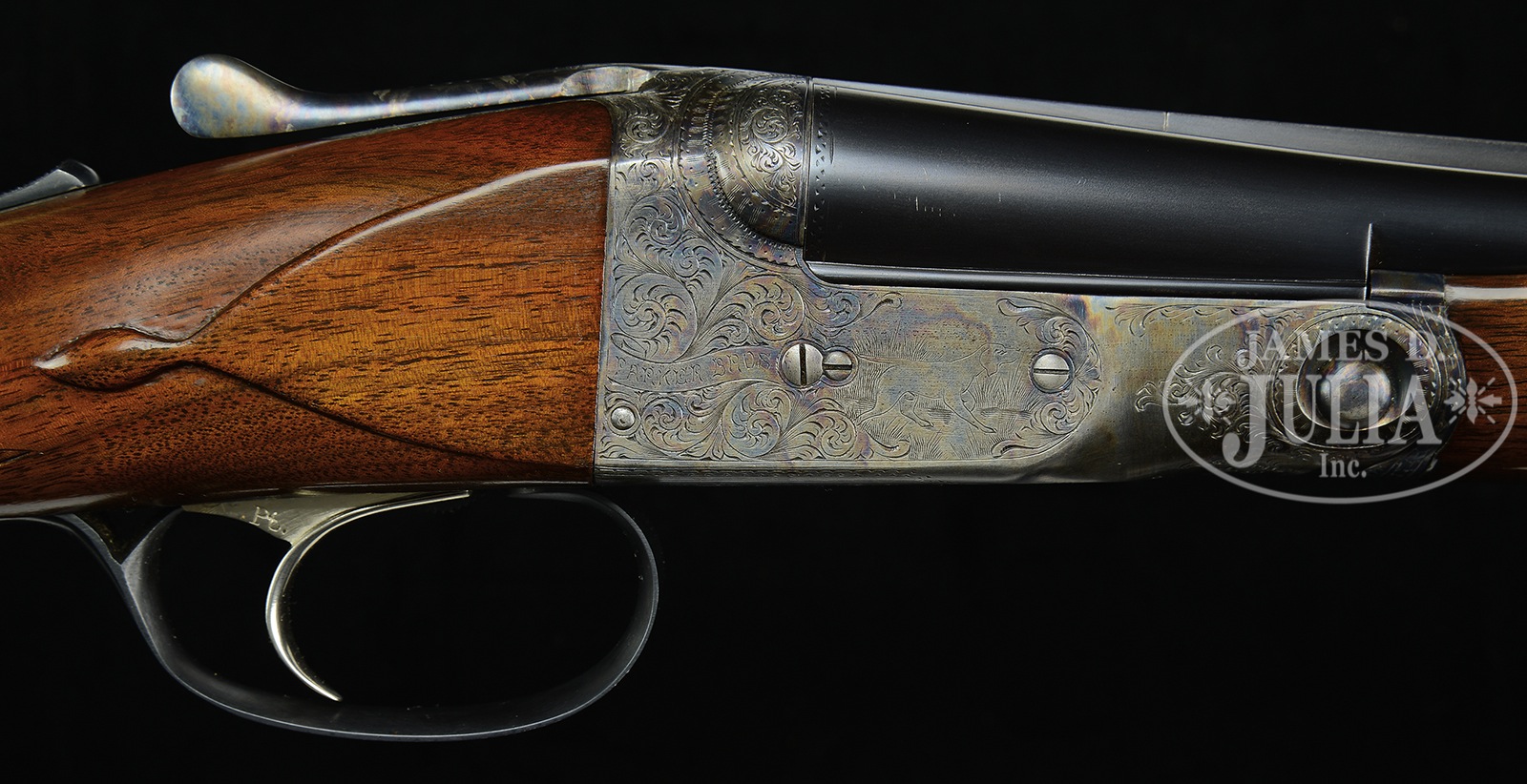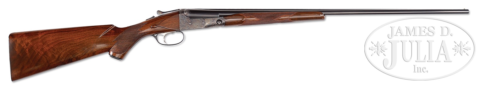 *RARE PARKER .410 “DHE” GAME GUN WITH BEAVERTAIL FOREND AND SINGLE TRIGGER.SN 235856. Cal. 410. 2-3/4″ Chambers. 000 Frame. 26″ Bbls are marked “PARKER BROS MAKERS, MERIDEN, CT. U.S.A. TITANIC STEEL” on slightly raised, matted game rib. Bbl flats are stamped with Parker proofs, grade, weight, and steel type (although “T” in a circle appears to have been obliterated). Case hardened action with all correct marks on water table, features non-automatic safety and single selective Parker trigger. Action is engraved in typical “D” style with 80% coverage varying sized scroll with geometric and small scroll borders surrounding scenes of setter on left, pointer on right, and group of four pheasant on trigger plate. “PARKER BROS” is on scrolled ribbon on each side of action. Scroll engraved trigger guard has SN on tang. Nicely crotch figured American walnut Parker Meriden capped pistol grip buttstock measures 14-3/8″ over skeleton steel buttplate. Typical lozenge shaped drop points are behind side panels, and point pattern checkering is at grip. A large vacant silver oval is on toe line. Matching beavertail ejector forend without reinforcing bolt, has typical latch, and patent date stamped on iron. Bore diameters at muzzles: left -.398, right – .400. Wall thickness: left – .035, right – .035. Drop at heel: 2-3/16″, drop at comb: 1-7/16″. Cast: Neutral. Weight: 6 lbs. 2 oz. LOP: 14-3/8″. This gun matches most specifications as listed in the PARKER GUN IDENTIFICATION AND SERIALIZATION ledger (beavertail forend and single trigger not specified). Twin ivory bead sights. PROVENANCE: Letter ? Special Note: This item(s) contains plant or animal properties that may be covered by the Endangered Species Act (ESA). We have taken care to ensure that this item(s) meets the standard for sale under the ESA. However, certain states and other countries have laws that are more restrictive than the ESA. It is the bidder’s responsibility to ensure that it is lawful to purchase or transport this item(s) into their state, and to obtain the necessary import and export approvals. Delay or failure to obtain any such permit or approval does not relieve the buyer of paying for the item(s) and consummating the purchase. CONDITION: Excellent, as refurbished, most likely by DelGrego, retaining essentially all fine custom finishes on wood and metal, with some light handling and assembly marks. Bores are excellent. Mechanically excellent. A very scarce gun; THE PARKER STORY estimates 59 made with 26″ bbls. 50607-1 MGM199 (35,000-55,000) IVORY – Lot 3450