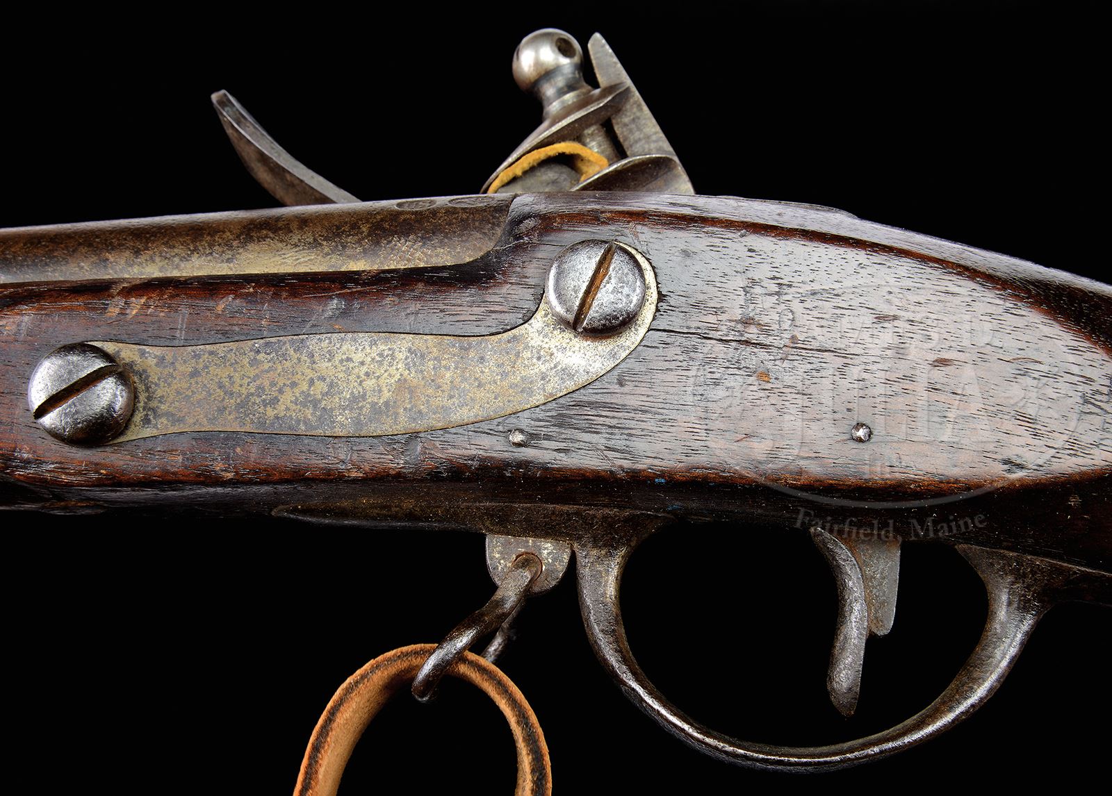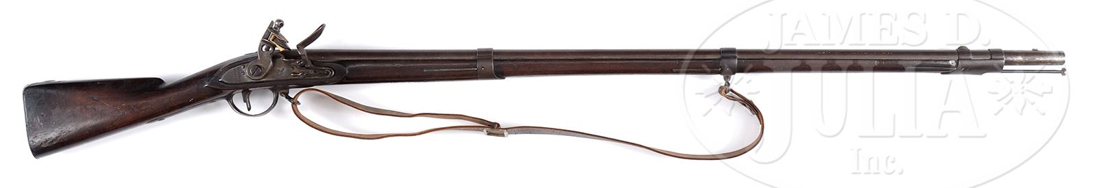VERY RARE 1812 DATED HARPER’S FERRY MUSKET WITH “52ND REGT” VIRGINIA BRAND.SN NSN. Cal. 69. This rare example of an 1812 dated Model 1795 Harper’s Ferry musket appears “as found” with fine patina and a brand not noted before “52D REGT” on bottom of stock just forward of lock. Giles Cromwell in his text on Virginia Manufacturing states the 52nd Virginia Regiment had troops from Williamsburg and Charles City. This musket measures 58-1/4″ overall with a 43-1/2″ bbl. This gun has seen honest use but is still sound and solid and in orig flint configuration. Touch hole has an armory re-bushing showing long use of this firearm. Inspector cartouche “V/MH” is found on stock flat opposite lock. Bbl proofs of “US” in oval cartouche and eagle head over “P” are found on bbl breech. War of 1812 regimentally marked arms are quite rare and this is a unique survivor from Virginia. CONDITION: Gun is good overall. Appears complete and orig with exception of added ramrod. Metal surfaces are brown/grey. Markings are all discernible as seen in photographs. There are areas of pitting, especially at breech, trigger guard & buttplate. Cocking mechanism is very tight and functions. Smooth pitted bore. Stock is sound & solid with hand worn patina, numerous small storage dings, dents, scratches & bruises, inspector cartouche well defined. Accompanying leather sling with brass mounts is very good though of unknown origin. 49613-11 JS (6,500-8,500) – Lot 3452