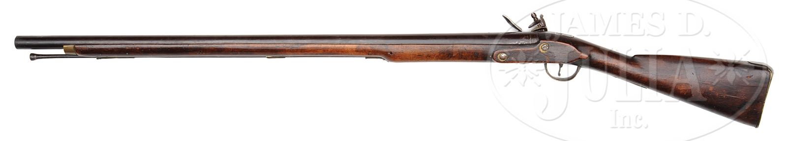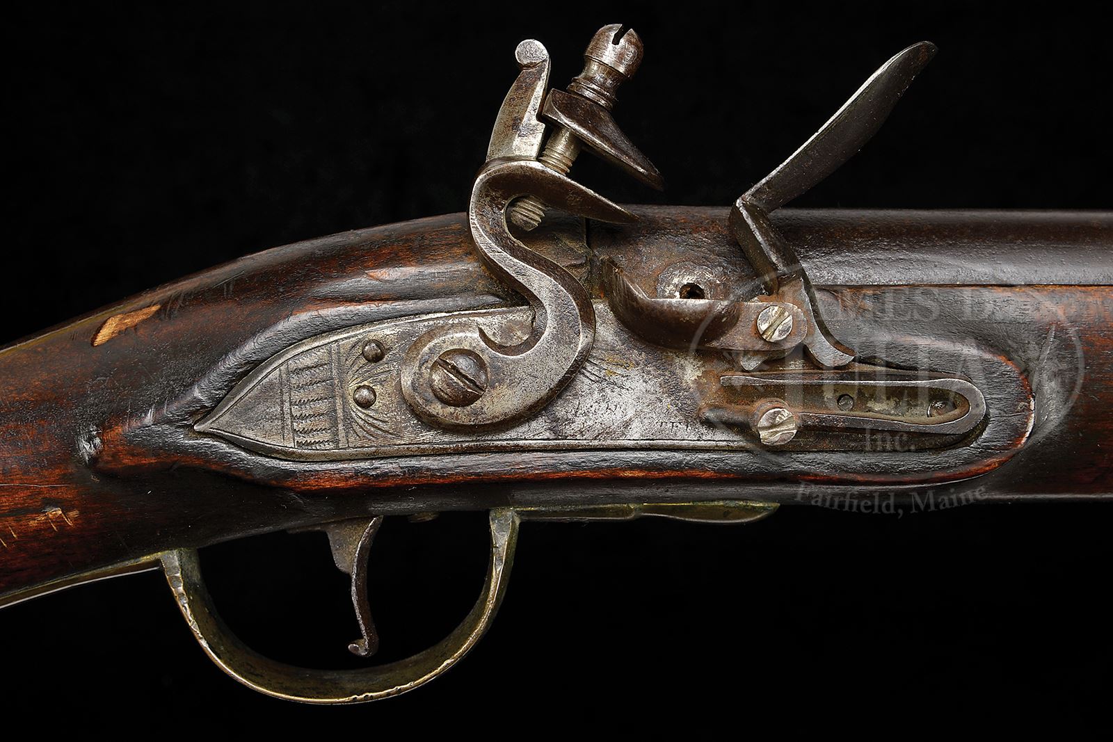 ASSEMBLED MILITIA MUSKET.SN NSN. .85 Cal. x 34-3/4″ bbl with remnants of British markings at breech. Bayonet lug removed and bbl has been reconverted. There are no provisions for either sling swivel. The ramrod is old and may be orig. 5-1/4″ imported English lock with an undecipherable makers name over what remains of “Warranted” under the pan. Balance of lock plate nicely engraved. 46-1/2″ long stock is unmarked. Brass furniture consists of nose band, 3-ramrod pipes, trigger guard, buttplate with short tang and two 3/4″ dia. circular side plate washers. PROVENANCE: Collection of Dr. Douglas Sirkin. CONDITION: Bbl and lock show nice age patina with heavy pitting around touch hole area. Brass furniture shows its age but is in overall very good condition. Walnut stock has no splits or cracks, only a few nicks and scratches from handling over the years. 43018-210 PAS27 (800-1,600) – Lot 3457 Click here to view provenance