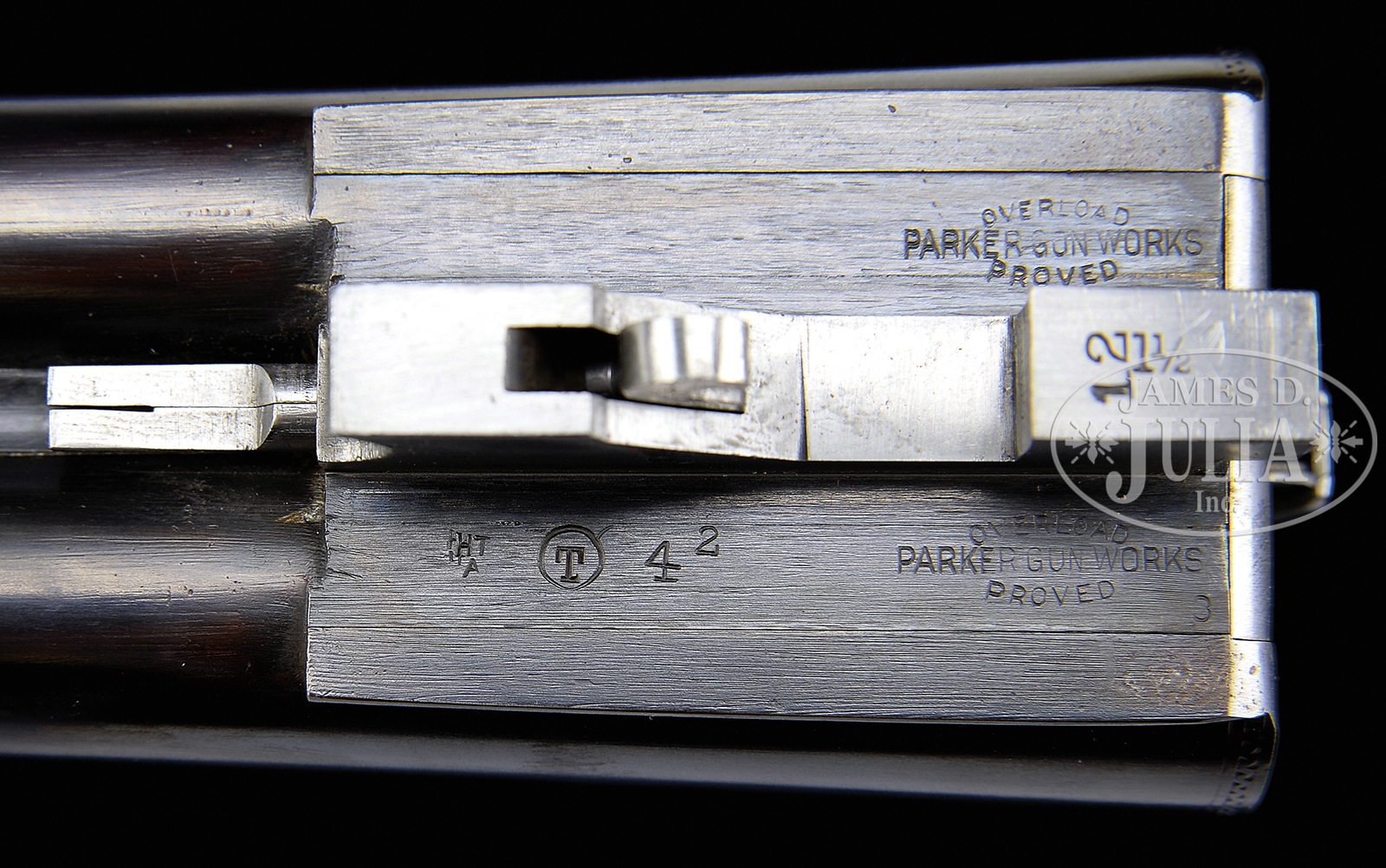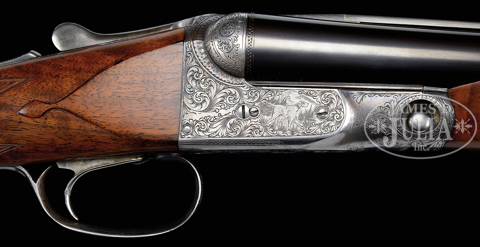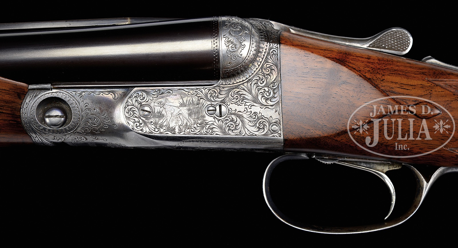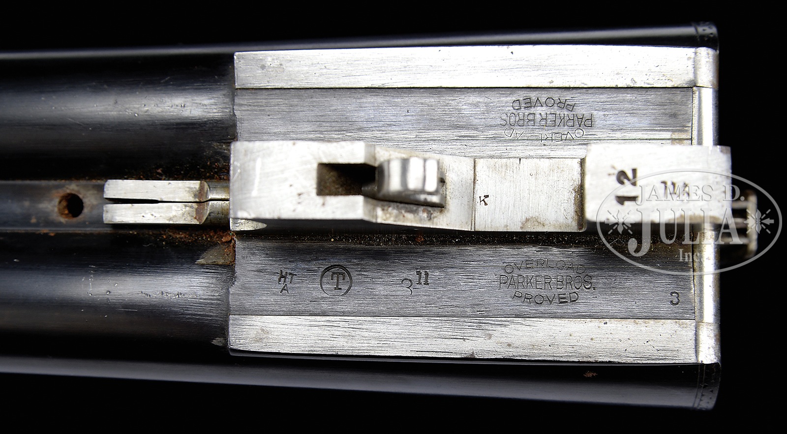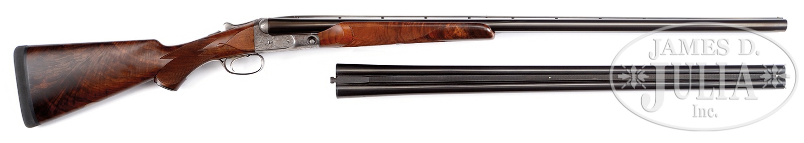 *SCARCE LATE PARKER DHE 12 GA TRAP GUN WITH EXTRA BBL SET.SN 237037. Cal. 12 Ga. 2-3/4″ Cham. 32″ Titanic steel bbls with Parker full length matted ventilated rib. Twin ivory beads. Second bbl set – 28″ fluid steel, 2-5/8″ Cham. with matted ventilated rib which is not of Parker manufacture. 1-1/2 frame. Water table marked with SN and grade designation. Bbl flats stamped “Overload proved / Parker Gun Works.” Unstruck bbl weight 4 lbs 2 oz. on orig bbl set and 3 lbs. 11 oz. on second set. Proper beavertail forearm reinforcement lug on orig bbl set and standard lug on second set. Nickel plated Parker single selective trigger, non-auto safety, auto ejectors. Capped full pistol grip buttstock with flame grained American walnut checkered in typical “D” grade fashion with teardrop behind action and finished with black Deccelerator brand pad. Un-engraved nickel shield at toe. “Parker Bros. / Meriden, Conn.” grip cap. Beavertail forearm with Deeley latch engraved in typical “D” pattern and finely checkered in floral point pattern with mullered borders. Action is engraved in typical later DHE pattern with pointer on left, setter on right surrounded by Parker’s scroll. Bottom of action lightly scroll engraved with four pheasants surrounded by scroll. Trigger guard bow is nicely scroll engraved with SN noted at tang. Bbl measurements bbl set 1: Bore diameter :left – .735, right – .729. Bore restrictions: left – .033 (full), right – .013 (LT MOD). Minimum wall thickness: left – .032, right – .032 . Weight: 8 lbs. 8 oz. Drop at comb: 1-1/2″, drop at heel: 1-15/16″. LOP: 14-1/8″ from rear position single trigger. Bbl measurements bbl set 2: Bore diameter :left – .072, right – .728. Bore restrictions: left – .026 (IM MOD), right – .024 (MOD). Minimum wall thickness: left – .033, right – .033. Weight: 7 lbs. 15 oz. LOP: 14-1/8″ from rear position single trigger. Forearm is interchangeable for both bbls. PROVENANCE: Remarkable William Larkin Moore Private Estate Collection of Fine Sporting Arms. Special Note: This item(s) contains plant or animal properties that may be covered by the Endangered Species Act (ESA). We have taken care to ensure that this item(s) meets the standard for sale under the ESA. However, certain states and other countries have laws that are more restrictive than the ESA. It is the bidder’s responsibility to ensure that it is lawful to purchase or transport this item(s) into their state, and to obtain the necessary import and export approvals. Delay or failure to obtain any such permit or approval does not relieve the buyer of paying for the item(s) and consummating the purchase. CONDITION: Excellent. Bbls retain nearly all of their professional quality re-black (both sets) with engraving lightly softened on bbl set No. 1 and weep holes and plugs on bottom rib of bbl set No. 2. Action retains approximately 15-20% orig case color, mostly faded, though visible in protected areas. Engraving is crisp. Buttstock and forearm are excellent and retain most of a custom hand rubbed oil finish with just a couple of minute handling marks throughout. Top lever is slightly left of center though gun is tight and on face. Trigger works, ejectors are in time, mechanics are excellent. Bbl set No.1 are excellent near mirror and bbl No. 2 bores near mirror as well. A neat transition era highly versatile DHE Parker. 50594-12 JSL (5,000-9,000) C&R; IVORY – Lot 3458
