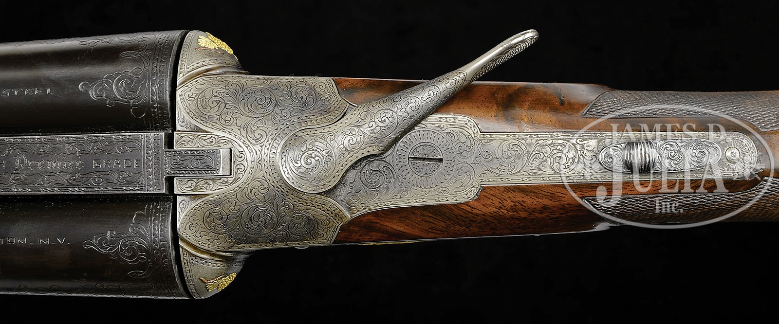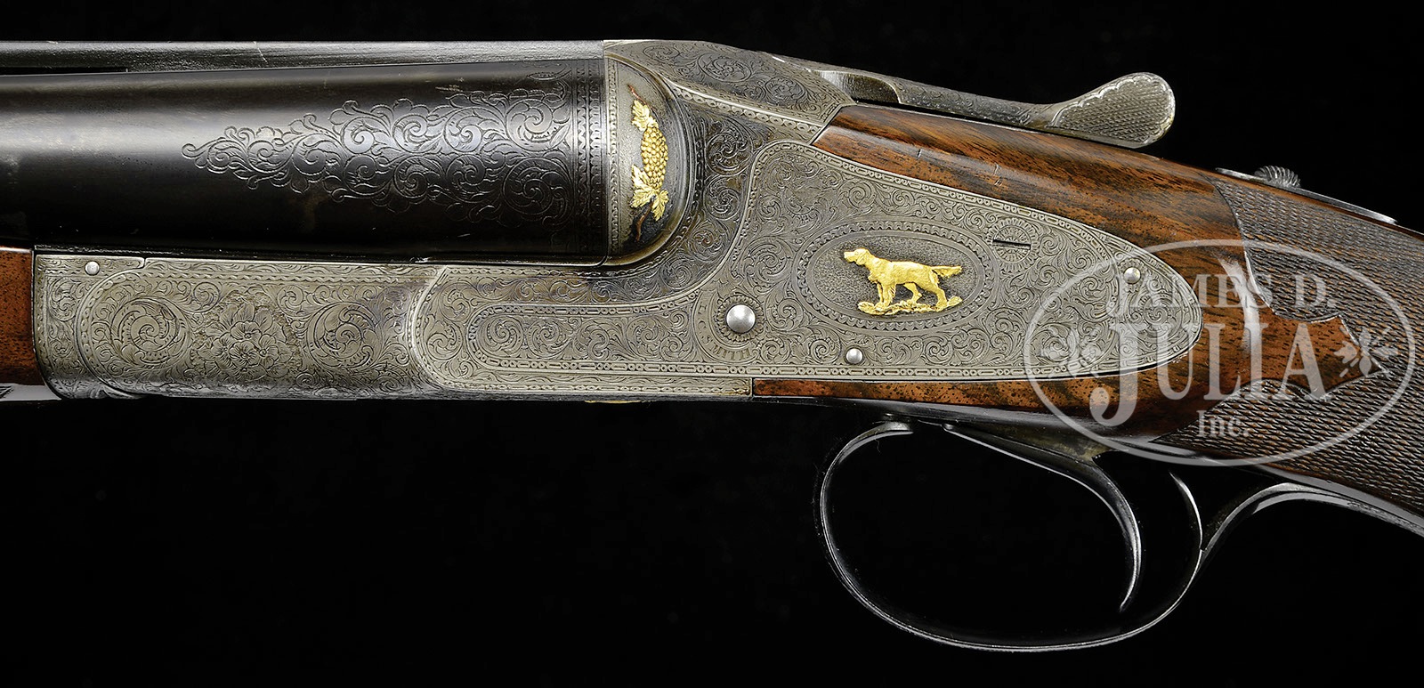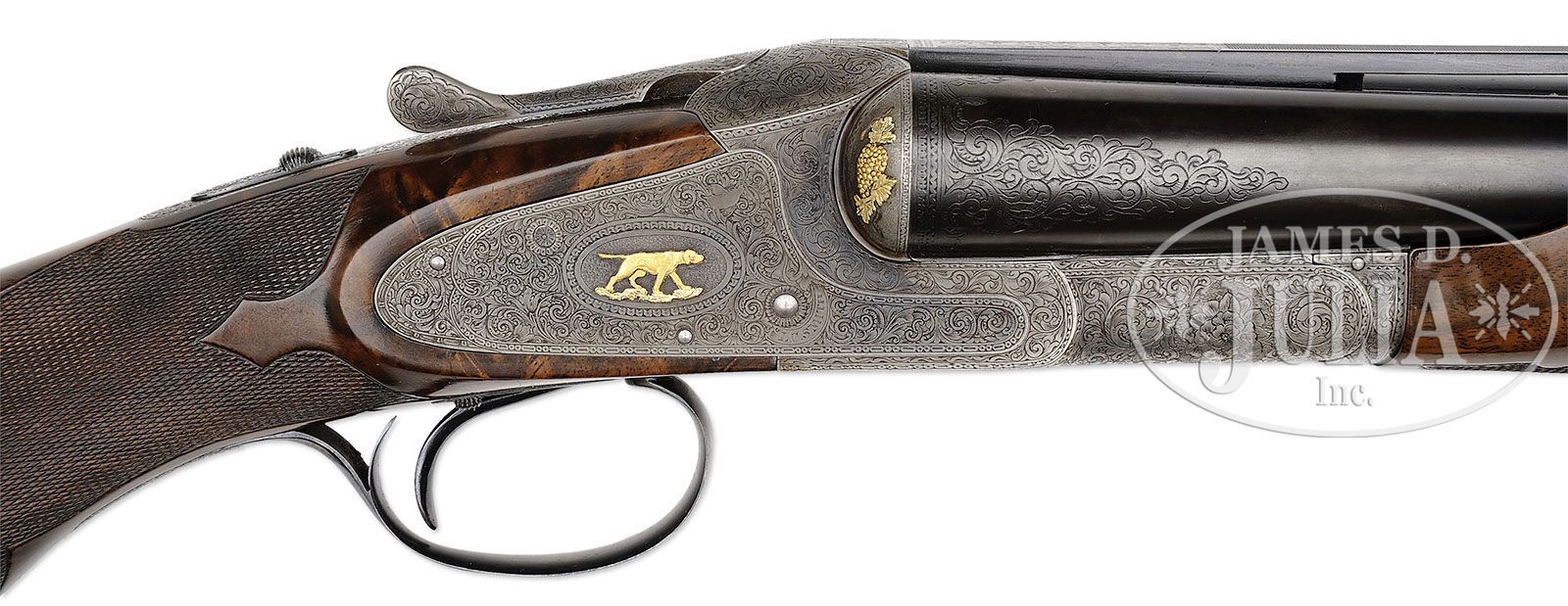 *VERY RARE L. C. SMITH PREMIER GRADE SINGLE TRIGGER, VENTILATED RIB, TRAP GUN.SN 111712. Cal. 12 ga. 2-3/4″ Chambers. 32″ Bbls with raised, single sighting plane, ventilated rib, mounted with two ivory beads, is engraved “L. C. SMITH Premier GRADE” at rear portion of rib. Tops of bbls are engraved “SIR JOSEPH WHITWORTH FLUID COMPRESSED STEEL” and “MADE TO ORDER BY THE Hunter Arms Co, Inc. FULTON, N.Y.” There are 2-1/4″ triangles of scroll engraving at breech ends and 3/4″ triangles at muzzles. Engine turned water table is engraved with SN and grade, and stamped with Hunter nitro proofs. Bottoms of bbls are stamped with sheaf of wheat Whitworth logos. Case hardened action features nicely filed beads around fences, and features non-automatic safety (S gold inlaid), and Hunter single selective trigger, engraved on trigger plate “HUNTER ONE TRIGGER”. Action and lockplates are engraved with well cut open scroll with geometric borders at nearly full coverage. “L. C. SMITH” is in arched ribands around hammer pivots. This unique engraving is enhanced with the addition of raised relief gold inlays depicting dogs (a setter on left and pointer on right) on lockplates. The setter on right plate is on a lighter gold ground. Fences are beautifully three colored gold inlaid with yellow gold grapes, light gold leaves, and red gold vines. A standing grouse is in oval on trigger plate. Water table is engraved with SN and “Premier”. Blued trigger guard with SN at grip, is gold inlaid “SAM” in oval on bow. Broadly marbled and nicely figured Circassian walnut round knob buttstock measures 13-7/8″ over Jostam red open-sided pad, and features wide Monte Carlo comb, typical Premier borderless checkering with large flourish into buttstock, and a vacant gold oval on toe line. Matching large beavertail ejector forend has fancy checkering pattern with ribbons through pattern, guitar shaped secondary release, and internals of iron scroll engraved and marked with ejector patent information. Bore diameter: left-.726, right -.726. Bore restrictions: left -.037 (Full), right -.037 (Full). Minimum wall thickness: left -.036, right -.033. Drop at heel: 2″, Drop at rear of Monte Carlo: 1-1/2″. Drop at comb: 1-9/16″. Weight: 8 lbs. 6 oz. LOP: 13-7/8″. CONDITION: Very fine. Bbls retain approx 90% of an old re-blue, engraving still clear. Action retains most of its orig case hardening color, which was always quite muted, and the same can be said for the lockplates. Overall effect is a very pleasing french gray, silvering around bottom. Stocks retain nearly all of an old gloss finish, with a number of minor marks and a few scratches, as well as some chipping. Non orig pad is somewhat flattened. Bores are excellent. Action is tight. Ejectors are in time. Trigger works. A very fine, high grade, L. C. Smith with only 21 made in 12 ga. This gun is listed in Brophy (p. 214) with all present specifications. 4-49535 MGM10 (35,000-55,000) – Lot 3461