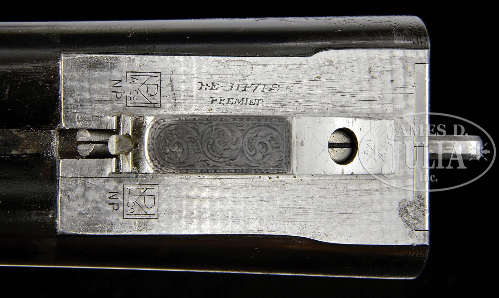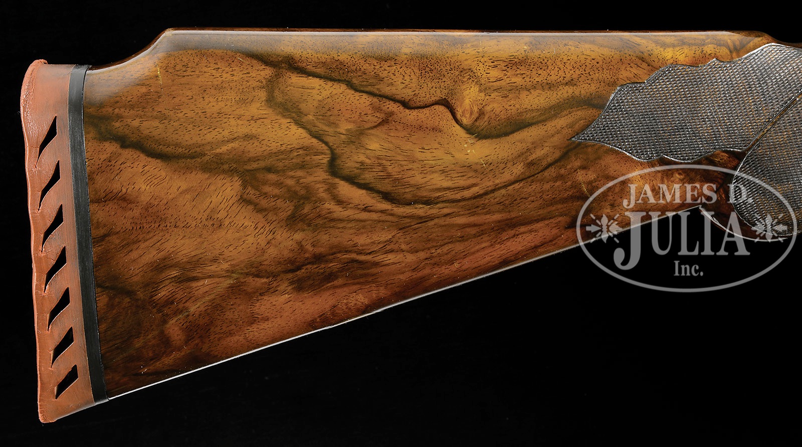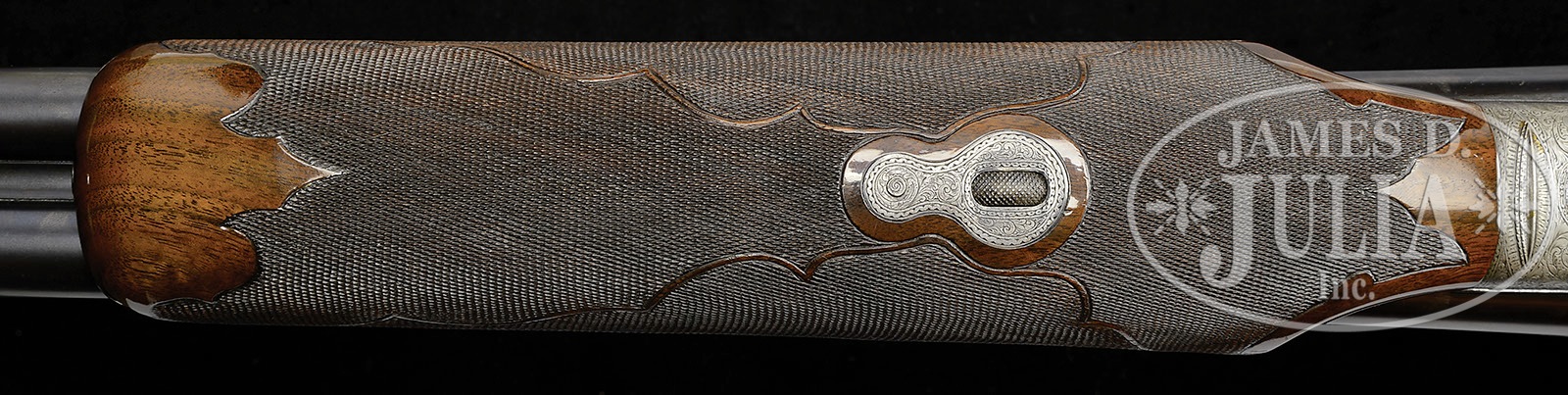 *VERY RARE L. C. SMITH PREMIER GRADE SINGLE TRIGGER, VENTILATED RIB, TRAP GUN.SN 111712. Cal. 12 ga. 2-3/4″ Chambers. 32″ Bbls with raised, single sighting plane, ventilated rib, mounted with two ivory beads, is engraved “L. C. SMITH Premier GRADE” at rear portion of rib. Tops of bbls are engraved “SIR JOSEPH WHITWORTH FLUID COMPRESSED STEEL” and “MADE TO ORDER BY THE Hunter Arms Co, Inc. FULTON, N.Y.” There are 2-1/4″ triangles of scroll engraving at breech ends and 3/4″ triangles at muzzles. Engine turned water table is engraved with SN and grade, and stamped with Hunter nitro proofs. Bottoms of bbls are stamped with sheaf of wheat Whitworth logos. Case hardened action features nicely filed beads around fences, and features non-automatic safety (S gold inlaid), and Hunter single selective trigger, engraved on trigger plate “HUNTER ONE TRIGGER”. Action and lockplates are engraved with well cut open scroll with geometric borders at nearly full coverage. “L. C. SMITH” is in arched ribands around hammer pivots. This unique engraving is enhanced with the addition of raised relief gold inlays depicting dogs (a setter on left and pointer on right) on lockplates. The setter on right plate is on a lighter gold ground. Fences are beautifully three colored gold inlaid with yellow gold grapes, light gold leaves, and red gold vines. A standing grouse is in oval on trigger plate. Water table is engraved with SN and “Premier”. Blued trigger guard with SN at grip, is gold inlaid “SAM” in oval on bow. Broadly marbled and nicely figured Circassian walnut round knob buttstock measures 13-7/8″ over Jostam red open-sided pad, and features wide Monte Carlo comb, typical Premier borderless checkering with large flourish into buttstock, and a vacant gold oval on toe line. Matching large beavertail ejector forend has fancy checkering pattern with ribbons through pattern, guitar shaped secondary release, and internals of iron scroll engraved and marked with ejector patent information. Bore diameter: left-.726, right -.726. Bore restrictions: left -.037 (Full), right -.037 (Full). Minimum wall thickness: left -.036, right -.033. Drop at heel: 2″, Drop at rear of Monte Carlo: 1-1/2″. Drop at comb: 1-9/16″. Weight: 8 lbs. 6 oz. LOP: 13-7/8″. CONDITION: Very fine. Bbls retain approx 90% of an old re-blue, engraving still clear. Action retains most of its orig case hardening color, which was always quite muted, and the same can be said for the lockplates. Overall effect is a very pleasing french gray, silvering around bottom. Stocks retain nearly all of an old gloss finish, with a number of minor marks and a few scratches, as well as some chipping. Non orig pad is somewhat flattened. Bores are excellent. Action is tight. Ejectors are in time. Trigger works. A very fine, high grade, L. C. Smith with only 21 made in 12 ga. This gun is listed in Brophy (p. 214) with all present specifications. 4-49535 MGM10 (35,000-55,000) – Lot 3461