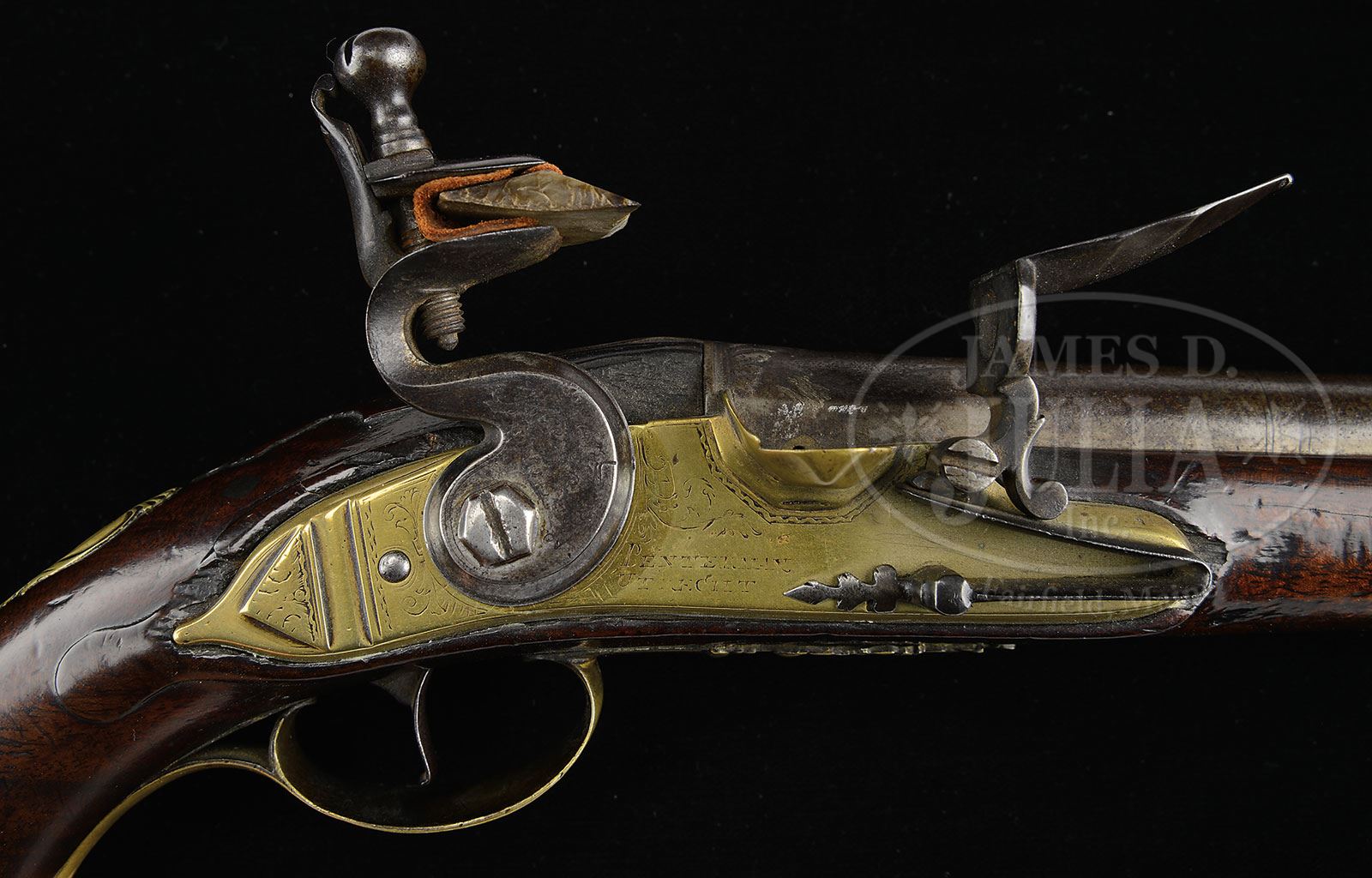 RARE AND VERY UNUSUAL PAIR OF LONG BRASS MOUNTED DUTCH (UTRECHT) FLINTLOCK HOLSTER PISTOLS WITH BRASS LOCKPLATES BY THE RENOWNED BAREND (GERRIT) PENTERMAN SIGNED PENTERMAN/UTRECHT CIRCA 1720.SN NSN. All early Dutch flintlock pistols are rare and noteworthy and this pair by one of the renowned Penterman brothers of Utrecht is more so. The flat all brass lockplates are austere, stepped at the tail, and signed ‘Penterman/Utrecht. The brass mounts have a distinctly English appearance and feature grotesque mask butts rather than the usual spurred buttcaps characteristic of early 18th century holster pistols. The plain triggerguards with shell and acanthus finials, and ramrod pipes are English inspired as well. The long steel barrels have relief carving at breeches, and slightly swamped at the engraved muzzles and struck with the Utrecht town mark. The unique brass sideplates are in the Berain style engraved with a sword, helmet, and disembodied head. The straight grain walnut fullstocks are carved behind the barrel tang and have loop butts. Wrist escutcheon similar to Visser, Volume 1, Part 2, Page 307. Utrecht markings see Visser, Volume 1, Part 2, page 226. The Penterman brothers, Barend and Gerrit (Gerard) were two of Holland’s most distinguished gunmakers during the late 17th and early 18th centuries. Their works are eagerly collected both in Europe and America. A magnificent pair of flintlock pistols, among the finest pistols ever created, by Gerrit Penterman, for Johan Friso, Prince of Orange, is on display at the Walters Art Gallery, Baltimore, Maryland. PROVENANCE: Michael D’Ambra; Collection of Dr. Douglas Sirkin. CONDITION: Good. Mounts are lightly rubbed as are lockplates. Barrels are brown and patinated but marks remain crisp. Walnut fullstocks are crisp overall with usual minor dents and insignificant imperfections around barrel pins. 4-49859 (5,000-10,000) – Lot 3464 Click here to view provenance