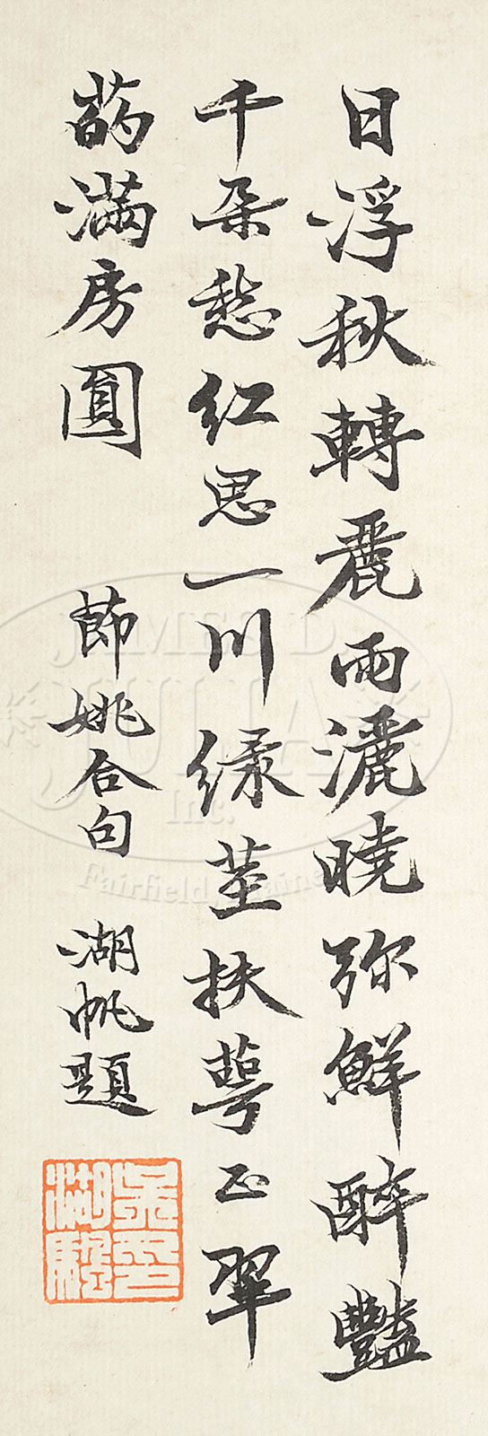 HANGING SCROLL IN THE MANNER OF PAN JINGSHU. China, ink and colors on paper, fiely depicting lotus flowers in a pond, inscribed, signed “Pan Jingshu,” dated “summer of bingzi year,” with one seal, accompanied by lenghty inscription, signed “Hufan,” with one seal. SIZE: 40″ x 13-1/2″ CONDITION: Foxing, otherwise good 9-92950 (1,200-1,800)