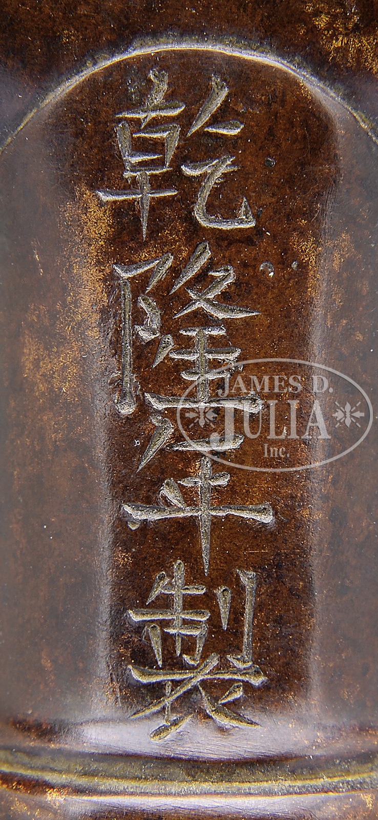 BRONZE BIRD ON PERCH.China, 20th century. The bronze depicting a bird perched upon a stand atop a splayed base. The stand decorated with vines and flowers below a ring of ruyi along with stylized characters finished in gilt. An apocryphal four character Qianlong mark incised to the stand. SIZE: 15-1/2 h overall. CONDITION: very good. 49942-2 (600-800) – Lot 3467