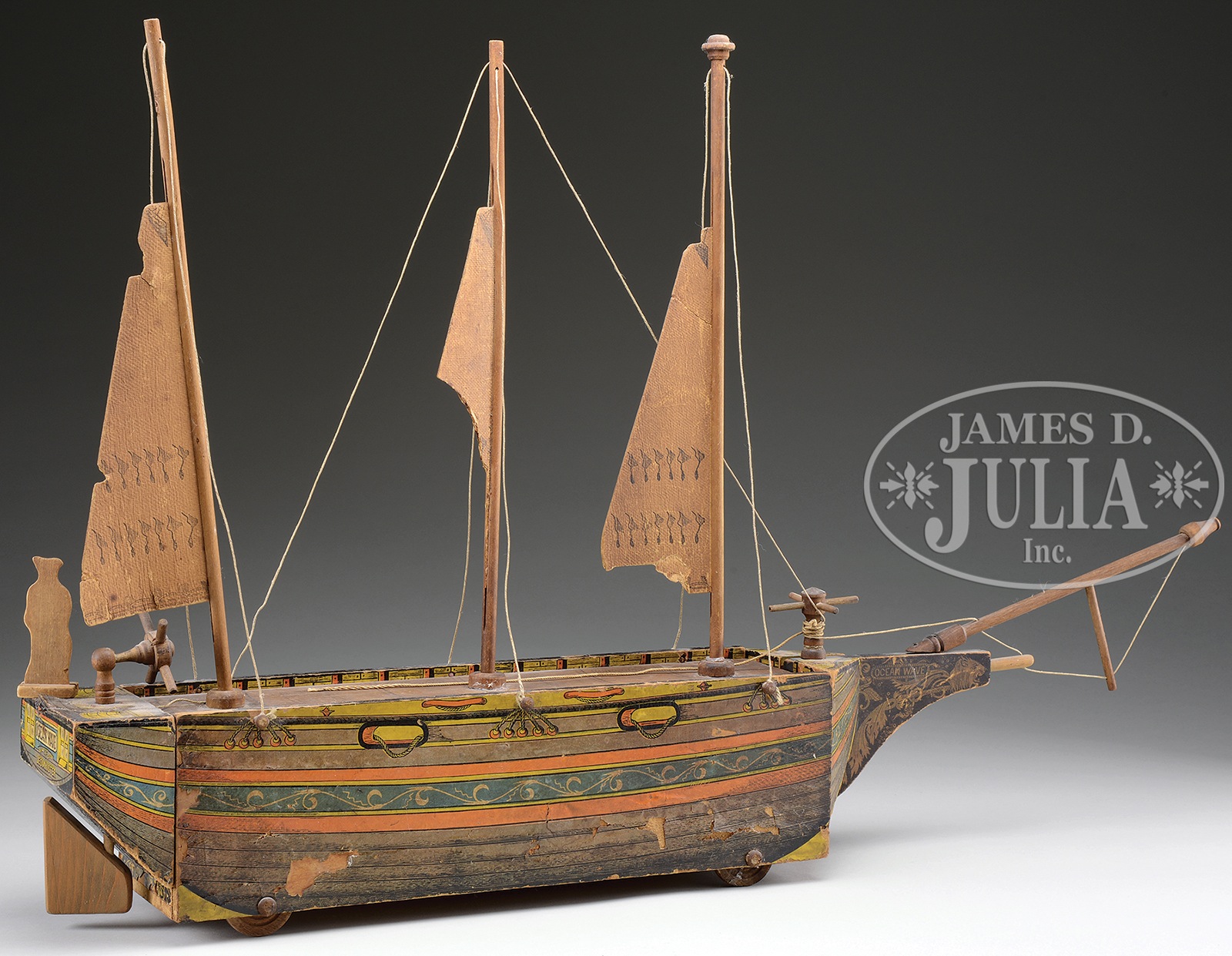 PAPER ON WOOD “OCEAN WAVE” SAILING SHIP.Large pull toy shows three mast sailing ship marked “Ocean Wave of Leominster”. Boat has steerable rudder, a harpoonist platform and various support roping for masts. SIZE: 35″ l. CONDITION: The three wooden masts are missing significant portions of sails. Paper on wood is soiled; missing areas of paper. 1-14038 (250-400) – Lot 3468 Auction: Advertising, Toy & Doll - Spring 2014 Please Note: All prices include the hammer price plus the buyer’s premium, which is paid by the buyer as part of the purchase price. The prices noted here after the auction are considered unofficial and do not become official until after the 46th day. |