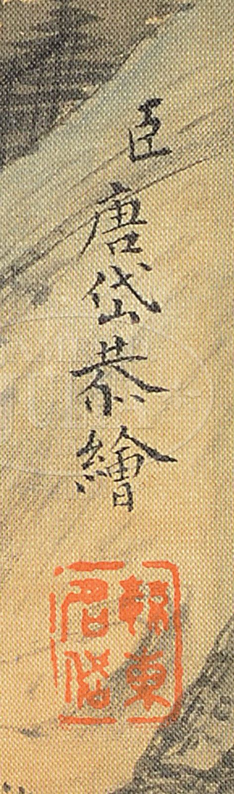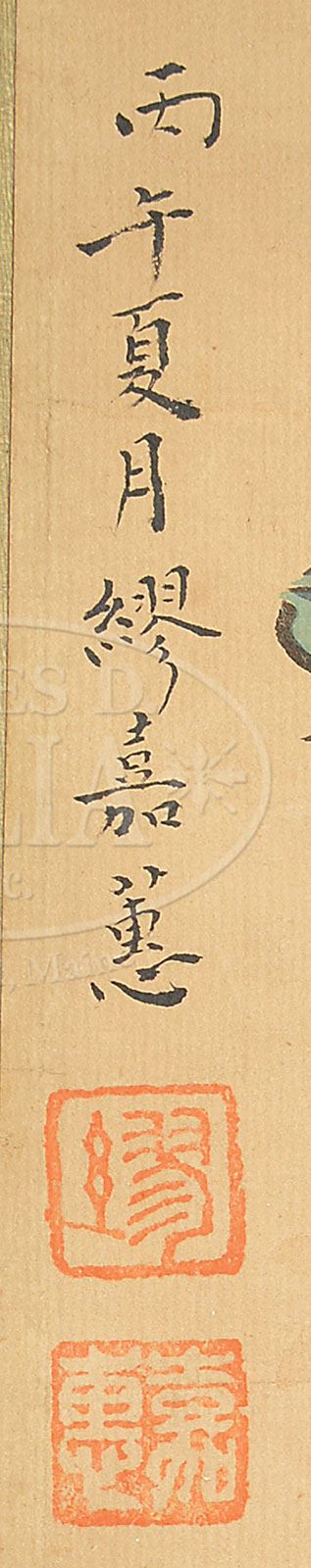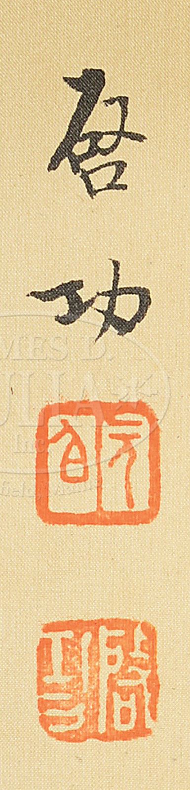 TWO HANGING SCROLLS. China. 1) After Tang Dai, ink and colors on silk, depicting a scholar and attendants in a verdant landscape with pines and pavilions, signed “chen Tang Dai,” with one seal, accompanied by calligraphy panel to the top, signed “Qi Gong,” with two seals. 2) After Miu Jiahui, ink and colors on paper, depicting a red peony, signed, dated “summer of bingwu year,” with two seals, accompanied by calligraphy panel to the top, signed “Shi Shuqing,” with one seal. SIZE: 1) 20″ x 16″. 2) 20″ x 15″ CONDITION: 1) Good. 2) Surface abrasion, stain 9-92951 (1,000-1,500)
