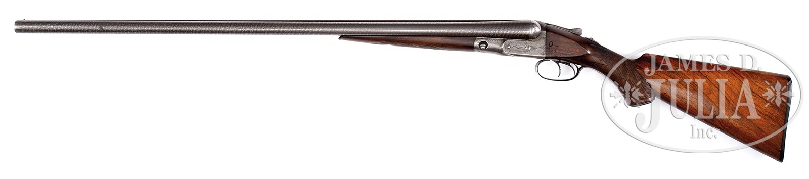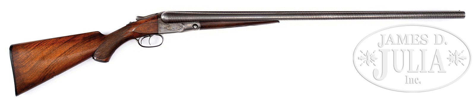 PARKER GH GRADE SHOTGUN.SN 79303. Cal. 12 ga. 30″ Damascus bbls, 2-3/4″ chambers, IM/IM chokes. Single bead. Concave matted rib. GH non-ejector #2 receiver. Double triggers. Extractors. Splinter forend. Capped pistol grip stock. Widow’s peak dog’s head hard rubber buttplate. LOP 13-3/4″. DAC 1-7/8″. DAH 3-1/8″. Auto safety. CONDITION: Fair. Bbls display nice Damascus pattern on bbls & rib, heaviest wear above forend. Patch of light dings in right bbl approx 14″ from muzzle. Bright unpitted bores. Receiver mostly silvered with some areas of wear to engraving. Wood is sound & fits well. Checkering worn. “P.T.” carved into left cheek, heavily dented at left side comb, toe line worn. Buttplate nice. Gun slightly loose. Top lever slightly left. Good mechanics. 51005-5 TJW (1,000-1,500) – Lot 3469