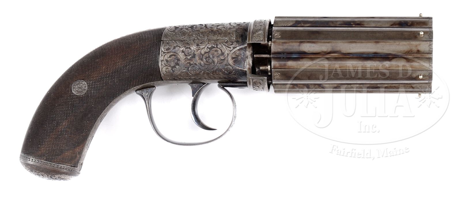 HIGH ORIGINAL CONDITION PEPPERBOX BY J. WITTON IN ITS ORIGINAL CASE WITH FINE ACCESSORIES.SN NSN. Cal. .425 Smooth bore. Exceptionally well machined and filed case hardened six bbl cluster measures 3-1/4″. Each bbl has small silver front bead. Hammerless case hardened boxlock action is near fully engraved with well cut, large, open, shaded scroll. Scroll engraved trigger guard and trigger are blued. Back strap is engraved “J. Witton Old Broad St London.” (working 1841 – 1850). Grips are fully checkered and a cap box is in butt. Pepperbox is housed in its orig mahogany case with flush mounted brass handle in rectangular plate. Case is lined in green baize, and has orig label in lid. Case contains an array of high quality accessories, including an exceptionally fine 3″ long (including spout) German silver powder flask, small pewter oil bottle, nutcracker type ball mold marked “WD” (William Davis) and no. “74”, ebony handled loading rod, turned bone handled dusting brush, and an ebony handled nipple key with fork type end specially made for the type of nipples used in this gun. Two covered compartments contain other items including spare nipples, and the key, as well as some lead balls. CONDITION: Excellent, retaining over 90% orig case hardening color on bbls and action, with brown staining and discoloration on top and bottom strap. Trigger and trigger guard retain over 70% of their orig blue. Bores are somewhat stained. Case is very fine with a number of light marks and front edge has chip on corner. Interior cloth is very fine with some rubs and compressions. Label is fine, with more rubs, slightly foxed. Accessories are very fine to excellent. 49403-5 MGM415 (8,000-12,000) – Lot 3470
