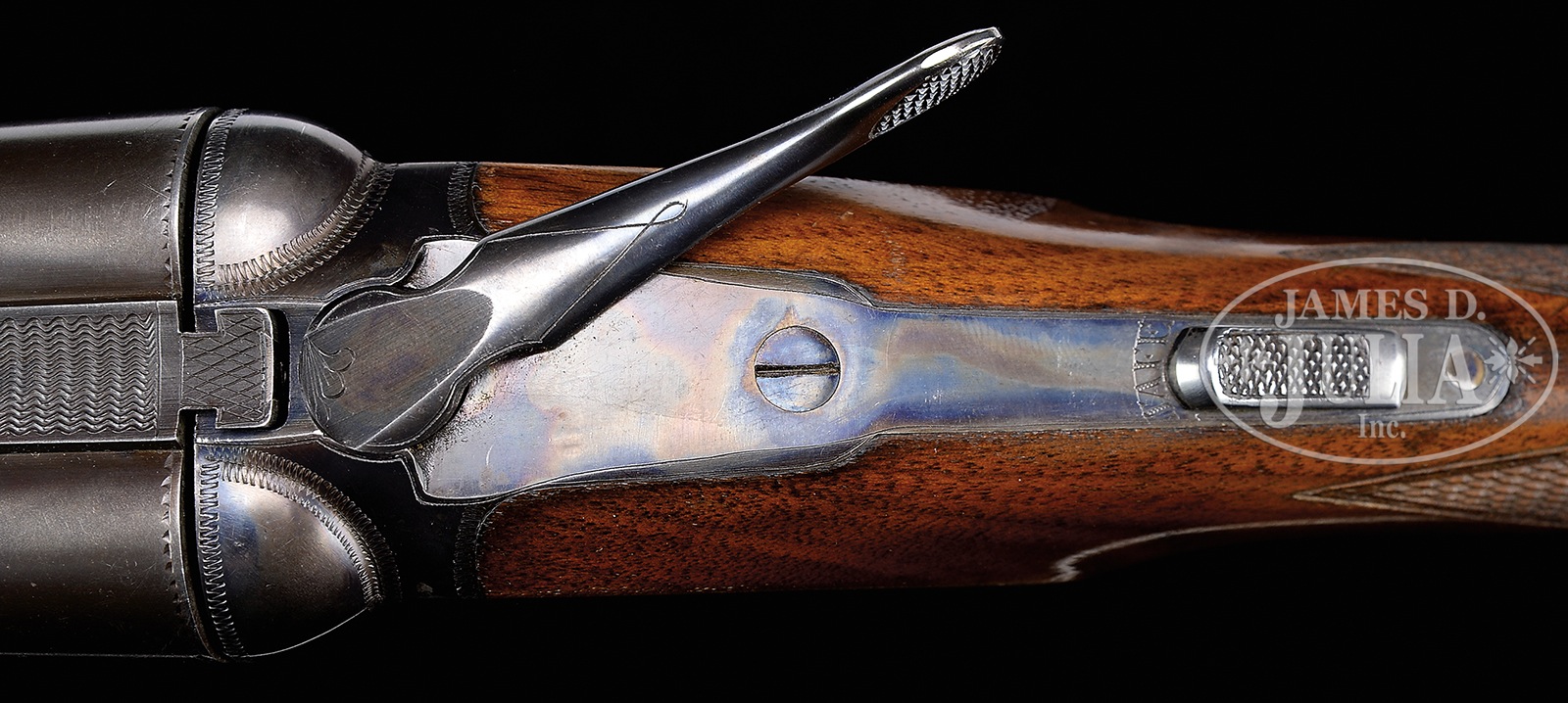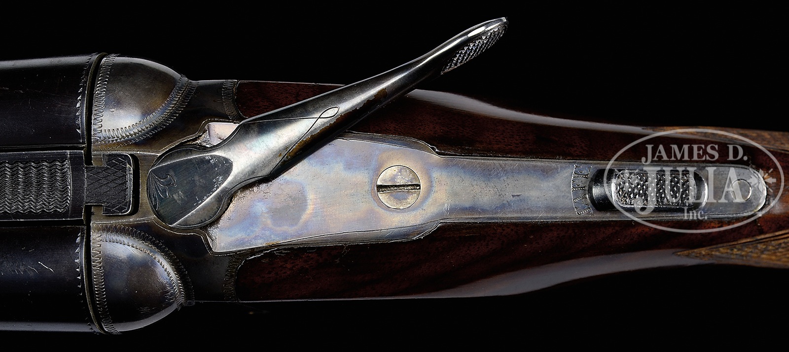 SN 240686/240687. 1) Cal. 20 ga. 26″ bbls with 2-3/4″ chambers. Full length matted rib with ivory front bead. #0 frame. Water table marked with SN and grade designation and bbl flats with unstruck bbl weight of 3 lbs. 3 oz. and production code “KG” (May 1938). Parker SST, automatic ejectors, automatic safety. Straight grip finely figured American walnut stock checkered in 2-pt pattern with nickel shield with initials “FLB” engraved. Large beavertail forearm checkered in 3-pt pattern with Deeley latch and proper reinforcing bolt at tip. Buttstock with slightly mushrooming old leather faced pad which appears orig and untouched. Receiver with typical zig-zag border pattern engraving and marked “Parker” on bottom frame. Trigger guard with zig-zag border pattern and SN noted at tang. Bore diameter: left – .615, right – .616. Bore restrictions: left – .020 (mod), right – .016 (mod). Minimum wall thickness: left – .018 (2″ in front of forearm, otherwise .022), right – .025 . Weight: 7 lbs. Drop at comb: 1-1/2″, drop at heel: 2-1/2″. LOP: 14-1/16″. 2) Cal. 20 ga. 26″ bbls with 2-3/4″ chambers. Full length matted rib with twin ivory beads. #0 frame. Water table marked with SN and grade designation and bbl flats with unstruck bbl weight of 3 lbs. 3 oz. and production code “KG” (May 1938). Parker SST, automatic ejectors, automatic safety. Straight grip finely figured American walnut stock checkered in 2-pt pattern with nickel shield with initials “FLB” engraved. Large beavertail forearm checkered in 3-pt pattern with Deeley latch and proper reinforcing bolt at tip. Buttstock with slightly mushrooming old leather faced pad (less so than gun #1) which appears orig and untouched. Receiver with typical zig-zag border pattern engraving and marked “Parker” on bottom frame. Trigger guard with zig-zag border pattern and SN noted at tang. Bore diameter: left – .617, right – .617. Bore restrictions: left – .022 (mod), right – .013 (lt mod). Minimum wall thickness: left – .023 , right – .022 . Weight: 6 lbs. 14 oz. Drop at comb: 1-7/16″, drop at heel: 2-3/8″. LOP: 14-1/8″. Special Note: This item(s) contains plant or animal properties that may be covered by the Endangered Species Act (ESA). We have taken care to ensure that this item(s) meets the standard for sale under the ESA. However, certain states and other countries have laws that are more restrictive than the ESA. It is the bidder’s responsibility to ensure that it is lawful to purchase or transport this item(s) into their state, and to obtain the necessary import and export approvals. Delay or failure to obtain any such permit or approval does not relieve the buyer of paying for the item(s) and consummating the purchase. CONDITION: 1) Exceptionally fine as found. Bbls retain 96-98% orig blued finish with a couple of light scratches and handling marks. Buttstock and forearm are excellent and orig with scattered light handling marks and retain 95-98% of their orig hand-rubbed finish. Receiver retains nearly all of its bright & bold orig case color, just starting to tone on bottom of frame and at breech balls. Trigger guard retains 70% orig blue, dark and rich at bow and end of tang, toning at grip. This is truly an exceptional skeet gun. 2) Exceptionally fine as found. Bbls retain 96-98% orig blued finish with a couple of light scratches and handling marks. Buttstock and forearm are excellent and orig with scattered light handling marks and repair behind top tang through wrist with a couple of other grain separations near trigger guard that can be restored and made invisible as they are directly along the grain. Butt checkering has been chased. Receiver retains approximately 90% bold case color, just starting to tone on bottom of frame and at breech balls. Trigger guard retains 80% plus orig blue, dark and rich at bow and end of tang, toning at grip. A unique opportunity to own a fabulous pair of consecutively SN Parker”s with options and used very little. 51058-2 JSL (12,000-18,000) C&R; IVORY – Lot 3473