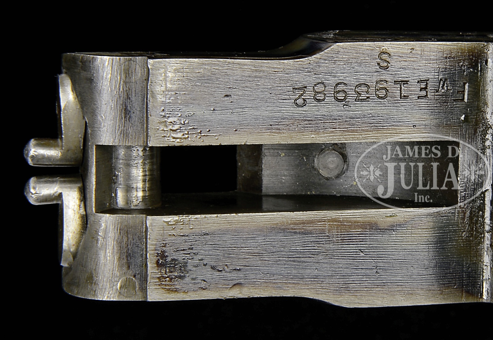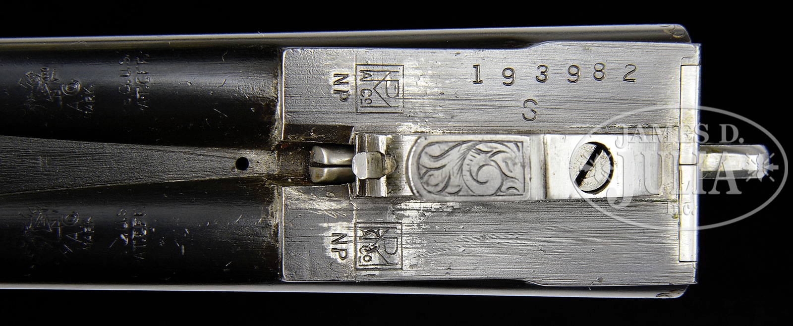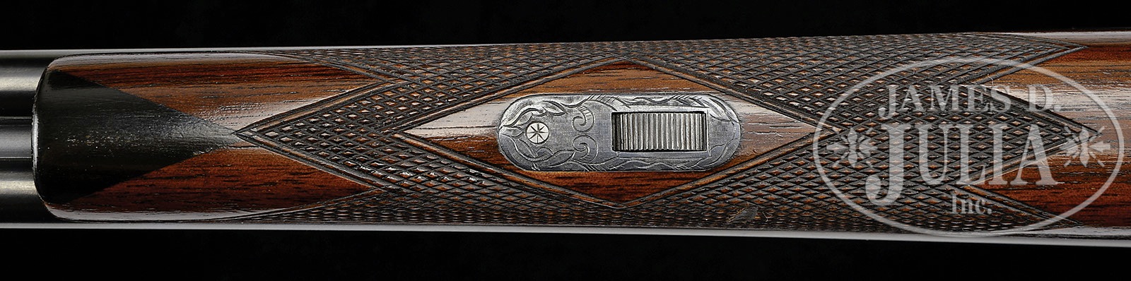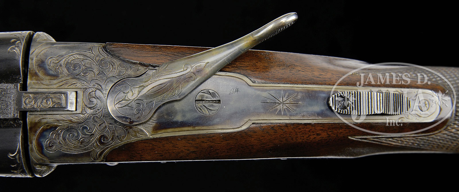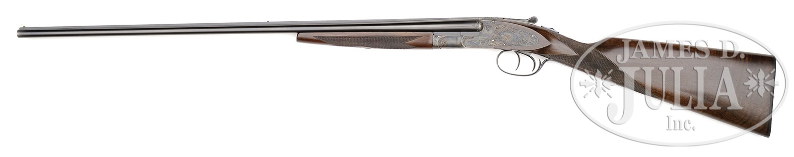 *EXCEPTIONALLY RARE .410 L. C. SMITH SPECIALTY GRADE EJECTOR GUN.SN 193982. Cal. .410. 3″ Chambers. 26″ Bbls with raised, single sighting plane rib, mounted with two brass beads, are marked “L. C. Smith Specialty Grade” and “HUNTER ARMS CO INC. M’F’R’s FULTON, NY, USA” on tops. Bbl flats are stamped with SN, “S”, and Hunter proofs, bottoms of bbls with nitro steel trademarks. Case hardened action features automatic safety and double triggers, and is engraved in typical Specialty style with brace of quail surrounded by scroll on left lockplate; a flying duck with other ducks in background, on right. American walnut straight grip stock has nice fiddle figure throughout, and features typical point pattern checkering, and serrated hard rubber buttplate. Matching splinter ejector forend with inset ebony tip, has ovate secondary latch escutcheon. Bore diameter at muzzles: left-.393, right -.395. Bore restrictions: left – Full, right – Full. Minimum wall thickness: left -.032, right -.034. Drop at heel: 2-7/16″, drop at comb: 1-1/4″. Weight: 5 lbs. 12 oz. LOP: 14-1/4″. CONDITION: Excellent, as expertly restored. Bbls retain 95 – 97% factory quality re-blue, toned back at breech ends and muzzles. Action retains nearly all of a well colored re-hardening, silvered on edges and slightly on bottom. Blue of trigger guard and forend escutcheon also is slightly silvered. Stocks retain nearly all of an exceptionally fine factory type finish, checkering correctly re-cut. Bores are excellent, bright and shiny. Action is tight. Ejectors are in time. It is estimated that only 33 Specialty grade .410’s were ever made. How many with a straight grip stock ? 4-49539 MGM9 (22,500-42,500) – Lot 3475