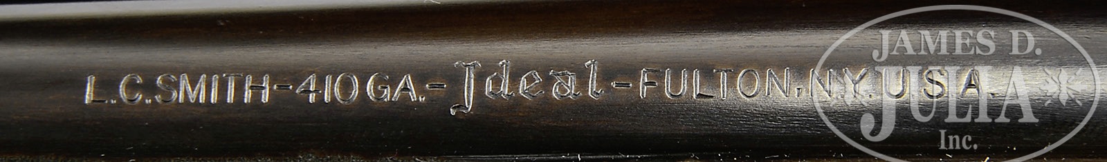 *TRULY EXCEPTIONAL, HIGH CONDITION .410 L. C. SMITH IDEAL GRADE WITH HANG TAG AND ORIGINAL SHIPPING BOX.SN FWS56720. Cal. .410. 3″ Chambers. 28″ Bbls with raised, flat, matted, single sighting plane rib, mounted with two ivory beads, are marked “L. C. SMITH – 410 GA. – Ideal – FULTON, N.Y. U.S.A.” on top of right bbl. Bbl flats are stamped “IDEAL 3 IN CHAMBER” and with SN and Hunter proofs. Bottoms of bbls are stamped “LONDON STEEL”. Typical, small .410 action features automatic safety and double triggers, and is engraved in “Ideal” grade style with large leaves on lockplates with some scroll flourishes with line and wiggle border engraving. Blued trigger guard has SN at grip. Lightly figured American walnut capped pistol grip buttstock measures 14-1/4″ over ribbed composition buttplate. Point pattern checkering with beaded borders is at grip. Matching swept beavertail forend is not fitted with ejectors, but does have secondary release with oval escutcheon. Bore diameter at muzzles: left-.382 (Full), right -.397 (Mod). Minimum wall thickness: left -.040, right -.041. Drop at heel: 2-3/8″, drop at comb: 1-5/16″. Weight: 6 lbs. 12 oz. LOP: 14-1/4″. Gun is accompanied by its orig L C Smith marked shipping box, with L. C. Smith and Railway Express Agency labels on exterior. Inner box has label with information for this particular gun. Also included is yellow L. C. Smith hang tag with information for this gun. PROVENANCE: Letter from Marlin Firearms Company with information from factory records, stating it was shipped from the company March 28, 1950, and further secondary letter from Buffalo Bill Historical Center stating “it appears upon viewing existing records that your firearm, although not the last Ideal grade firearm made, was the last Ideal grade firearm shipped from the company.” CONDITION: Excellent, near new, appears unfired, with only a few miniscule marks on wood and metal. Bores are excellent. Mechanically crisp. Box is excellent, exterior labels are foxed with slight insect damage. Information label is excellent. Hang tag is very fine with slight foxing and some creases, small area of loss to center of one side. 4-51006 MGM22 (22,500-32,500) – Lot 3476