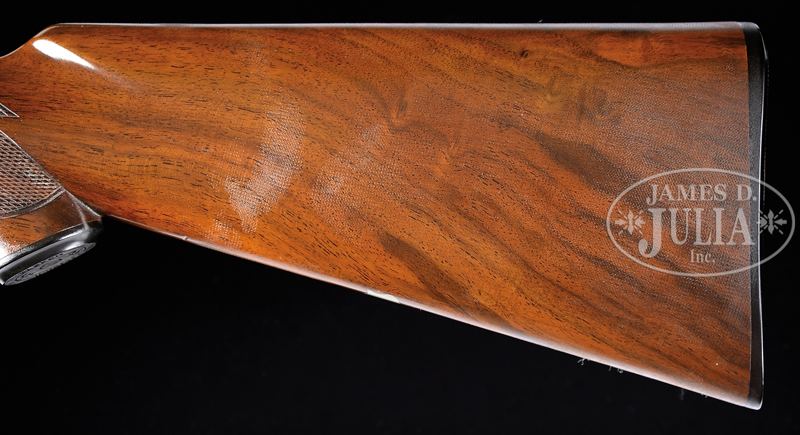 *HIGH ORIGINAL CONDITION 16 GAUGE PARKER “VHE” SHOTGUN WITH SINGLE TRIGGER AND BEAVERTAIL FOREND.SN 242157. Cal. 16 ga. 2-5/8″ Chambers. 1 Frame. 26″ Bbls are unmarked on matted rib. Bbl flats are stamped with Ilion marks with date code “PK” (June 1941), as well as chokes (imp cyl and mod) and proofs. Splinter is of reinforced type. Case hardened action with all correct markings on water table, features automatic safety and single selective Parker trigger. It is engraved in usual “V” style with wiggle borders and screw surrounds. “PARKER” is engraved on bottom of action. Blued trigger guard has SN on tang. Lightly figured American walnut Parker Ilion capped pistol grip buttstock measures 14-1/8″ over Parker dogs head buttplate. Stock has usual “V” style point pattern checkering. A vacant german silver shield is on toe line. Long beavertail ejector forend has reinforcing bolt and usual release. This gun is not listed in the PARKER GUN IDENTIFICATION & SERIALIZATION ledger (too late). Bore diameter: left -.673, right – .673. Bore restrictions: left – .011 (IC), right – .016 (mod). Wall thickness: left – .030, right – .026. Drop at heel: 2-1/4″, drop at comb: 1-9/16″. Cast: Neutral. Weight: 7 lbs. 7 oz. LOP: 14-1/8″. PROVENANCE: Remarkable William Larkin Moore Private Estate Collection of Fine Sporting Arms. CONDITION: Excellent, very close to new, with only one or two minor flecks in excellent orig bbl blue. Action retains essentially all of its color with some minor loss due to flaking on right side of trigger plate. There are some very light speckles on left side of action. Trigger guard has some light flecking but retains nearly all of its blue. Case colors on forend latch are nearly all intact, but lacquer is mostly gone. Hinge pin retains essentially all of its temper blue. Stocks retain essentially all of their varnish finish, with a few nicks and dings, which has considerable patterning covering 80% of butt and forend from contact with inside of gun case or sock. Bores are excellent. Action is tight. Ejectors are strong and in time. Trigger works. A superb untouched benchmark Parker. 50594-25 MGM120 (6,500-11,500) C&R – Lot 3476