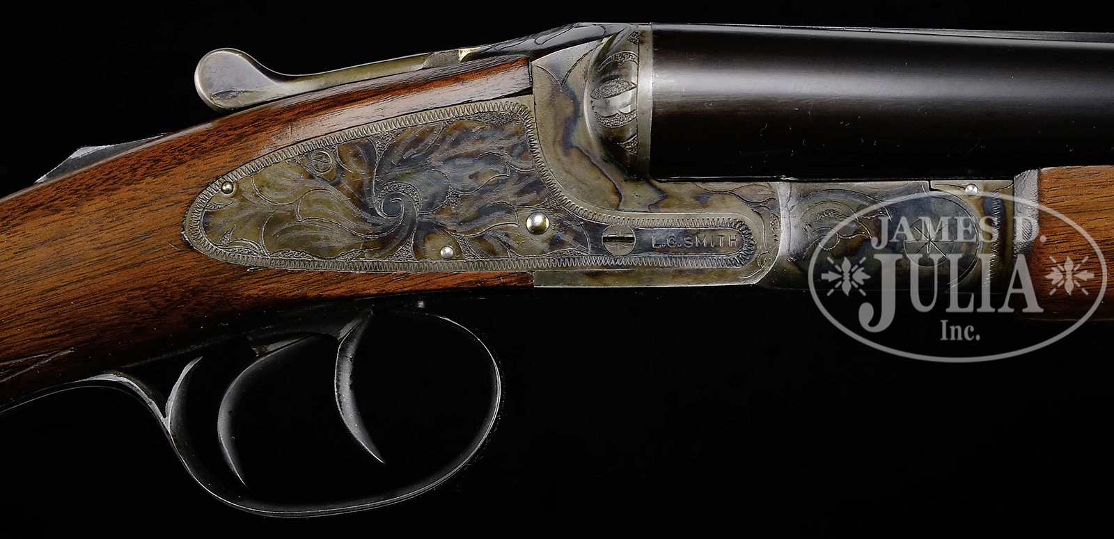 *HIGH CONDITION L. C. SMITH IDEAL GRADE EJECTOR GUN.SN FWS56539. Cal. 12 ga. 2-3/4″ Chambers. 28″ Bbls with raised, flat, matted, single sighting plane rib, mounted with two ivory beads, are marked “L. C. SMITH – 12 GA. – Ideal – FULTON, N.Y. U.S.A.” on top of right bbl. Bbl flats are stamped “IDEAL 2-3/4 IN CHAMBER” and with SN and Hunter proofs. Bottoms of bbls are stamped “LONDON STEEL”. Typical, case hardened featherweight action features automatic safety and double triggers, and is engraved in “Ideal” grade style with large leaves on lockplates with some scroll flourishes with line and wiggle borders. Blued trigger guard has SN at grip. Plain American walnut capped pistol grip buttstock measures 14-1/4″ over ribbed composition buttplate. Point pattern checkering with beaded borders is at grip. Matching swept beavertail ejector forend has secondary release with oval escutcheon. Bore diameter at muzzles: left-.727 , right -.727. Bore restrictions: left- .033 (Full), right-.035 (Full). Minimum wall thickness: left -.044, right -.044. Drop at heel: 2-9/16″, drop at comb: 1-9/16″. Weight: 7 lbs. 10 oz. LOP: 14-1/4″. PROVENANCE: Estate Collection of John Houchins. CONDITION: Excellent, near new, with only a few light marks on bbls, slightest of edge wear on action, and lifting of varnish. Trigger guard is slightly silvered at grip, top lever, and thumbpiece. Stocks have a number of light marks and two deeper dark scratches on left side. Bores are excellent. Mechanically crisp. 4-50880 MGM240 (3,000-5,000) – Lot 3478