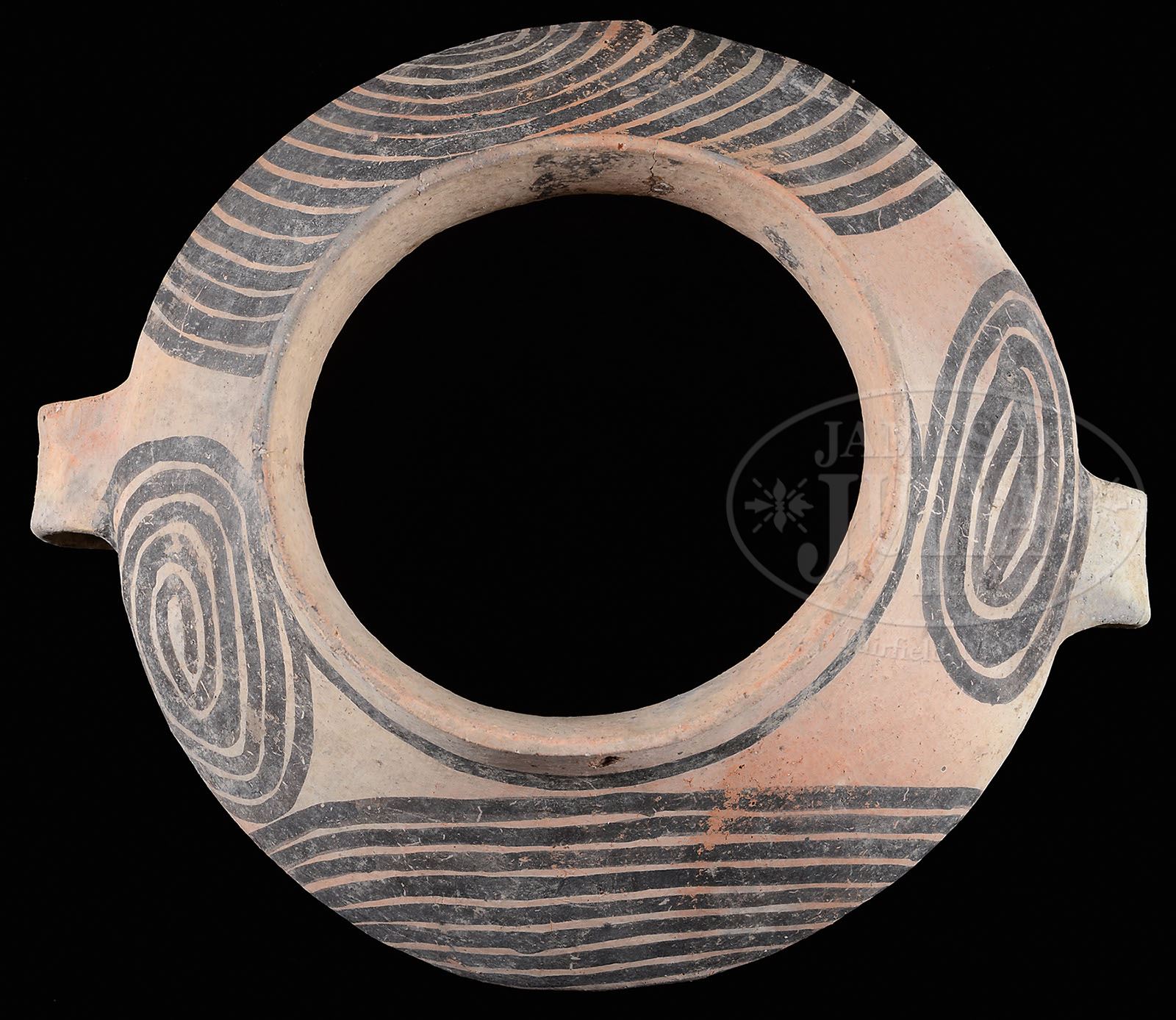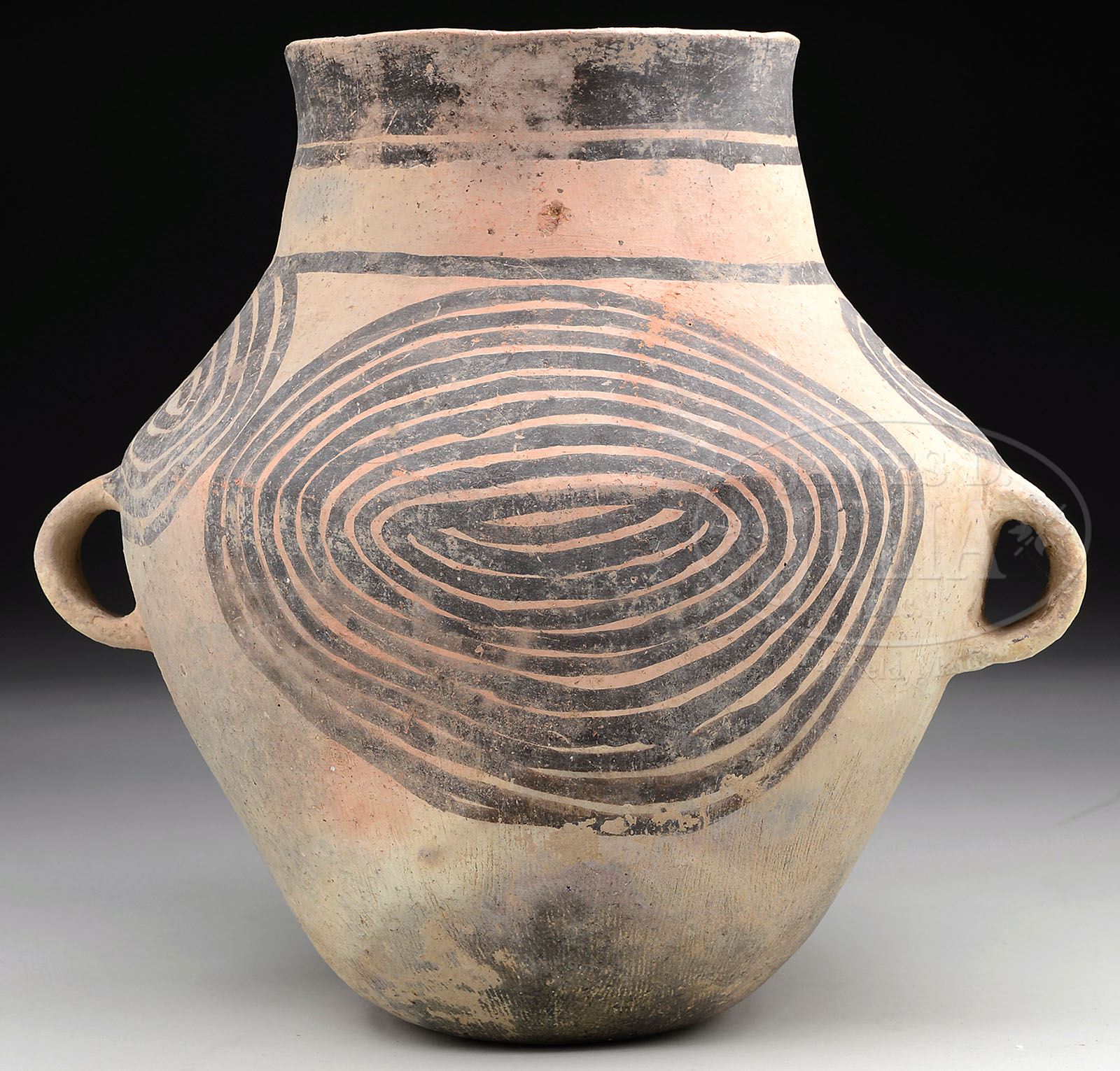 STONEWARE STORAGE JAR. Neolithic Period (2nd century B.C.), China. Yang Shao culture. Various anthropomorphic and geometric designs in red and black/brown color. SIZE: 11-1/2″ h x 12″ dia. PROVENANCE: From a private New York State collection. CONDITION: Generally very good with age wear. 9-92606 (800-1,200)