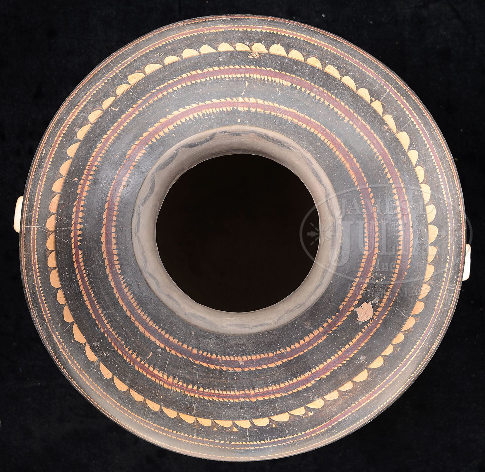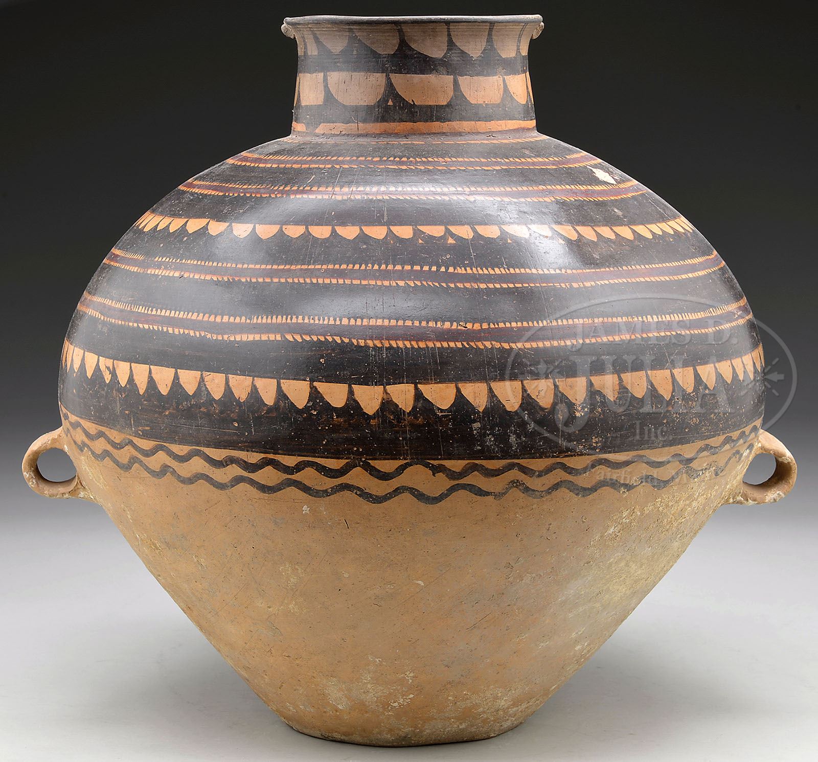 POLISHED STONEWARE STORAGE JAR. Neolithic Period (2nd century B.C.), China. Yang Shao culture. Various anthropomorphic and geometric designs in red and black/brown color. SIZE: 16″ h x 16″ dia. PROVENANCE: From a private New York State collection. CONDITION: Generally very good with age wear. 9-92561 (800-1,200)
