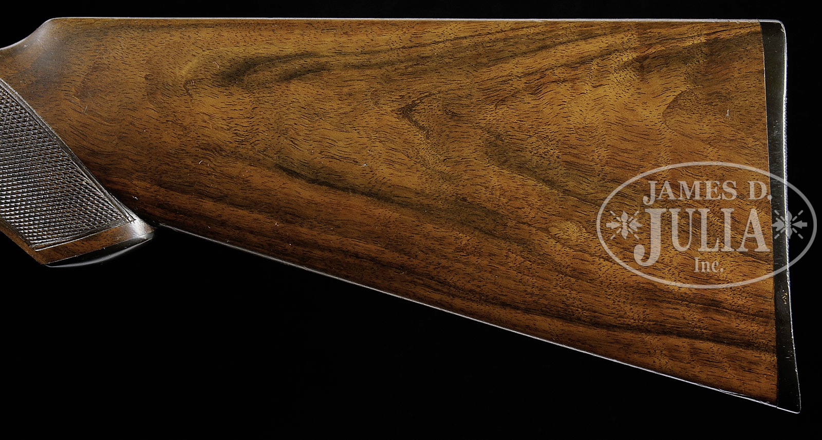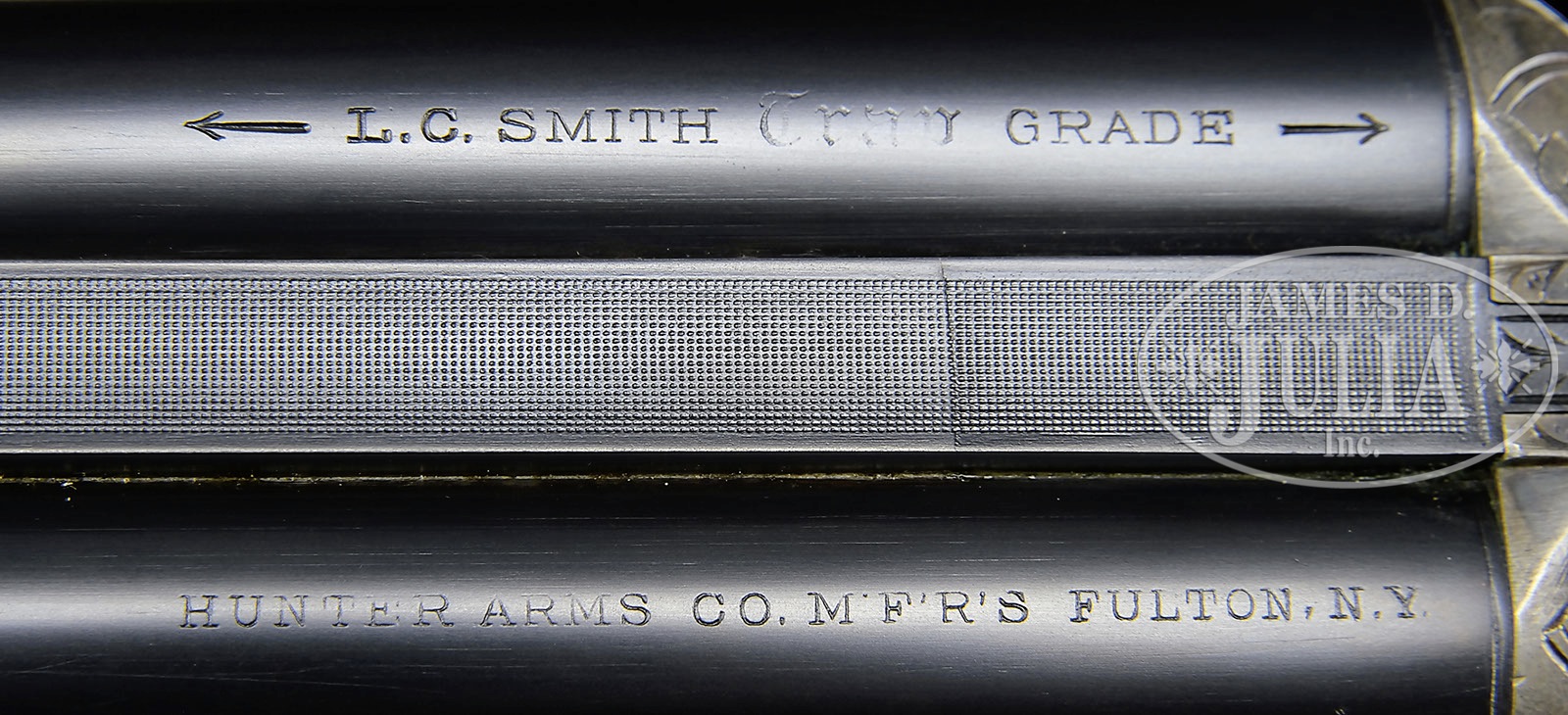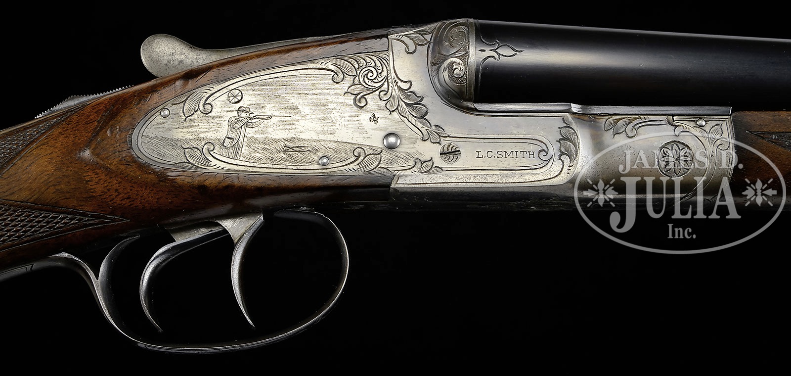 *EARLY 20 GAUGE LIGHTWEIGHT L. C. SMITH TRAP GRADE WITH EJECTORS.SN 7856E. Cal. 20 ga. 2-3/4″ Chambers. 28″ Bbls with concave, matted rib are engraved with typical L. C. Smith and Hunter Arms information on tops. Bbl flats are stamped with SN and “T”. Crown Steel logos are on bottom of bbls. Case hardened, featherweight action has automatic safety and double triggers. It is engraved in typical “Trap” style with very simple flourishes of scroll on action. Matching scroll on lockplates frames vignettes of trap shooters shooting at clay pigeons on left, and a single gunner behind trap shooting live pigeon on right. “L. C. SMITH” is on front of each lockplate. Full capped pistol grip American walnut stock is slightly flame figured. Stock measures 14-1/4″ over ribbed composition buttplate. Standard point pattern checkering continues over grip. Matching splinter ejector forend has guitar shaped secondary release. Bore diameter: left-.617, right -.618. Bore restrictions: left -.017 (Mod), right -.021 (I Mod). Minimum wall thickness: left -.022, right -.022. Drop at heel: 2-7/16″, drop at comb: 1-1/2″. Weight: 5 lbs. 10 oz. LOP: 14-1/4″. PROVENANCE: Estate Collection of John Houchins. CONDITION: Excellent, as partially refinished. Bbls retain nearly all of of a factory re-blue with a few subsequent light handling marks. Action retains most of its muted case hardening color, silvered and flecked on bottom from normal hand wear. Trigger guard retains most of its orig blue, silvered on edges and at grip. Stocks retain what appears to be their orig finish with a number of light marks and scratches, grain slightly raised. Bores are excellent. Action is tight. Ejectors are in time. A quick, small gauge L. C. Smith. 4-50932 MGM244 (3,000-5,000) – Lot 3480