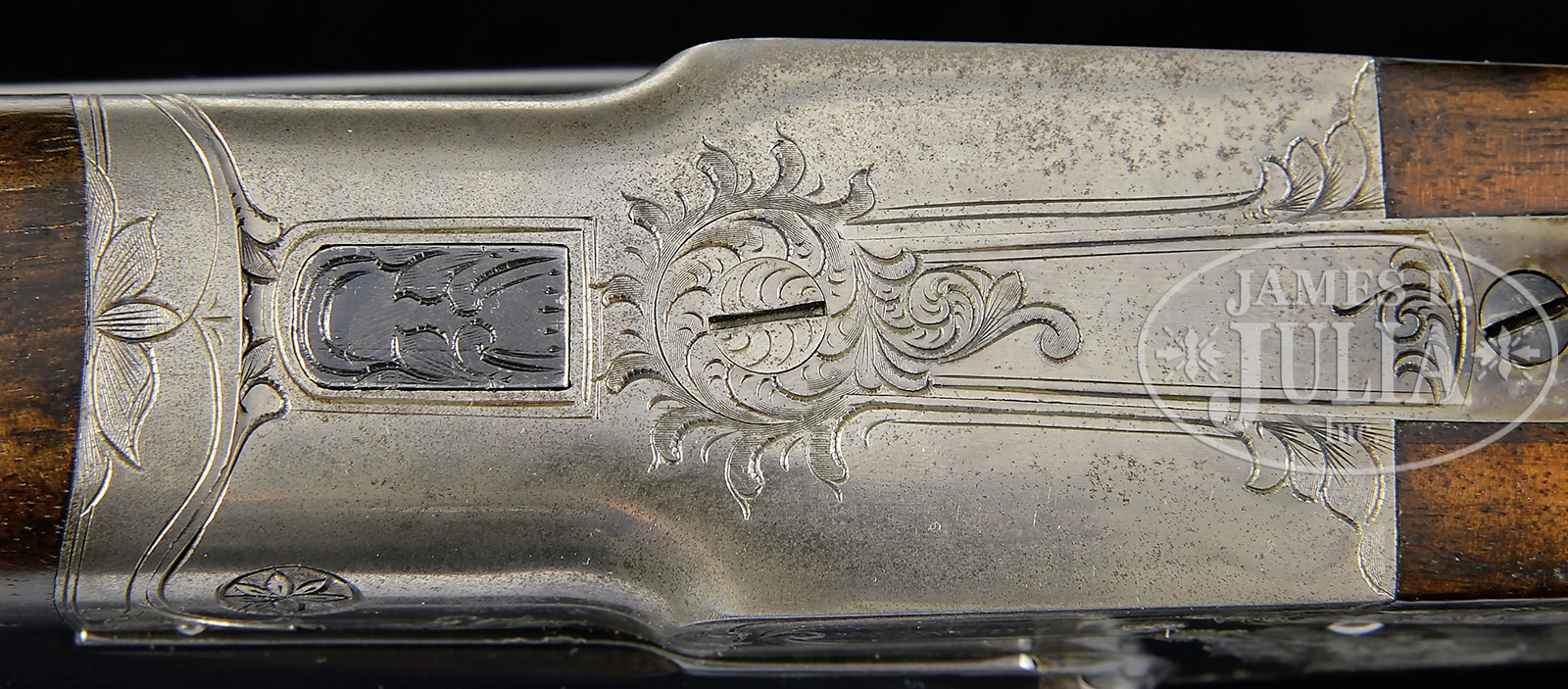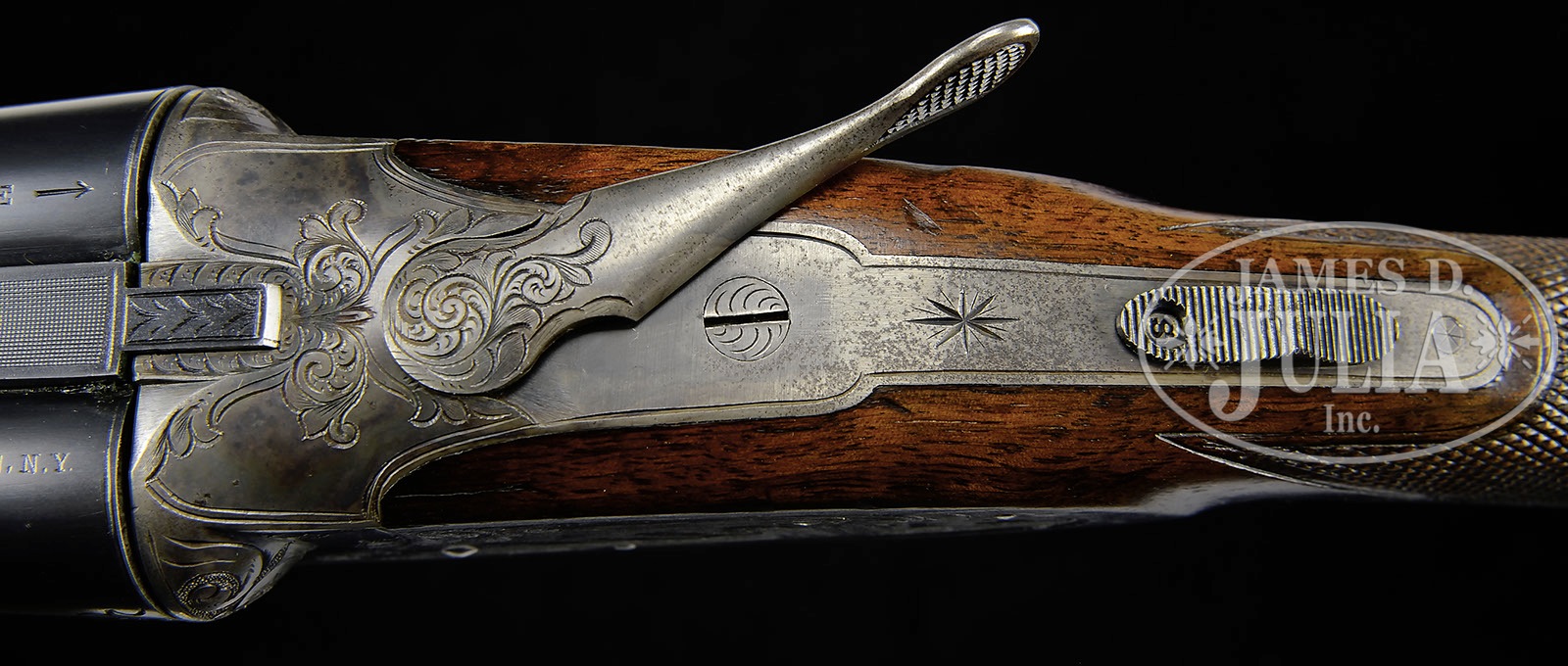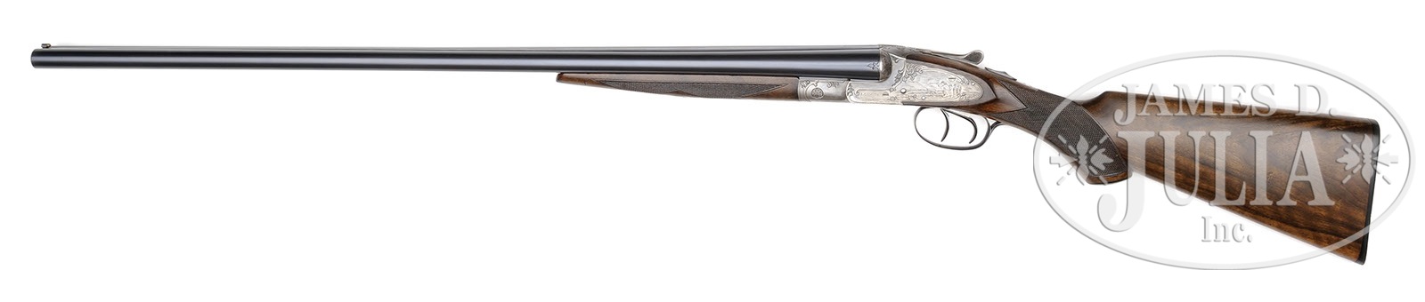 *EARLY 20 GAUGE LIGHTWEIGHT L. C. SMITH TRAP GRADE WITH EJECTORS.SN 7856E. Cal. 20 ga. 2-3/4″ Chambers. 28″ Bbls with concave, matted rib are engraved with typical L. C. Smith and Hunter Arms information on tops. Bbl flats are stamped with SN and “T”. Crown Steel logos are on bottom of bbls. Case hardened, featherweight action has automatic safety and double triggers. It is engraved in typical “Trap” style with very simple flourishes of scroll on action. Matching scroll on lockplates frames vignettes of trap shooters shooting at clay pigeons on left, and a single gunner behind trap shooting live pigeon on right. “L. C. SMITH” is on front of each lockplate. Full capped pistol grip American walnut stock is slightly flame figured. Stock measures 14-1/4″ over ribbed composition buttplate. Standard point pattern checkering continues over grip. Matching splinter ejector forend has guitar shaped secondary release. Bore diameter: left-.617, right -.618. Bore restrictions: left -.017 (Mod), right -.021 (I Mod). Minimum wall thickness: left -.022, right -.022. Drop at heel: 2-7/16″, drop at comb: 1-1/2″. Weight: 5 lbs. 10 oz. LOP: 14-1/4″. PROVENANCE: Estate Collection of John Houchins. CONDITION: Excellent, as partially refinished. Bbls retain nearly all of of a factory re-blue with a few subsequent light handling marks. Action retains most of its muted case hardening color, silvered and flecked on bottom from normal hand wear. Trigger guard retains most of its orig blue, silvered on edges and at grip. Stocks retain what appears to be their orig finish with a number of light marks and scratches, grain slightly raised. Bores are excellent. Action is tight. Ejectors are in time. A quick, small gauge L. C. Smith. 4-50932 MGM244 (3,000-5,000) – Lot 3480