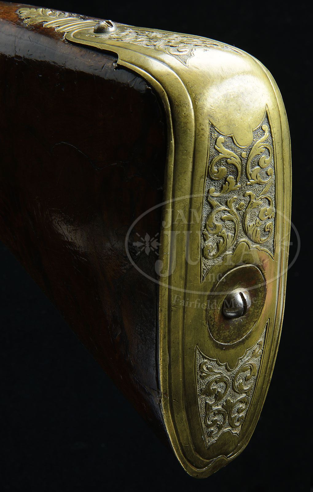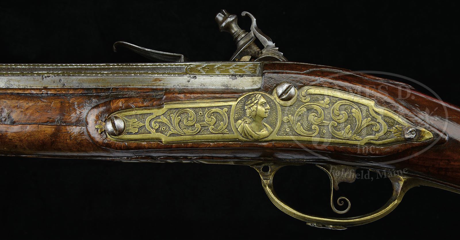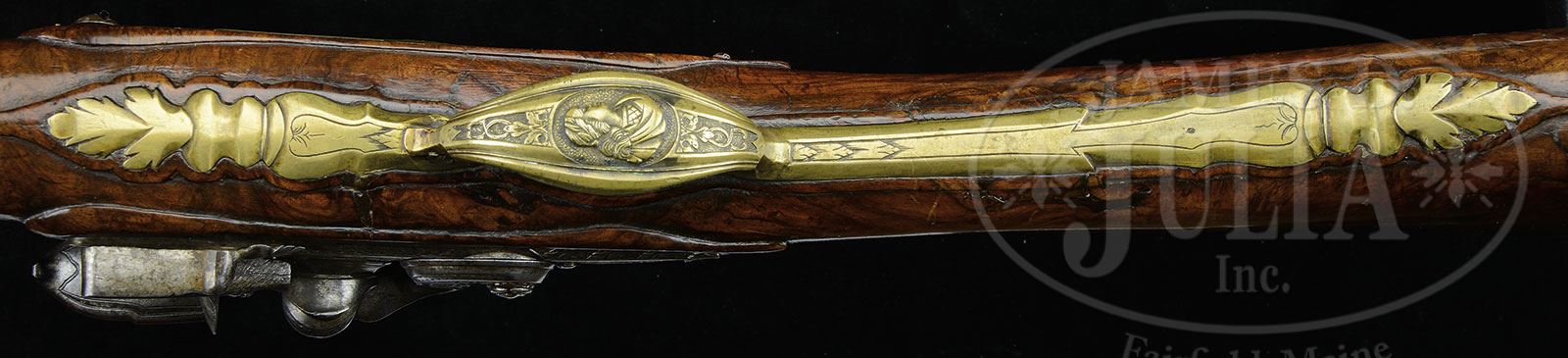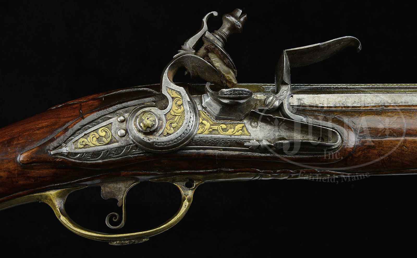 IMPORTANT P. BONAFINO, BRESCIAN FOWLER.Cal. 69. 43″ oct to rnd bbl, ca. 1680-1690. This elaborate Italian fowler is a Tour De’ Force in brass inlay and overlay on the iron parts, bbl itself shows brass inlay and chiseled-relief inlay and also the same for the orig flintlock. There is elaborate inlaid and “Cameo-cut” brass in the lock which also carries the cartouche of “BONAFINO”, according to the consignor. The chiseled brass mountings include the buttplate, trigger guard, side plate and rear ramrod pipe are also highly engraved. Burl walnut stock shows a combination of some relief-carving and some incise carving, and the forestock has very fine moldings. This is an exceptionally fine example of Italian gunsmithing at the end of the 17th century and would have obviously been a wealthy gentleman’s piece. PROVENANCE: Ex-collection of John Greenhall, Orlando, FL; Collection of Dr. Douglas Sirkin. CONDITION: Stock appears to have its orig varnish, and the wood is intact, except for an added 3″ extension at the forend. There is an approximate 5″ sliver on the left side of stock that is infilled with a dark putty. Missing brass inlay at rear of tang, and also a 1-1/2″ piece of brass inlay on top of the bbl is missing. 4-49806 SDH21 (4,000-6,000) – Lot 3480 Click here to view provenance