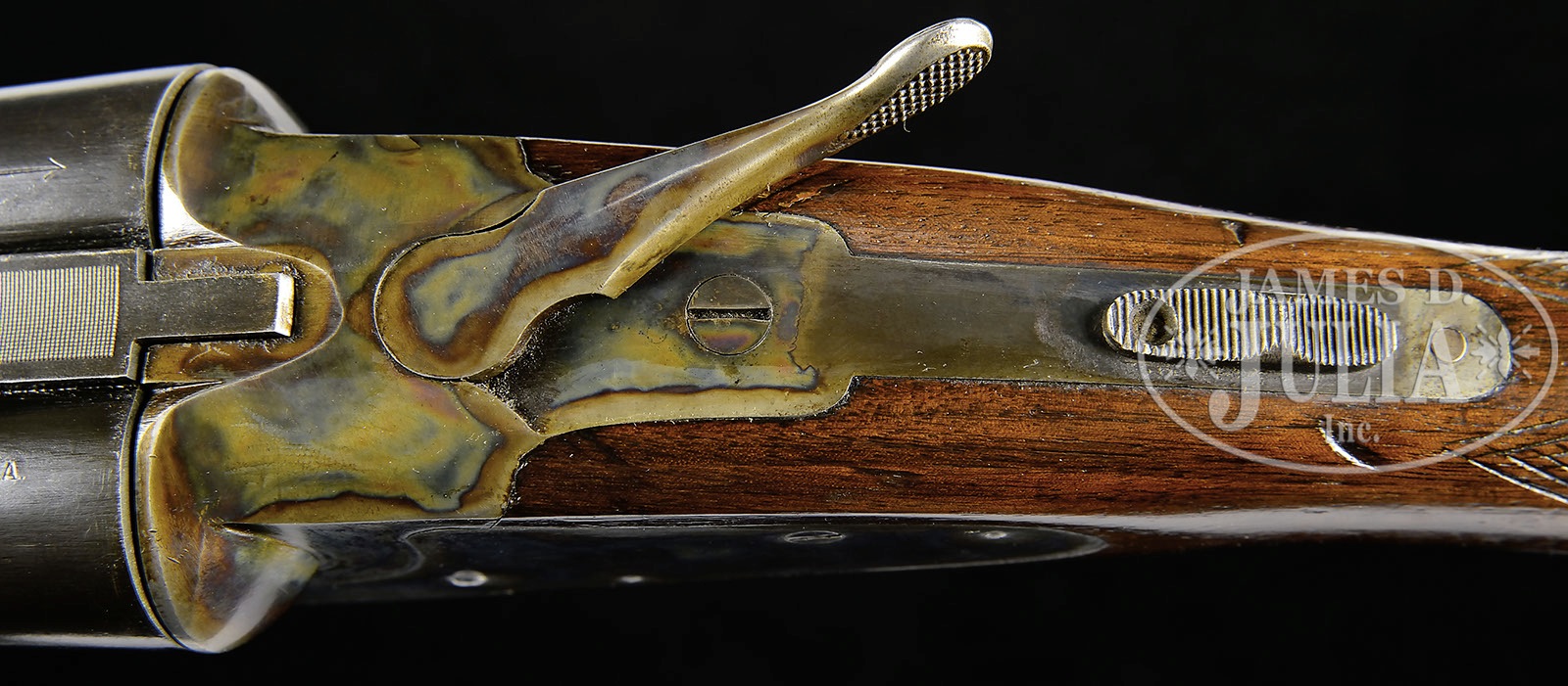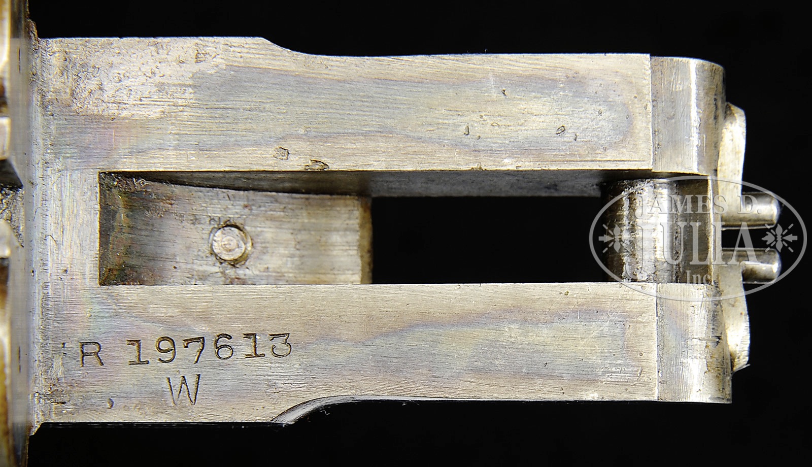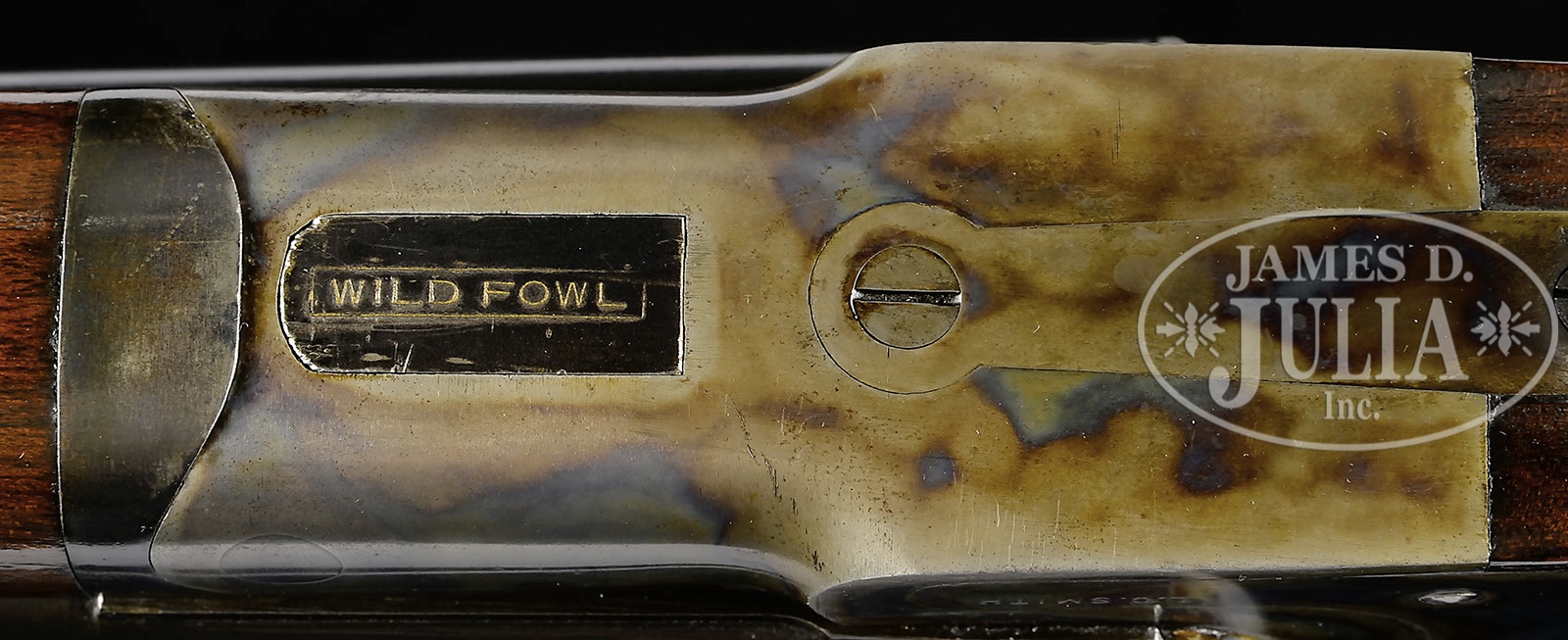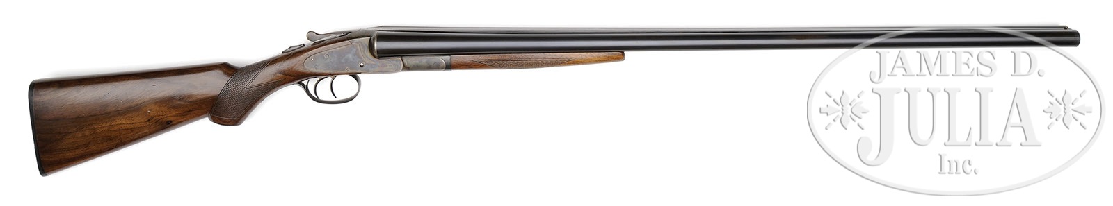 *HIGH CONDITION “WILD FOWL” L. C. SMITH FIELD GRADE WITH 32 INCH BARRELS.SN R197613. Cal. 12 ga. 3″ Chambers. 32″ Bbls with concave, matted rib, are marked “L. C. SMITH – Field GRADE” and “HUNTER ARMS CO. INC. M’F’R’S – FULTON, N.Y. U.S.A.” on tops. Bbl flats are stamped with “W”, SN, “CHAMBERS 3 INCHES”, and Hunter proofs. Bottom of lump is stamped “WILD FOWL”. Bottoms of bbls are stamped “ARMOR STEEL”. Typical, case hardened standard weight action is stamped with SN and “W” on water table, features automatic safety and double triggers, and is unengraved. “L. C. SMITH” is stamped on the front of each lockplate. Plain American walnut capped pistol grip buttstock measures 14″ over ribbed composition buttplate. Point pattern checkering with beaded borders is at grip. Matching splinter forend has J-spring release. Bore diameter at muzzles: left-.730, right -.727. Bore restrictions: left- .031 (Full), right-.032 (Full). Minimum wall thickness: left -.040, right -.039. Drop at heel: 2-7/16″, drop at comb: 1-9/16″. Weight: 8 lbs. 1 oz. LOP: 14″. PROVENANCE: Estate Collection of John Houchins. CONDITION: Excellent. Bbls have a few light marks. Action has slight edge wear, but retains nearly all of its orig color hardening, with some light spots. Trigger guard is slightly silvered on bow and flaked at grip. Stocks retain nearly all of their orig finish, with added oil as maintenance over some marks and scuffs. Bores are excellent. Action tight. A scarce long barreled L. C. Smith (most of this type are marked “long range”). 4-50906 MGM242 (2,250-4,250) – Lot 3483