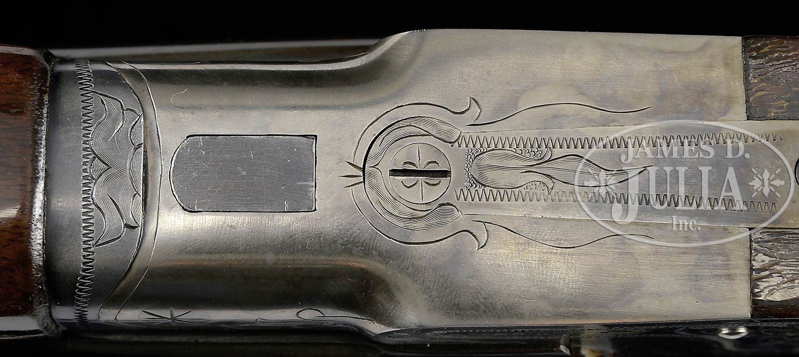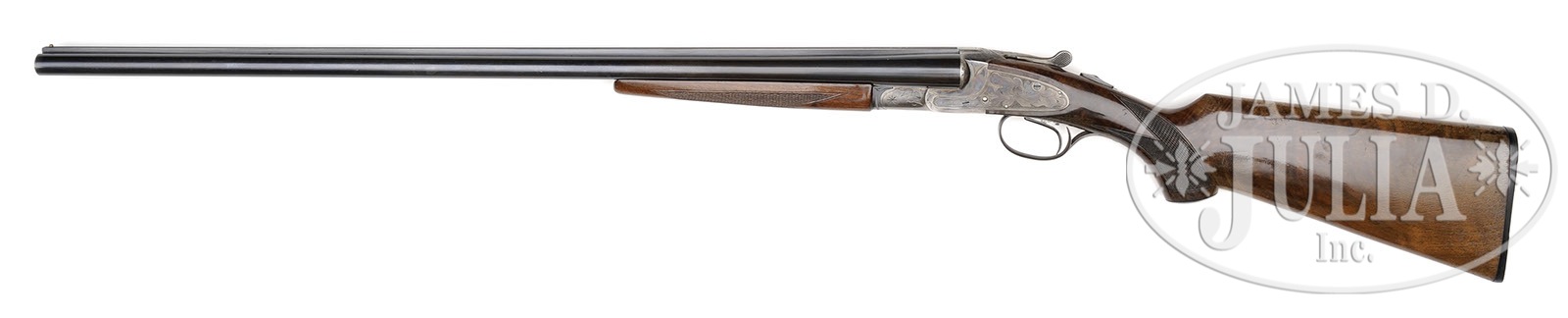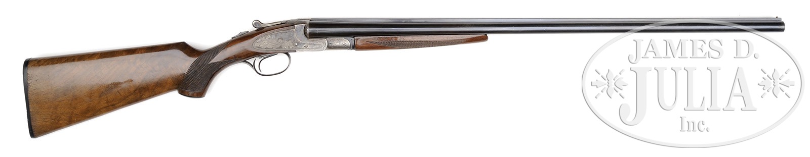 *AS FOUND 20 GAUGE L. C. SMITH IDEAL GRADE.SN FWS9051. Cal. 20 ga. 2-3/4″ Chambers. 28″ Bbls with raised, matted, single sighting plane rib are marked “L. C. SMITH Ideal GRADE” on top of right bbl. Bbl flats are stamped with SN, grade, and Hunter proofs, bottoms of bbls with “LONDON STEEL”. Typical featherweight action with non-automatic safety and Hunter One Trigger, is engraved in typical “Ideal” style with large acanthus leaves in stippled background with some flourishes of scroll and wiggle borders. American walnut capped pistol grip buttstock with exceptional flame grain on left side, but with only vestiges of that grain on right, measures 13-7/8″ over ribbed composition buttplate. Point pattern checkering is at grip. Matching full splinter forend has oval secondary release escutcheon. Bore diameter: left-.610, right -.610. Bore restrictions: left -.027 (Full), right -.020 (Mod). Minimum wall thickness: left -.042, right -.043. Drop at heel: 2-3/8″, drop at comb: 1-3/8″. Weight: 6 lbs. 14 oz. LOP: 13-7/8″. CONDITION: Excellent. Bbls retain 90 – 95% orig blue, thinning from finger wear around forend. Action retains approx 80% of its orig case hardening color, smoothly silvered on bottom. Lockplates retain nearly all of their color. Stocks retain nearly all of their orig finish. Finish on buttstock has crazed overall, with a few areas lifted. Bores are excellent. Action is tight. 4-49540 MGM73 (2,000-4,000) – Lot 3484