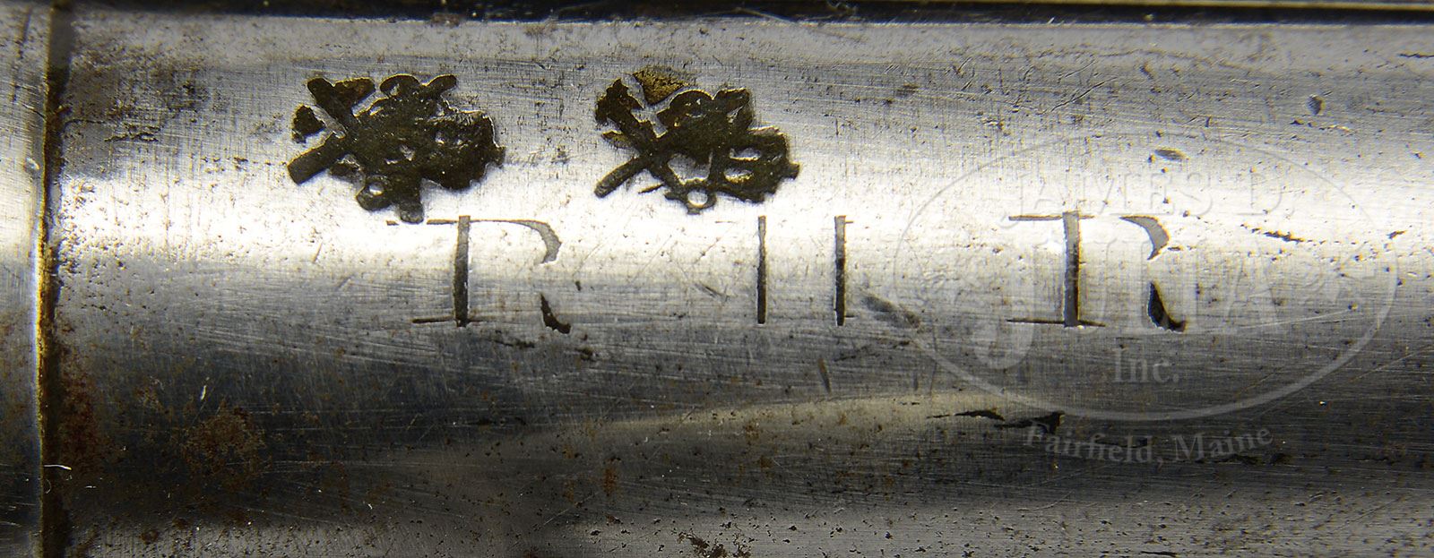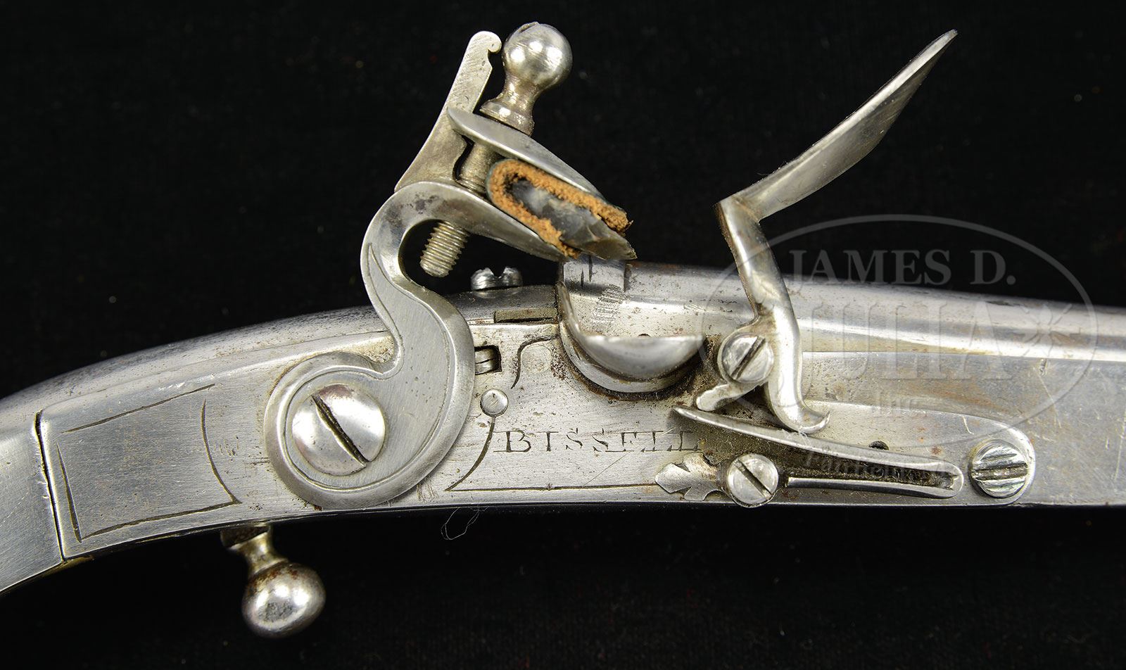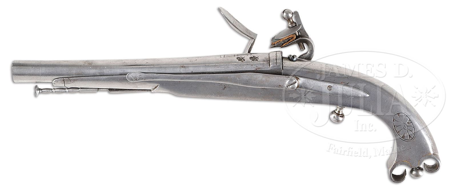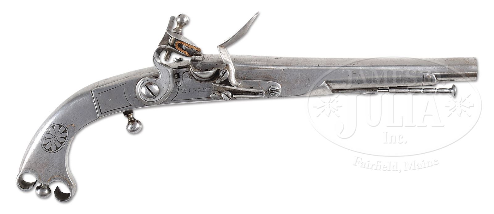 SN NSN. Cal. .560 muzzle diameter. 8″ Tapered round bbl, Pistol is 13″ overall. Bbl has Birmingham proofs at breech end, and top of breech section is engraved “RHR” (Royal Highland Regiment ? … possibly 43rd Regiment of Foot, with a long and illustrious career starting in America, during the French and Indian Wars, as well as the American Revolution. The regiment evolved into the Black Watch in 1881). Typical Scottish flintlock with unbridled friction frizzen (spring with fleur-di-lis finial), has plain line border engraving, and is also engraved “BISSELL” under pan (Most probably a Bissell, with no first name listed, working in Leith, Edinburgh 1741-70). Very plain, all steel stock with rams horn butt, plain belt hook, ball trigger, and ball shaped pricker in butt, is engraved with floral ovals on each side of grip. Turned steel ramrod mounts through plain pipe. PROVENANCE: Collection of Dr. Douglas Sirkin. CONDITION: Very good, with all parts cleaned to pewter gray, with light flecking and pitting. Some lock parts possibly replaced. Ramrod and pricker are well done modern replacements. 4-50117 MGM301 (8,000-12,000) – Lot 3484