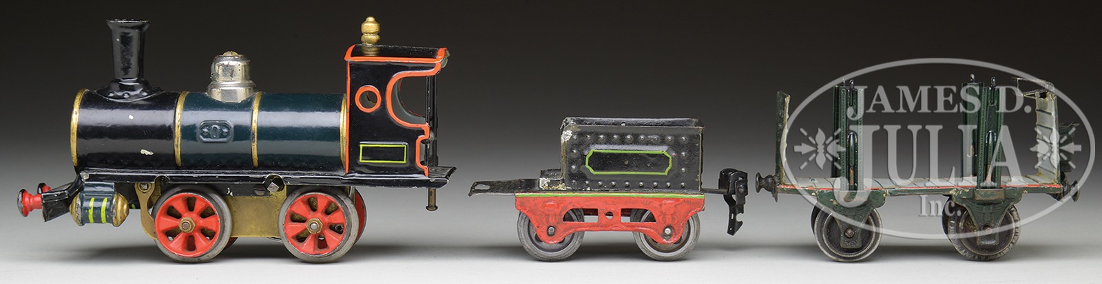 EARLY O-GAUGE MARKLIN ENGINE, TENDER & FREIGHT CAR.An early style Marklin locomotive, circa 1900-1910 with cast steam chests, 0-4-0 outline, and clockwork motor. Stake body car is unusual with tall stakes and high front and rear walls that include steps to a seat on top of rear wall. Overall total restoration to locomotive with some touch up to red framework on tender. SIZE: Overall 15-1/2″ l. CONDITION: Clockwork mechanism untested but appears intact and operational. Replaced cast wheels on tender. 1-14184 (500-1,000) – Lot 3485 Auction: Advertising, Toy & Doll - Spring 2014 Please Note: All prices include the hammer price plus the buyer’s premium, which is paid by the buyer as part of the purchase price. The prices noted here after the auction are considered unofficial and do not become official until after the 46th day. |