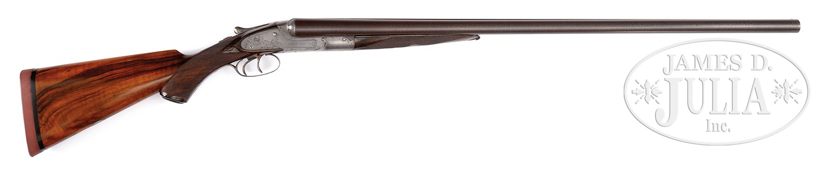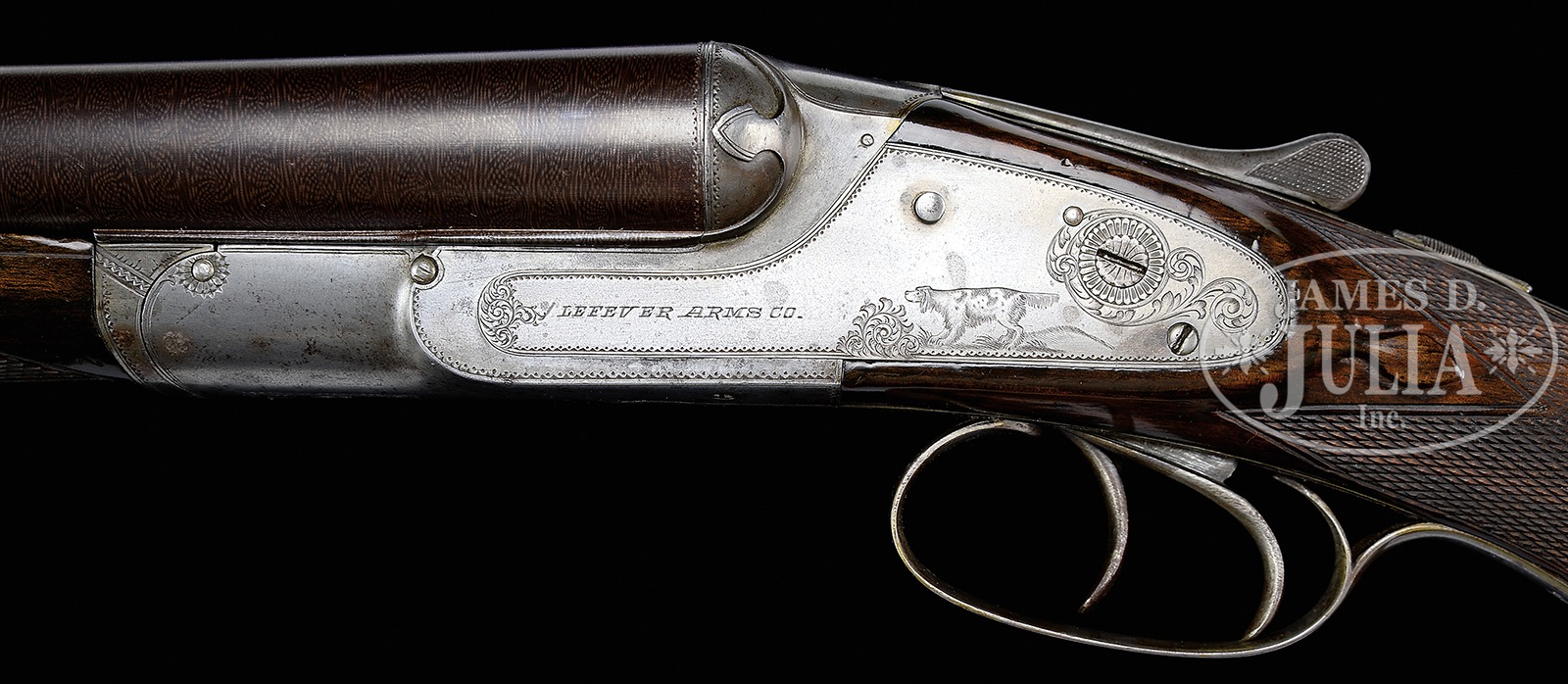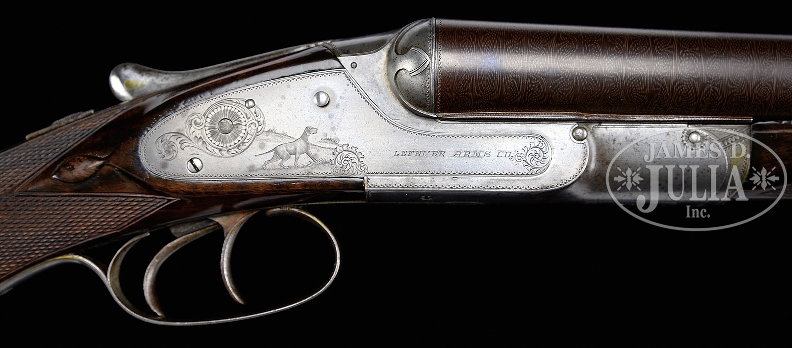 SN 9766. Cal. 12 ga. 2-7/8″ Cham. (likely for brass cartridges). 30″ bbls full length lightly matted Damascus top rib with brass front bead marked “LeFever Arms Co. Makers & Patentees. Syracuse. N.Y.” Water table marked with SN and grade stamping “D”. Front of frame with cocking rods. This gun is an early pivot opener with beautiful dark streak fiddleback buttstock. Double nickel plated triggers, extractor and auto safety. Cocking indicators on sides of lock plate. Capped full pistol grip buttstock checkered in 2-point pattern with teardrop behind lockplates and nickel oval near toe. Silvers type modern recoil pad with 1/4″ black spacer. Splinter forearm with push button type release checkered in 2-point pattern with carved horn tip. Frame is lightly engraved with setter in hill scene on left, pointer in field scene on right accented by light scroll and both lock plates marked “LeFever Arms Co.” at front. Balance of receiver lightly border engraved. Patent dates noted on trigger plate and light burst of scroll on trigger guard which extends full length to pistol grip cap. SN noted at tang. Fences are nicely sculpted with single round arrow. Bore diameter: left – .768, right – .765. Bore restrictions: left – .046 (full), right – .043 (full). Minimum wall thickness: left – .032, right – .033. Weight: 7 lbs. 13 oz. Drop at comb: 1-7/8″, drop at heel: 3-1/8″. LOP: 14-1/16″. PROVENANCE: Private Single Owner Advanced LeFever Collection. CONDITION: Very good. Bbls are excellent as restored and retain nearly all of their bold and gorgeous Bernard pattern. Receiver is gray with minor spotting on belly of frame. Buttstock and forearm are excellent retaining most of a restored finish and a couple of minor areas of grain knot repair, one near toe and one near tip of forearm. Bores are very good with light orange peel and a couple of beginning pits. Mechanics are very good. Top lever is a touch loose as is forearm. A scarce LeFever with striking bbls and unusual in a “D” grade. 51051-13 JSL (1,500-2,500) C&R – Lot 3486