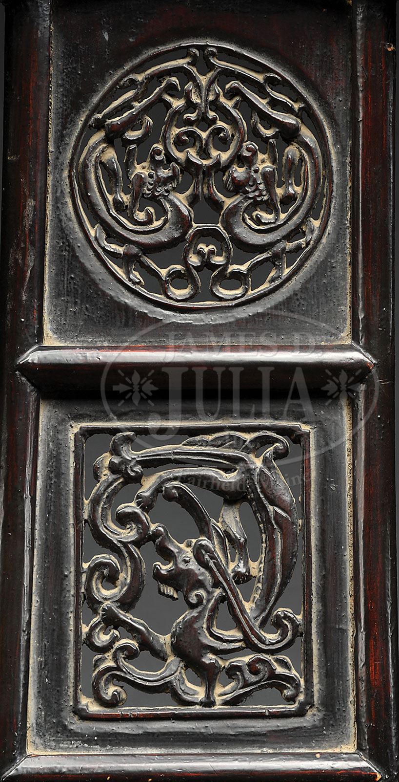 PAIR OF HORSESHOE BACK ARMCHAIRS. 18th century, China. Pair of horseshoe back armchairs having backsplats carved with dragons, and archaic scrolling around the sides. SIZE: 41″ h x 24″ d x 28″ w with seat 21″ h. PROVENANCE: From a private New York State collection. CONDITION: As found. Mostly original lacquer remaining. 9-92506 (600-800)