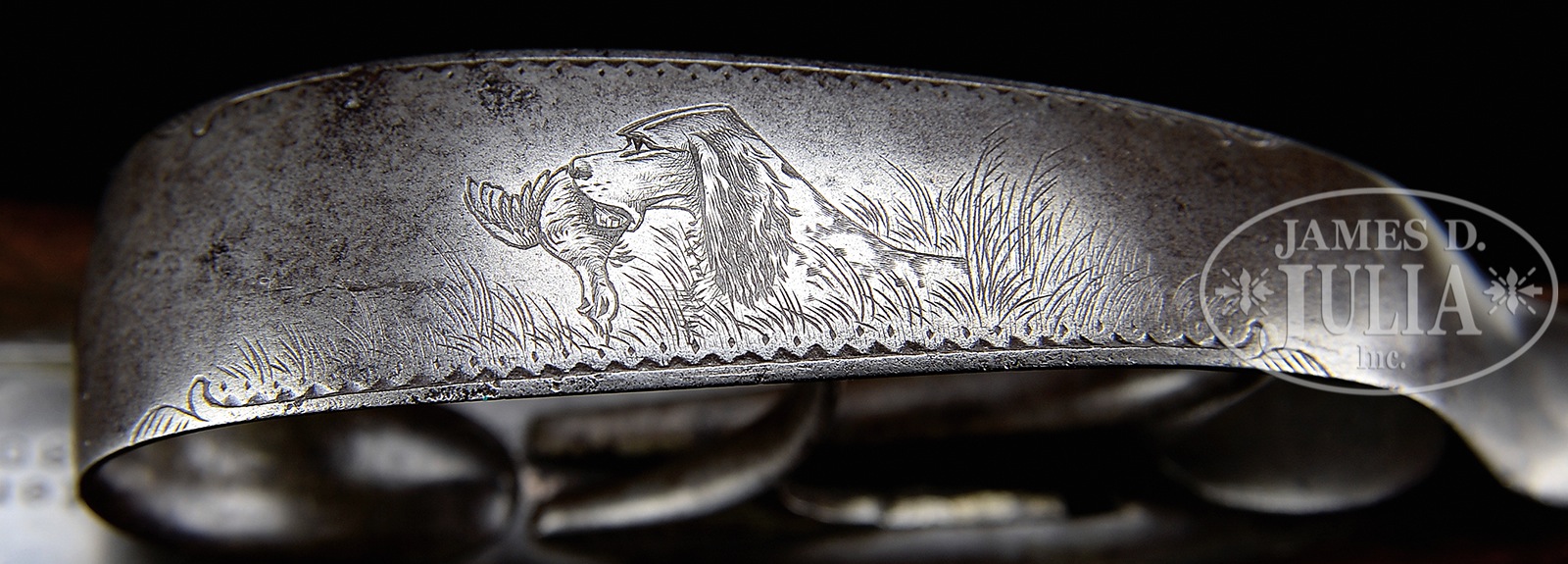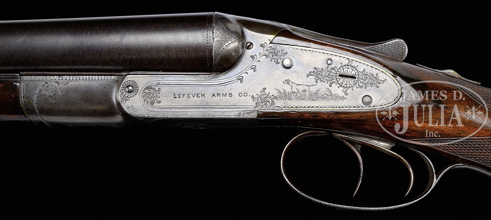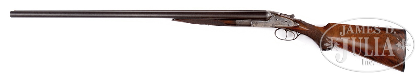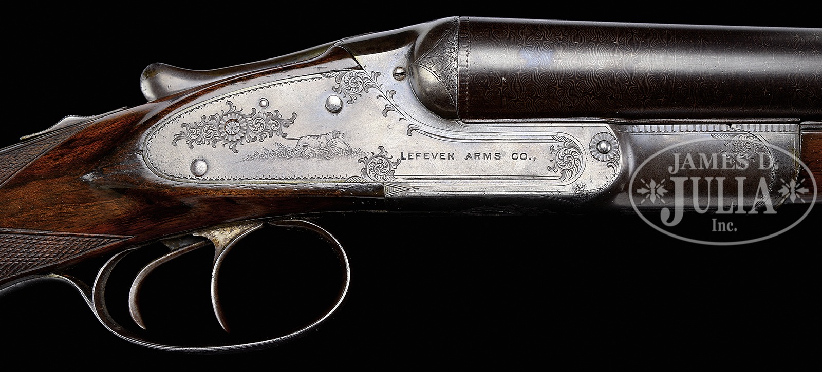 *LEFEVER EE SPECIAL ORDER GAME GUN.SN 23195. Cal. 12ga. 29-1/4″ bbls (appears orig), 2-5/8″ Cham, full length matted top rib with brass front bead. Water table marked with SN on right flat, no grade marking noted. Double triggers, auto ejectors, auto safety. Capped full pistol grip buttstock, checkered in classic 2-point pattern with fancy grain towards butt which is finished in finely fitted horn heel and toe plates. Splinter forearm checkered in 2-point pattern with push button release and steel tip are lightly engraved. Lockplates are lightly scroll engraved with pointers in field scenes on both sides and stamped “LeFever Arms Co.” Bottom of frame with lovely burst of scroll around trigger plate. Patent dates noted on trigger plate. Trigger guard is nicely engraved with what appears to be a cocker spaniel soft mouthing a quail to return to its shooter. SN at tang. Bore diameter: left – .737, right – .737. Bore restrictions: left – .014 (LM), right – .012 (LM). Minimum wall thickness: left – .038, right – .036. Weight: 7 lbs. 9 oz. Drop at comb: 1-1/2″, drop at heel: 2-1/4″. LOP: 14-3/16″. PROVENANCE: Private single owner advanced LeFever Collection. CONDITION: Excellent as partially refurbished. Bbl retains most of their professionally restored bold and vivid Damascus pattern. Receiver has toned mostly gray with a hint or two case color in protected areas. Buttstock and forearm rate very good and retain most of a professionally restored finish. Left side of buttstock with grain separation towards heel measuring approximately 2-3/4″ long. Horn heel and toe plates appear orig and are well fitted with minor losses. Bores are very good with some beginning roughness in right tube, more so than left. Mechanics are very good, ejectors are in time. 51051-12 JSL (1,500-2,500) C&R – Lot 3488