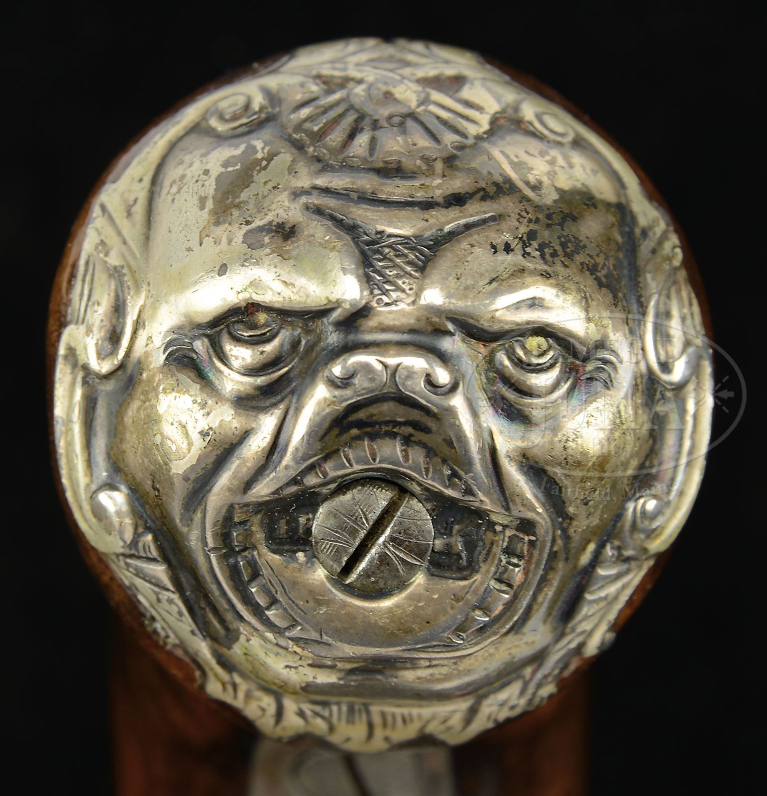 FINE CANNON BARRELED SCREW OFF QUEEN ANNE OFFICER’S PISTOL BY RICHARD WILSON.SN NSN. Cal. .583. 5-1/2″ Steel bbl turned with cannon style rings, has dismounting lug on bottom. Boxlock breech section with integral pan, bridled friction frizzen, serpentine round bodied cock, and intricate, nicely filed frizzen spring which curls under pan, has unusual armorial engraving at breech end, depicting clubs and arrows surmounted by “LONDON”. Bottom of breech section is stamped with early London gunmakers proofs, “RW” and is engraved “Wilson” (Richard Wilson working 1730-1766). Nicely streaked European walnut stock has shell carving behind top tang, and is silver mounted. Mounts include intricately filed side plate depicting stand-of-arms, crest plate at grip over flag surmounted by helmet, and a grotesque mask on butt, hallmarked for sterling, and with makers mark “IF” (John Fray, whose mark was registered in 1748). No other hallmarks noted. PROVENANCE: Collection of Dr. Douglas Sirkin. CONDITION: Good. Iron and steel parts cleaned to a lightly pitted silver gray. Stock refinished with glossy oil. Silver mounts are fine, lightly rubbed, beginning to tone where oil finish is rubbed through. Lock and frizzen are excellent. A neat early pistol by this highly regarded maker. 4-49997 MGM251 (5,000-8,000) – Lot 3490 Click here to view provenance