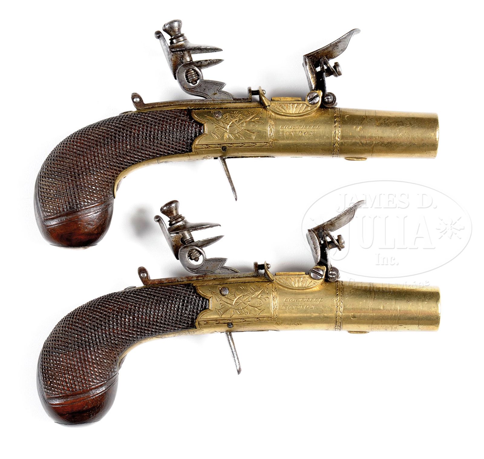 GOOD CASED SET OF ENGLISH BRASS FRAME FLINTLOCK BOX LOCK POCKET PISTOLS BY PHILLIP BOND, CORNHILL, LONDON CIRCA 1795.SN NSN. The brass rounded box lock frames are engraved with trophies of arms and signed at the breeches, ‘P. Bond’, and ‘Cornhill, London’. The round turn off barrels are engraved at the joint with a roped design. London viewed and proved marks are present. Cocks are line engraved. Walnut butts are finely checkered with silver buttcaps. Case is mahogany with very fine miniature leather covered flask and steel bullet mold. Notes: A fine set of flintlock pocket pistols by one of the better London makers and the flask is a rarity. PROVENANCE: C.W. Slagle; Collection of Dr. Douglas Sirkin. CONDITION: Brass frame and barrels are good with clear engraving and markings. Checkered butts are fine overall. Case is good and original but has been relined in correct, dark green felt. 4-49867 (2,500-3,500) – Lot 3491 Click here to view provenance