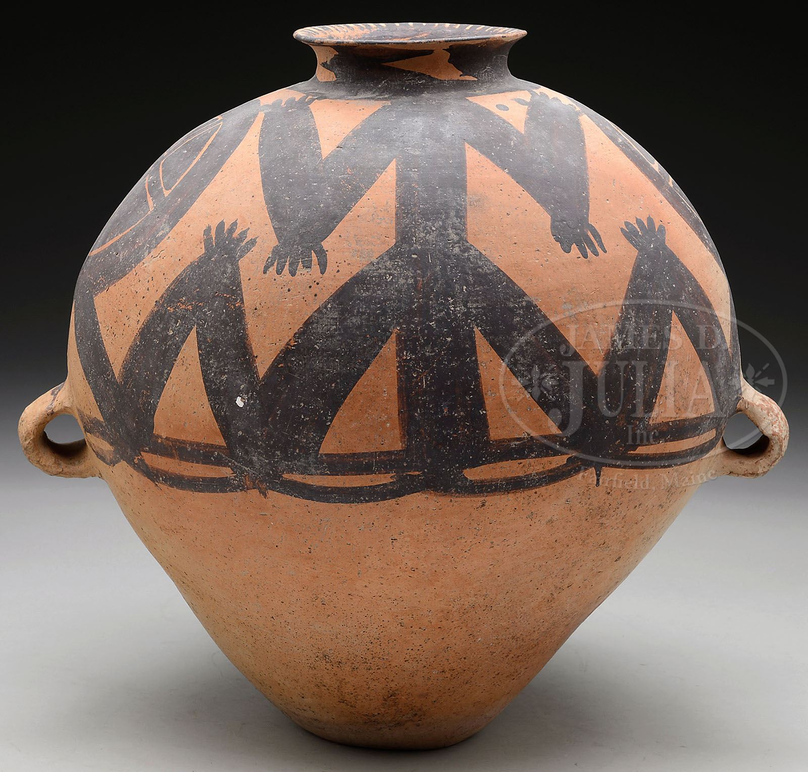 STONEWARE STORAGE JAR. Neolithic Period (2nd century B.C.), China. Yang Shao culture. Various anthropomorphic and geometric designs in red and black/brown color. SIZE: 16″ h x 17″ dia. PROVENANCE: From a private New York State collection. CONDITION: Generally very good with age wear. 9-92689 (800-1,200)