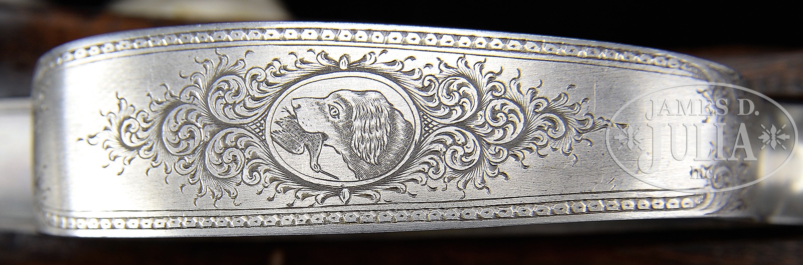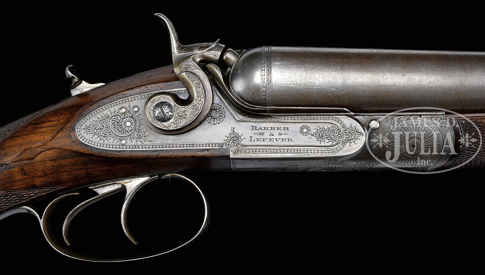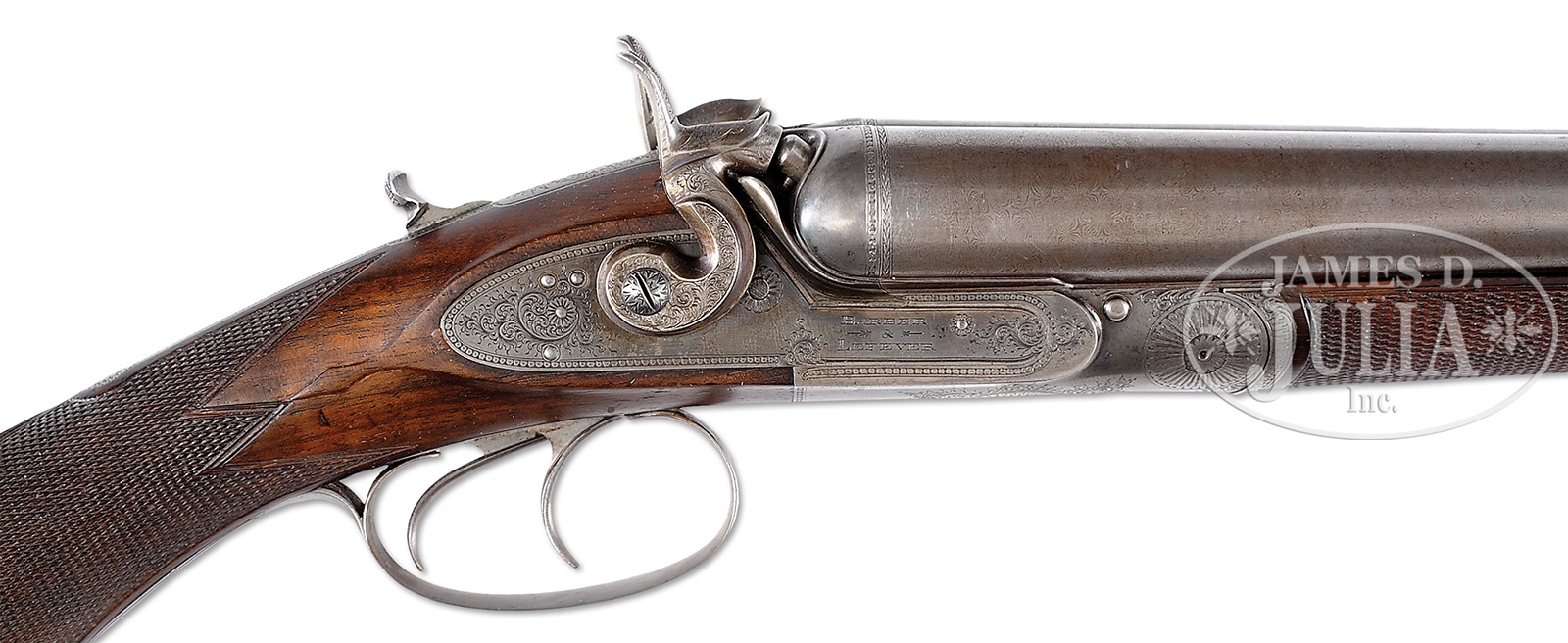 TRULY EXCEPTIONAL DOCUMENTED BARBER & LEFEVER HIGH GRADE HAMMER GUN.SN 164. Cal. 10 ga. 3″ Chambers. 31″ High grade 7-blade Damascus bbls. Full length Damascus top rib with brass front bead marked “D.M. Lefever, Successor to Barber & Lefever, Syracuse N.Y.” Water table marked with SN and “Lefever PAT’D Sept. 3, 1872”. Dbl triggers, extractor, no safety. Thumb push opener. Buttstock is highly figured with fiddle back and checkered in fine 3-point pattern and fully checkered around ball grip with approximately dime sized gold inlaid game scene engraved grip cap. Fine arrow point sculptured in stock behind lockplates. Near fully checkered splinter forearm with Deeley latch and internal plunger release is finely engraved in shell pattern towards breech and floral pattern and knurled towards muzzle. Receiver is finely scroll engraved with flowing scroll and chain link border pattern and marked “Barber & Lefever” at front of lockplates. Hammers are extremely fine and sculptured with scroll engraving and serpent engraved on tops near firing pins. Top strap is finely scroll engraved with chain link border pattern and floral screw heads. Bottom of receiver is tastefully scroll engraved with approximately 50% coverage and is finely filed and wave sculptured. Trigger guard bow with bust of dog soft mouthing a woodcock to return to its owner surrounded by tastefully executed scroll and chain link border pattern. This exact gun is pictured on pgs 24-27, of Lefever: Guns of Lasting Fame, by Elliott and Cobb. Bore diameter: left – .787, right – .780. Bore restrictions: left – .024 (mod), right – .016 (light mod). Minimum wall thickness: left – .040, right – .044 . Weight: 8 lbs. 15 oz. Drop at comb: 2-1-16″, drop at heel: 2-7/8″. LOP: 13-7/8″. PROVENANCE: Lifetime Lefever Arms Collection of Scott Lefever. CONDITION: Extremely fine. Bbls retain 70-80% vivid bold contrast Damascus pattern, toned in grip area towards breech. Receiver retains 40-50% nice orig case hardening with dark flashes of color visible on both lockplates and at top of frame, toned towards bottom and front of frame, though trigger plate retains most of its orig case color. Trigger guard, bow and tang have toned to a pleasing gray/silver. Buttstock and forearm are exceptional as restored, checkering re-cut many years ago and excellent overall. Bores are excellent with scattered light pitting. Action is tight. Hammers are crisp. Screw heads are all excellent and unmarred. In nearly 30 years of studying Lefever’s this is the finest example of a Barber & Lefever this cataloger has examined. This extremely rare high grade gun has not been offered publicly in more than 25 years. 50254-4 JSL (8,000-12,000) – Lot 3492
