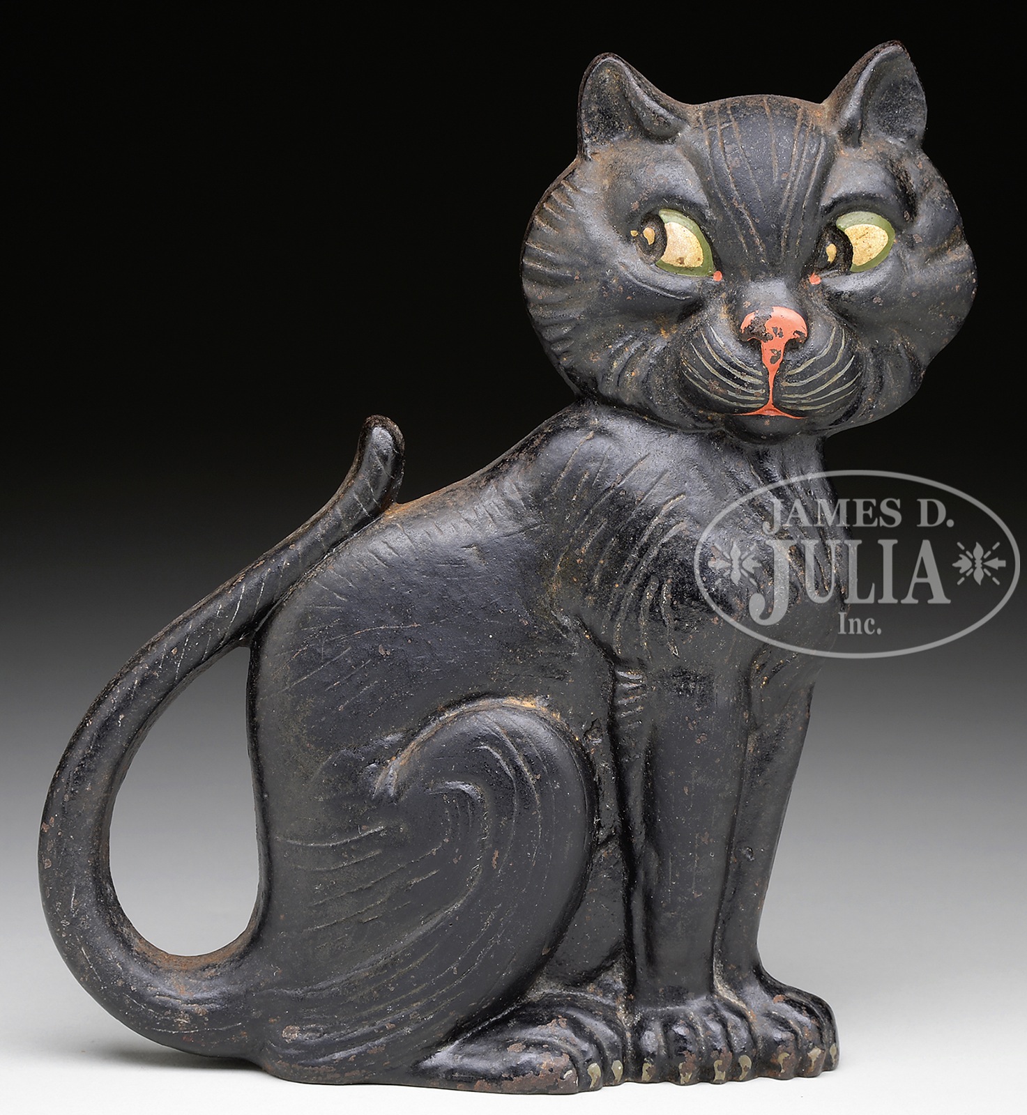SITTING CAT DOORSTOP.Circa 1927, A.M. Greenblatt Studio, Boston MA. Embossed “COPYRIGHT 1927, A.M. GREENBLATT STUDIOS 20″ on backside. Flattened half round hollow casting on integral wedge base retaining original paint. Reference: The Doorstop Book: The Encyclopedia of Doorstop Collecting by John C. Smith and Nancy M. Smith page 118. SIZE: 9″ h x 8-3/4” w. CONDITION: Minor abrasions in very good untouched condition. 49140-56 (400-800) – Lot 3493