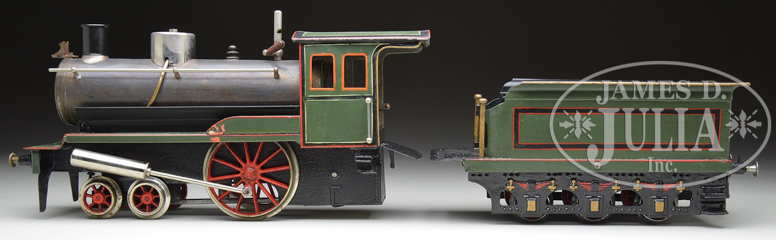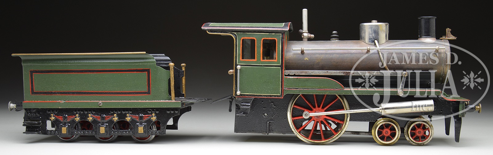 CARETTE LARGE GAUGE ENGINE & TENDER.Seldom does one have an opportunity to buy large gauge trains in any condition. This particular piece appears to have an excellent overall restoration and at first glance one could perceive the piece to be in choice original condition. Fine crazing to the coloring and some bubbling to the paint give this toy an original look. Technically it’s a 4-2-0 outline with the large steam driven drive wheel engaged by a cylinder connected to the steam boiler. The tender is also massive, being six wheels. At one point in time, the boiler would have had a light on the front, and although the bracket is there, the somewhat elaborate light is missing. At the rear of the boiler at the front of the engine cab is a lever to activate the whistle. SIZE: 22″ l overall with 2-1/4″ wheel width. CONDITION: Tender wheels are possibly older cast replacements. 1-14181 (2,500-4,500) – Lot 3495 Auction: Advertising, Toy & Doll - Spring 2014 Please Note: All prices include the hammer price plus the buyer’s premium, which is paid by the buyer as part of the purchase price. The prices noted here after the auction are considered unofficial and do not become official until after the 46th day. |