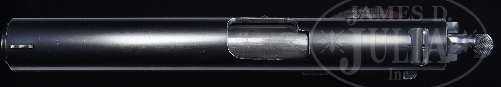 *FINE COLT GOVERNMENT MODEL SEMI-AUTO PISTOL.SN C118678. Cal. 45 ACP. Blue finish with orig commercial 5″ bbl, fixed sights with standard markings on slide and Rampant Colt in the left center. Frame is marked “GOVERNMENT MODEL” on the right side above the SN. Bottom of bbl and top rear flat of frame are marked with small “S” inspector initials. It has short grip safety spur and long hammer spur. Mounted with diamond checkered walnut grips and accompanied by a two-tone military magazine with unmarked base plate. Right side of magazine is scratched with the initials “CBP”. This pistol was produced in 1919 after the cessation of hostilities of WWI. Pistols of that era are rarely found today with high orig finish. They often were owned by law enforcement officers and occasionally were carried by military personal through WWII. CONDITION: Very fine. Overall retains 96-97% strong commercial finish showing only light front edge wear on the slide with a few other very minor nicks & scratches. The front strap shows very minor thinning & light scratches and light thinning on the spring housing. Grips are sound with a few chipped diamonds on right side and show light diamond point wear. Magazine is equally fine. Mechanics are crisp. Brilliant shiny bore. 49130-1 JR C&R (5,000-8,000) – Lot 3497