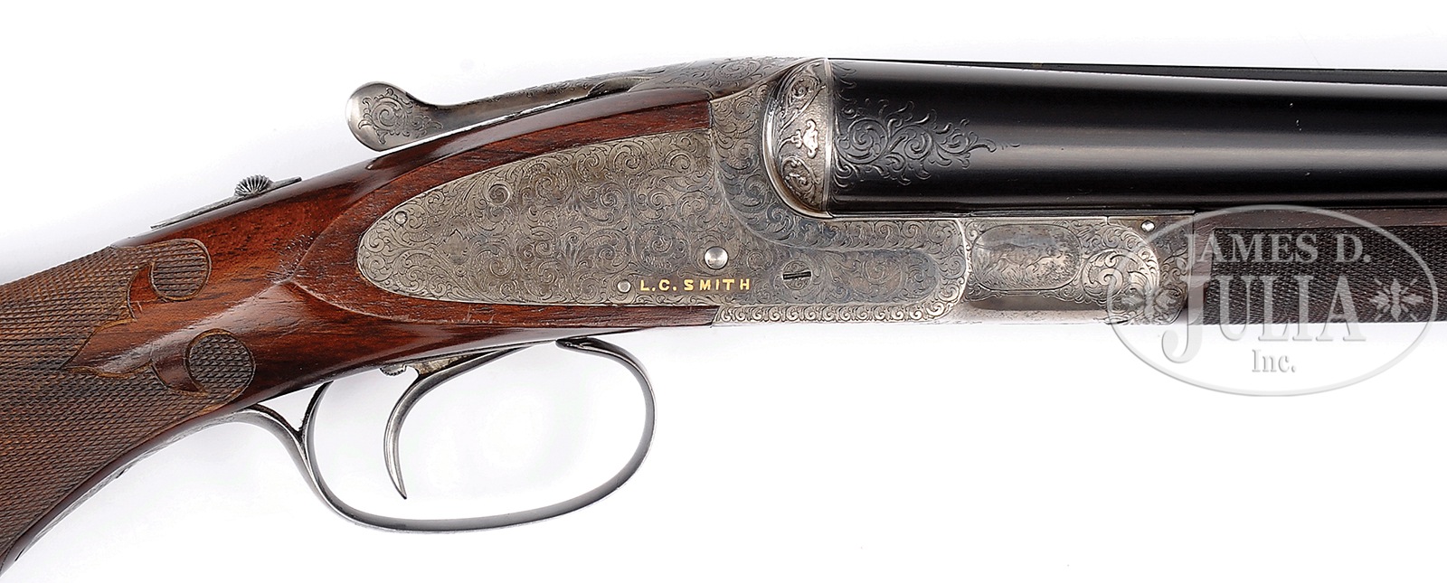 *TRULY EXCEPTIONAL INVESTMENT QUALITY L.C. SMITH A2 GRADE 16 GAUGE SHOTGUN TWO BARREL SET.SN 211550E. Cal. 16 ga. Bbl set #1)26″ 2-3/4″ chambers with full length matted top rib and brass front bead marked on right bbl “Sir Joseph Whitworth Fluid Compressed Steel and marked on left “Made to Order by the Hunter Arms Co Fulton N.Y.”. Top rib with small gold bar and scroll engraved at extension 1″ wedge of scroll engraving. Bbl set #2) 26″ 16 ga. 2-1/2″ chambers and marked as bbl set #2 on forearm lug, otherwise identical to #1. Hunter One SST, automatic ejectors, non-automatic safety. Water table with SN on right, pattern dates on left and jeweled bbl flats with SN on left tube. Both sets of bbls with Whitworth trademark stamp on bottom and grade designation and bbl # on forearm lug. Round knob full pistol grip buttstock of fabulous lightly colored European walnut checkered in fleur-de-lis pattern around grip. Ball grip with panel and wave pattern extending towards comb. Orig lined HRBP. Both splinter forearms are near fully checkered in fleur-de-lis pattern with banjo rounded roll-type release and triangular ebony tips. Receiver is fabulously engraved. Lockplates in full A-2 4th variation floral & scroll engraving and marked in gold “L.C. Smith”. Front of receiver with small game scene, pointer on right, setter on left. Bottom of receiver nicely scroll engraved as is trigger guard bow and tang with SN in banner. Beaded fences are nicely sculpted in floral pattern and top of frame, top lever and top tang with well executed bursts of floral scroll. Back of top tang with “S” in gold for safety. Housed in a full leather 2 bbl set case with green felt lining and unengraved brass shield on top. Included in the case is a cleaning rod and a nickel plated oil bottle. Bbl set #1 .652 (both bbls). Bore restrictions: left – .011 (mod), right – .010 (mod). Minimum wall thickness: left – .040, right – .041 . Weight: 6 lbs. 10 oz. Drop at comb: 1-11/16″, drop at heel: 2-5/8″. LOP: 13-15/16″. Bbl Set #2) Bore diameter: left – .652, right – .652. Bore restrictions: left – .010 (mod), right – .005 (imp/cyl). Minimum wall thickness: left – .037, right – .033 . Weight: 6 lbs. 7 oz. CONDITION: Exceptionally fine and investment quality. Bbl set #1 retains 98% of an old restored blued finish. Bbl set #2 retains 98% of its orig toned blued finish. Engraving is sharp. Buttstock is superb and orig, checkering appears to have been chased many years ago with some added finish to butt for preservation. Forearms are excellent and orig and retain most of their orig finish, checkering is sharp. Receiver is very fine retaining most of its orig case hardened finish, overall in the 80-85% range, toned near lug vivid and elsewhere though hidden by deep cut engraving. Trigger guard is excellent and retains approximately 60% of its orig high polish blue, toned at tang rich and dark at bow. Screws are excellent and this gun has seen relatively little use. Bores are near mirror in both sets. Case is excellent with some staining and edge wear in leather. This is an investment quality high grade small bore L.C. Smith. One of approximately 7 made A2 16 gauges and 1 of only 3- 16 gauge 2 bbl sets. This one being the only one with orig 26″ bbls. according to “L.C. Smith The Legend Lives by Houchins”. 51102-1 JSL (40,000-70,000) – Lot 3498