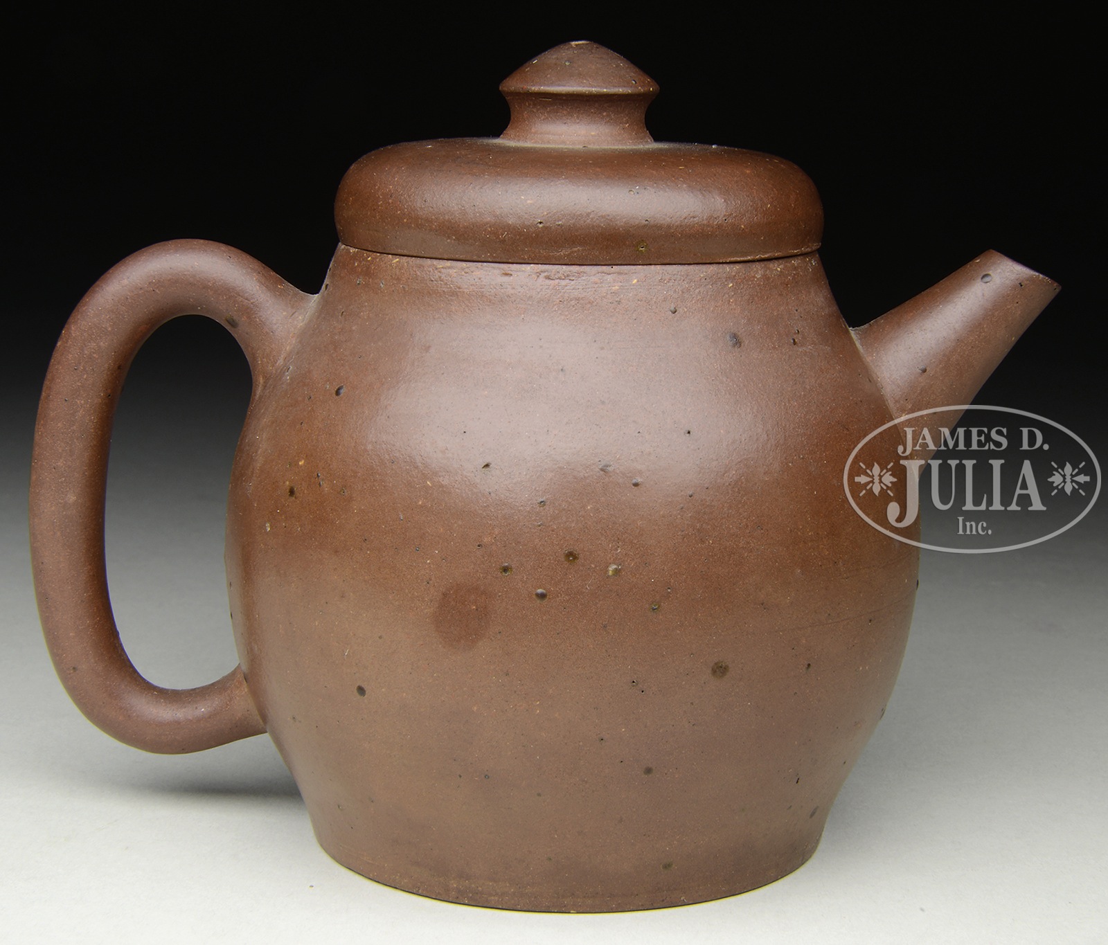 YIXING PURPLE CLAY TEAPOT BY MINGYUAN.China. Of tall barrel form, the teapot with bulbous body, straight spout, ear-like handles, and conical finial, deep patina, the bottom bears two character signature “Ming Yuan”. SIZE: 4-1/4″ (10.8 cm) h x 5-1/4″ (13.4 cm) w. CONDITION: Good. 9-96913 (6,500-8,500) – Lot 3503