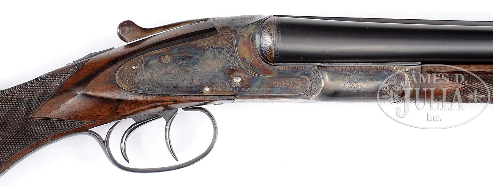 *SCARCE L.C. SMITH 4E 16 GA SHOTGUN.SN 203845. Cal. 16 ga. 28″ fluid steel bbls with 2-1/2″ Cham. Full length matted rib with twin “certifiable antique ivory” beads and small gold bar near breech and marked “Hunter Arms Co. Fulton, N.Y.” Water table marked with SN and grade designation “4E” and same markings on left bbl flat. Finely polished blued double triggers, auto ejectors, auto 3-position safety. Capped full pistol buttstock checkered in 2-point pattern with nicely figured French walnut ending in lined HRBP. Splinter forearm with roll type banjo release checkered in 5-point pattern with triangular ebony tip. Finely engraved in typical Grade 4 pattern with setter in wooded game scene on left, pointer in brushy field scene on right all surrounded by light scroll work. Both side locks marked L.C. Smith at front. Balance of receiver is nicely scroll engraved with approximately 40% coverage. Trigger guard bow is nicely engraved with two quail in field in oval with light scroll and border engraved at tang with SN noted. Fences are lightly engraved and small area of engraving at breech. Bore diameter: left – .670, right – .670. Bore restrictions: left – .038 (full), right – .020 (MOD). Minimum wall thickness: left – .018, right – .020. Weight: 6 lbs. 7 oz. Drop at comb: 1-3/4″, drop at heel: 2-15/16″. LOP: 13-5/8″. PROVENANCE: Private single owner advanced LeFever Collection. Special Note: This item(s) contains plant or animal properties that may be covered by the Endangered Species Act (ESA). We have taken care to ensure that this item(s) meets the standard for sale under the ESA. However, certain states and other countries have laws that are more restrictive than the ESA. It is the bidder’s responsibility to ensure that it is lawful to purchase or transport this item(s) into their state, and to obtain the necessary import and export approvals. Delay or failure to obtain any such permit or approval does not relieve the buyer of paying for the item(s) and consummating the purchase. CONDITION: Exceptionally fine. Has been completely and competently restored. Bbls retain nearly all of an expertly restored fine quality rust blue which is just starting to tone and age. Receiver retains virtually all of its near perfectly duplicated restored case colors. Buttstock and forearm are excellent to near mint as restored with minor handling marks and a couple of light scratches. Beginning wood separation on right side of stock at grip. Checkering is crisp throughout. Buttplate is near excellent. Trigger guard retains most of its restored blue finish particularly bright on bow starting to tone at grip. Bores are excellent near mirror. Mechanics are crisp. Ejectors in time. This gun could easily pass as near mint and all orig without the very closest of inspection. The restoration work is truly superb. 51051-7 JSL (5,000-8,000) C&R; IVORY – Lot 3503