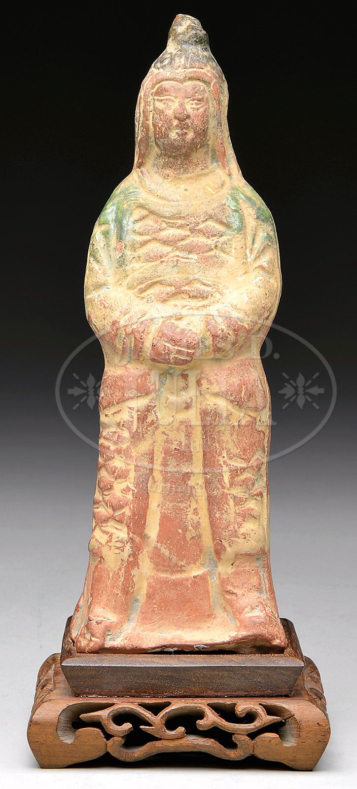 POTTERY TOMB FIGURE. Ming Dynasty (1368-1644), China. Figure of a standing warrior with green glaze. SIZE: 9-1/4″ h. CONDITION: Slight color and glaze remains in areas over the slip applied to the underlying brown terra cotta body. 9-92720 (700-900)