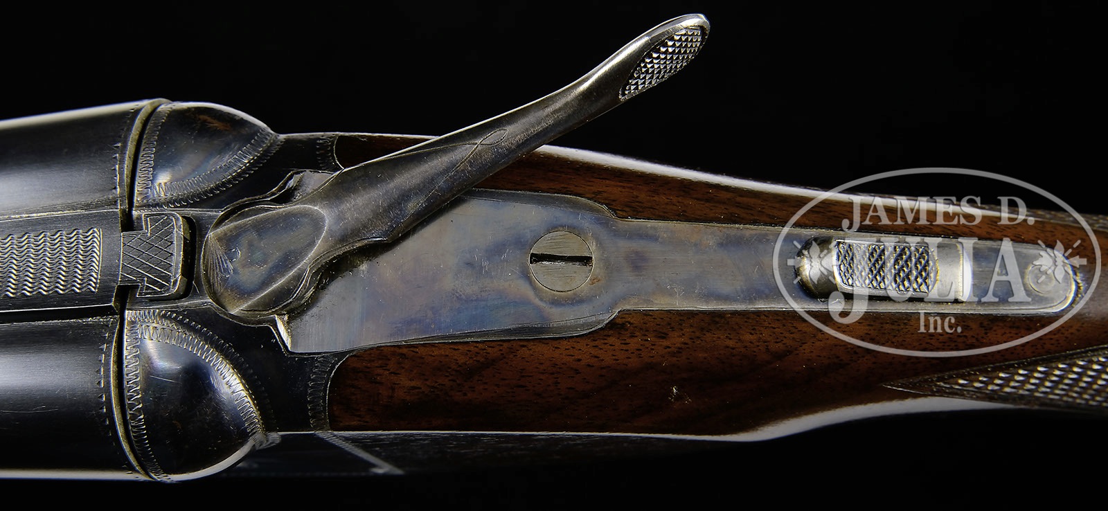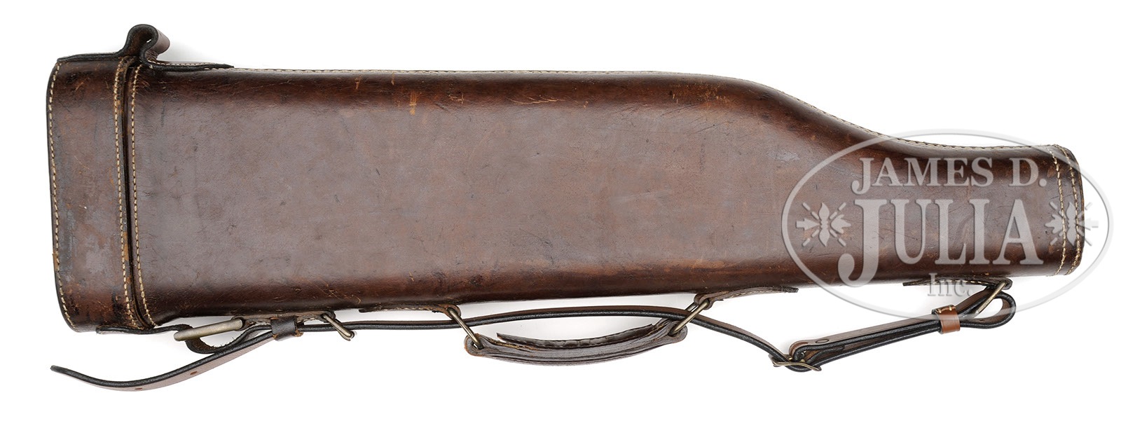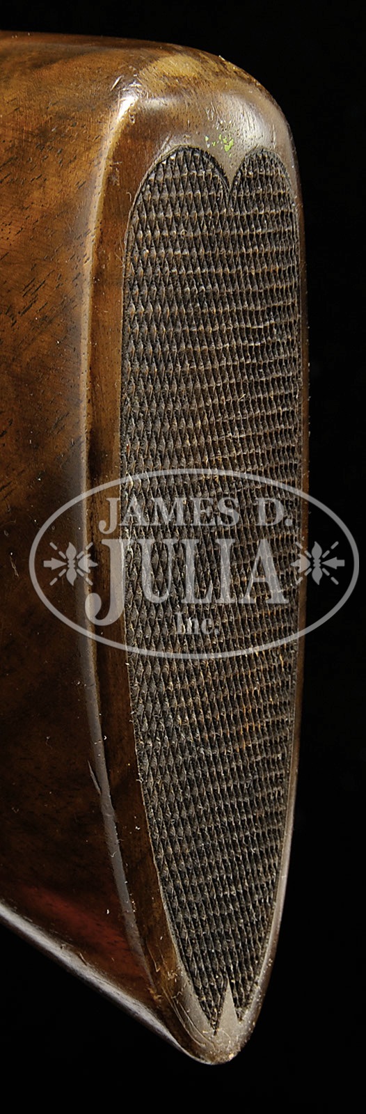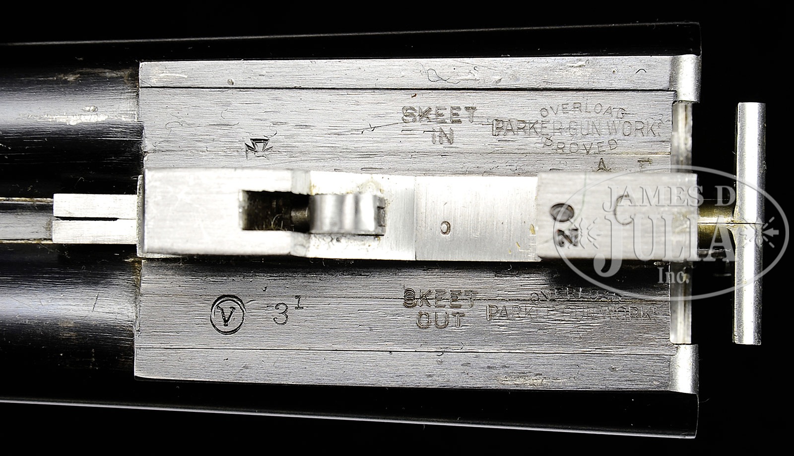 *EXCEPTIONALLY FINE HIGH ORIGINAL CONDITION PARKER 20 GAUGE VHE SKEET GUN WITH SINGLE TRIGGER AND BEAVERTAIL FOREND.SN 240350. Cal. 20 ga. 0 Frame. 2-3/4″ Chambers. 26″ Vulcan steel bbls have matted rib fitted with dual ivory beads. Bbl flats have all correct markings and proofs, and are also marked “SKEET IN” and “SKEET OUT”. Splinter is reinforced. Standard case hardened action features non-automatic safety, Parker single selective trigger, and has typical wiggle border engraving, and “PARKER” on bottom. American walnut Parker capped pistol grip buttstock shows some nice fiddle figure, and measures 14″ over checkered wood butt. Standard point pattern checkering is at grip. A vacant silver shield is on toe line. Matching long beavertail ejector forend has reinforcing bolt. Bore diameter: left-.619, right -.620. Bore restrictions: left -.008 (Skeet), right -.007 (Skeet). Minimum wall thickness: left -.026, right -.026. Drop at heel: 2-3/8″, drop at comb: 1-1/2″. Weight: 6 lbs. 10 oz. LOP: 14″. PARKER IDENTIFICATION AND SERIALIZATION ledger confirms this configuration. Heavy leather A & F leg o’ mutton case has green cloth lining. CONDITION: Exceptionally fine, retaining nearly all of its orig factory finishes on wood and metal, with a few light marks, a slight dent on rib of bbls, and a small (1/4″) spot of cleaned oxidation in front of forend. Action retains 90 – 95% orig vivid case hardening color, silvered slightly on sharp edges, around bottom, and on top lever, with a bit of flecking on and behind right fence. Trigger guard retains 70 – 80% orig blue, thinning at front of bow, silvered on edges, and flaked and silvered at grip. Stocks retain nearly all of their orig varnish, with several light marks and scratches, wearing through on edges of butt. Checkering is sharp and slightly darkening. Bores are excellent. Action is tight. Mechanically crisp. Case has had strap and hinge restoration, and is generally good. As fine an example of this important Parker variation as one could hope to find, an excellent benchmark gun. 4-50339 MGM236 (6,000-10,000) – Lot 3506