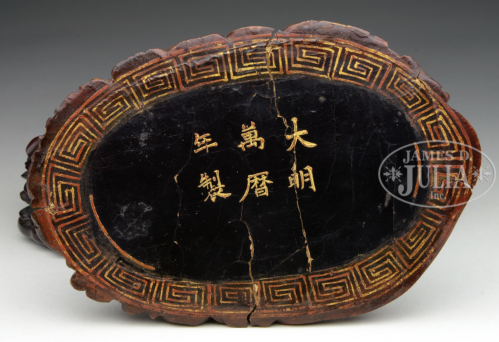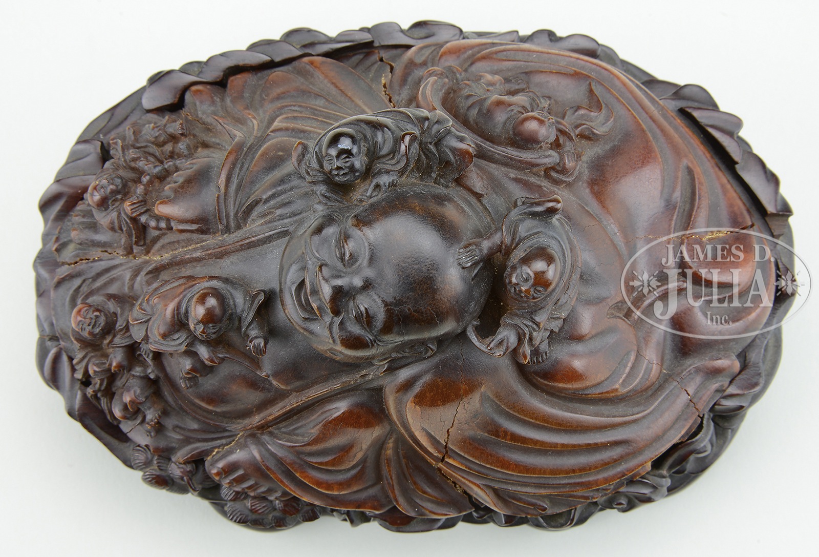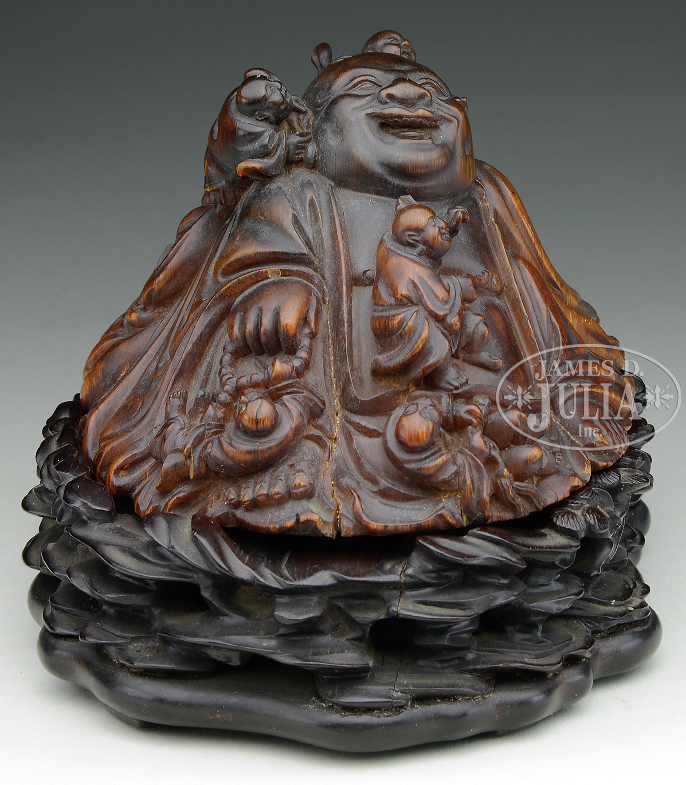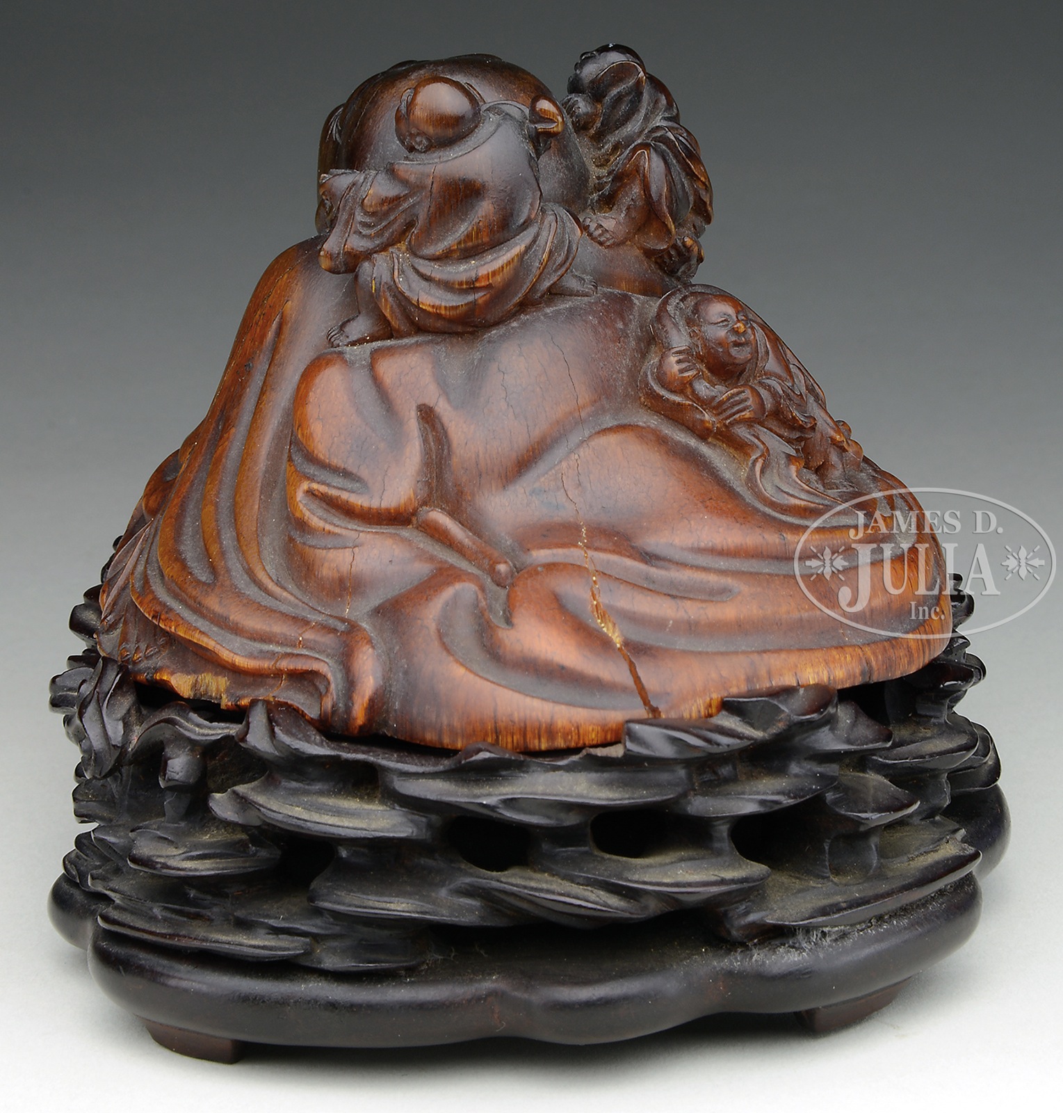 RARE AND FINELY CARVED RHINOCEROS HORN FIGURE OF BUDAI, WANLI PERIOD (1573-1620).The smiling figure well carved in the round as Budai, seated amidst the spreading, loose folds of his robes, chest and large belly left exposed, clutching a tasseled rosary in his right hand while six laughing boys clamber up his body and play with his bag, robes and ear, the base covered in black lacquer, inscribed in gilt and cinnabar-red with the reign mark within a surrounding keyfret border, the carving of dark caramel tones darkening at the core. Accompanied by carved hardwood base. NOTE: The monk Budai, also known as the Laughing Buddha, is an incarnation of the Bodhisattva Maitreya, the Buddha predicted to succeed Gautama Buddha in the future. Typically depicted with a joyful expression and wearing loose fitting robes to reveal his plump stomach seated representing contentment and abundance, Budai is also associated with the protection of children and is often shown with small children playfully climbing on his belly or back. Figural carvings from rhinoceros horn are rare but the most common depictions include Manjusri and Budai. The current carving of Budai ranks among the most impressive and elaborate depictions of the subject matter. A very closely comparable carving of Budai formerly in the Ruth Dreyfus and Arthur M. Sackler collections is illustrated by Thomas Fok, Connoisseurship of Rhinoceros Horn Carving in China, Hong Kong, 1999, p. 117 no.69, and again by J. Chapman, The Art of Rhinoceros Horn Carving in China, Hong Kong, 1999, no. 325 and was sold at Christie’s New York, 1 December 1994, lot 28. Another related example formerly in the George and Mary Bloch collection illustrated by J. Chapman, The Art of Rhinoceros Horn Carving in China, Hong Kong, 1999, no. 327, was sold at Sotheby’s Hong Kong, 23 October 2005, lot 34. SIZE: 5-7/8″ w. CONDITION: With good color and patina. Old shrinkage cracks on left, right and rear of figure. Small chip on edge of base. Otherwise good. 9-96137 (30,000-40,000) – Lot 3506
