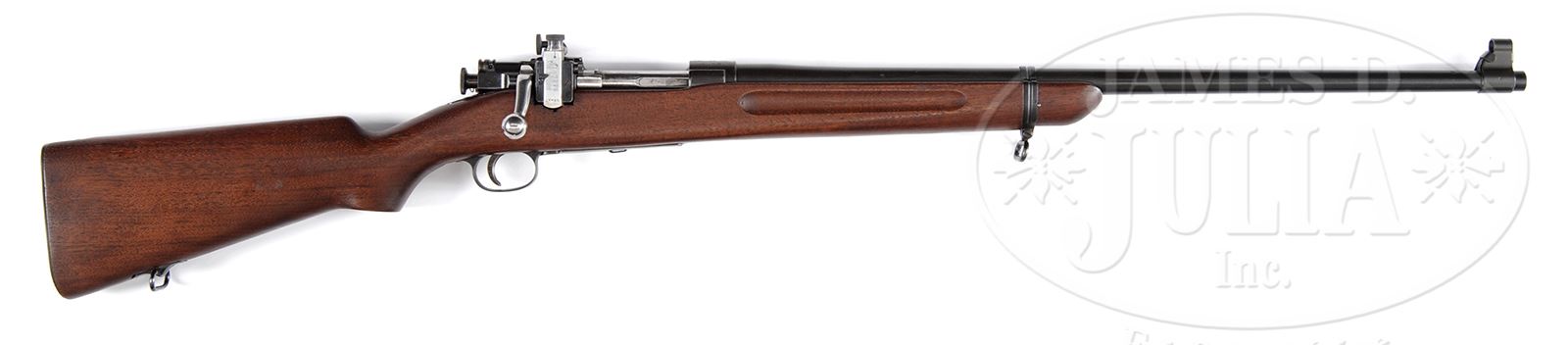 SN 6965. Cal. .22 LR. 24″ bbl, blue finish. Plain oiled walnut stock. Lyman receiver sight. Sling swivels and steel buttplate. Bolt is marked NS-M2. CONDITION: Very fine. Bbl and receiver retain 95% matte blue finish, bore is in very good condition. Bolt and bolt handle are polished bright. Bottom metal and buttplate show very good original parkerized finish. Stock shows full oil finish with very few mars and dents. This is a very nice M-2 Springfield target rifle. 49438-5 TEP C&R (2,000-3,000) – Lot 3506