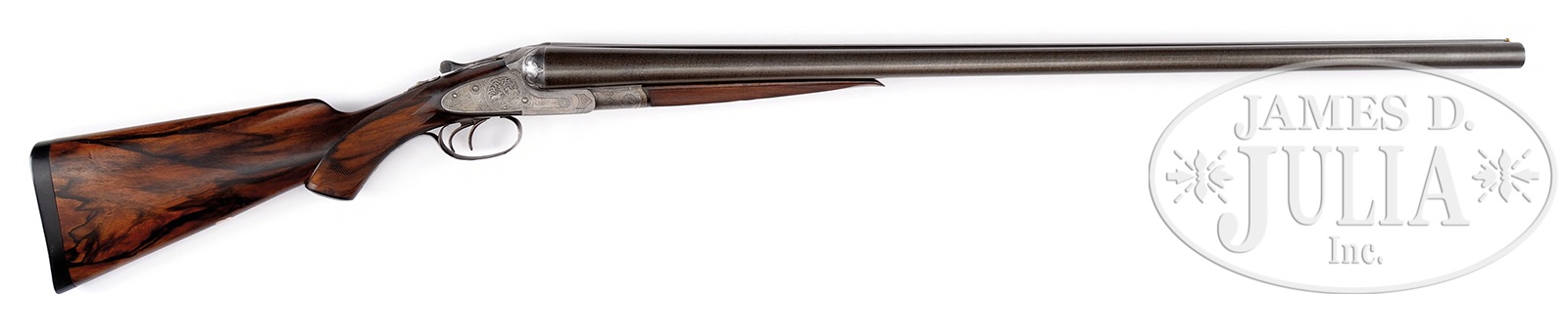 EXTREMELY RARE EARLY L.C. SMITH QUALITY 6 SHOTGUN.SN 19212. Cal. 10 ga. 32″ fine Damascus bbls with 3″ chambers. Full length matted rib with brass front bead. Tops of bbls very faintly marked “L.C. Smith Maker Syracuse N.Y.” on left tube and “Fine Damascus Steel” on right tube near breech. Stout action with SN noted on water table and bbl flats. Double checkered triggers, extractors and automatic safety. Capped full pistol grip buttstock is a very fancy English walnut with gold shield near toe and 1/2″ thick black “The L.C. Trap Gun” buttplate. Buttstock is nicely checkered in 4-pt pattern at wrist. Friction splinter forearm is near fully checkered in 4-pt pattern with double diamond type ebony center and tear drop ebony tip. Sidelocks are beautifully engraved most likely by Spangler with setter in large circle on left, pair of pointers in marsh scene in circle on right, surrounded by light scroll and marked “L.C. Smith” at front of side blocks. Bbl bolsters are fabulously sculpted in fleur-de-lis pattern. Bottom of action is lightly engraved with sculpted butterfly rails and floral and light geometric pattern. Trigger guard with beautiful scene of setter in woods on bow and SN noted at tang in geometric design. Housed in modern canvas case with old bore brush. Bore diameter: left – .084, right – .797. Bore restrictions: left – .022 (mod), right – .023 (mod). Minimum wall thickness: left – .040, right – .039. Weight: 10 lbs. 4 oz. Drop at comb: 1-5/8″, drop at heel: 3-1/8″. LOP: 14″. CONDITION: Excellent as restored. Bbls retain nearly all of an excellent professional quality restoration and show great pattern which is bold and vivid. Bores with some pits and roughness throughout. Receiver is very good with scattered staining and light oxidation. No orig case color remains, however engraving still mostly clear and present, particularly beautiful are the game scenes on the side blocks. Buttstock & forearm are excellent as professionally restored. Checkering is crisp. Buttplate is still legible, though worn. Lever is slightly left of center. Case is very good as is cleaning rod. This is an extremely rare gun. 50933-1 JSL (10,000-15,000) – Lot 3506