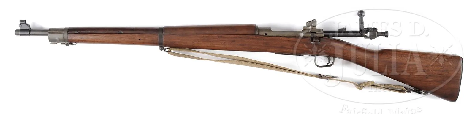 *SMITH CORONA US MODEL 03-A3 BOLT ACTION RIFLE WITH SLING.SN 4717734. Cal. .30-06. 24″ bbl, parkerized finish with blue bolt. Oiled walnut stock and hand guard. Canvas sling. “FJA” cartouche on left side along with ordnance proof, circle “P” behind trigger guard and various small proofs in front of trigger guard. Bbl is marked at the muzzle “SC 6-43”. CONDITION: Fine, rifle retains virtually all original parkerized finish on bbl. Bore is very good. A nice example of a WWII 03-A3. 49438-7 TEP C&R (1,000-2,000) – Lot 3507